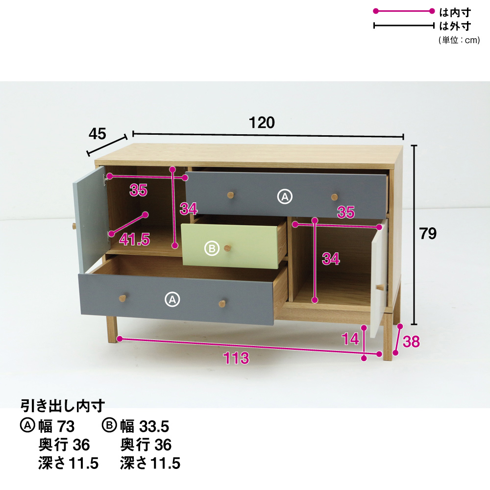 大きな引き出しには底面付けのセルフクローズレールを使用しているので、重たい食器類もスムーズに引き出すことができます。引き出し大内寸:幅73×奥行36×高さ11.5cm、耐荷重約5kg。