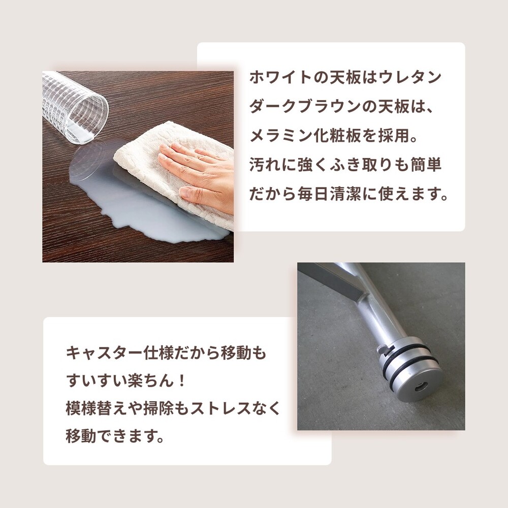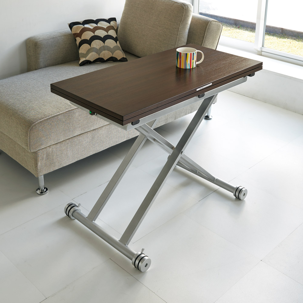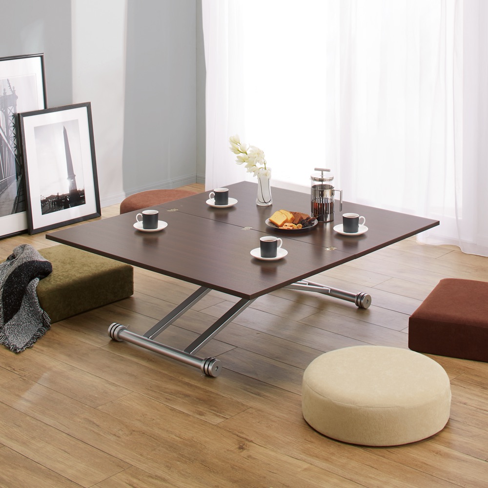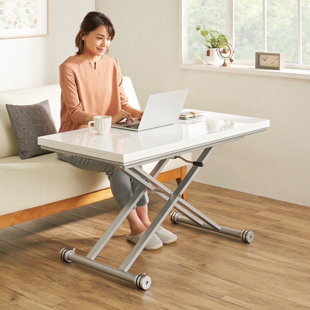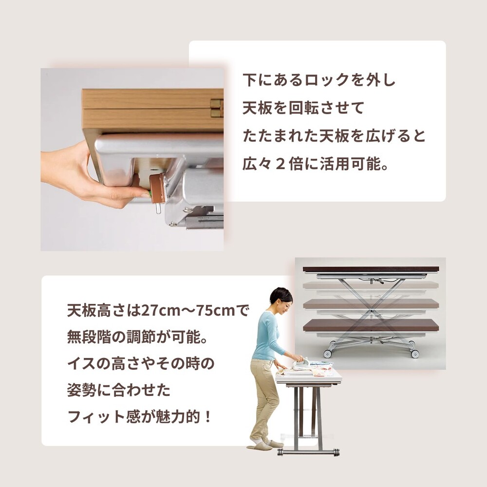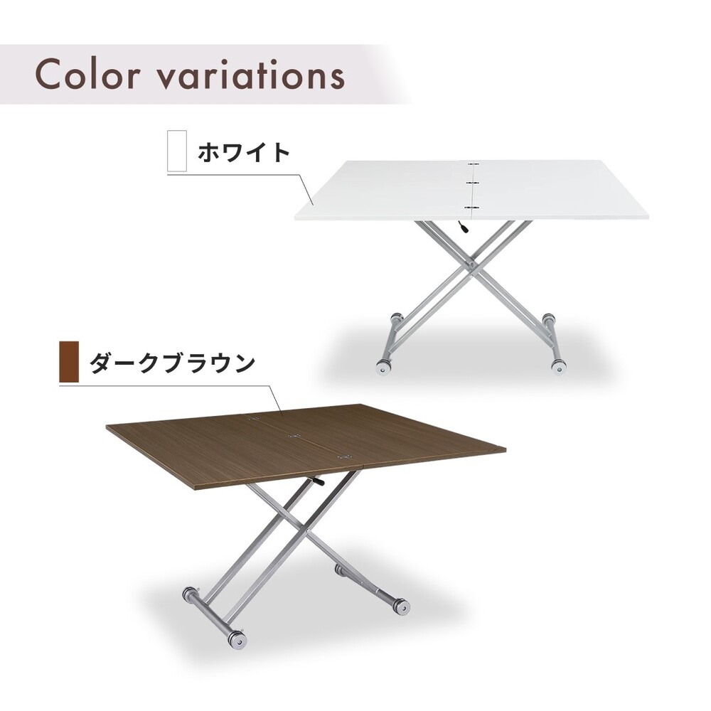 在宅勤務、テレワークにもおすすめの昇降式テーブル。場面に合わせて伸長・昇降できるフレキシブルなマルチファンクションテーブル。一人の時はコンパクトに、人数が増えたら天板を広げて。ダイニングテーブルやパソコンデスク、アイロン作業として幅広く活躍します。大きさ・高さが自在に変化するテーブルは個人の趣味から家族での団らん、普段の食事からお客様が集まるホームパーティーまで。あらゆる時と場面にフィットする優れものです。シンプルですっきりとしたフォルムとベーシックな色展開でどんなインテリアにもしっくり馴染みます。ソファ前のリビングテーブル・センターテーブルとしてだけでなく、ダイニングテーブル・パソコンデスク・ワークテーブル(作業台)として、1台で多機能に使用することができます。[point01] 簡単3ステップで天板サイズが2倍に!一人のときはコンパクトに。お友達が来た時にはさっと広げて大きく。天板を広げるには、下にあるロックを外し天板を回転させてたたまれた天板を広げるだけ。たたんだ状態での天板サイズは110cm×60cm。大体ですがリビングテーブルの一般的な大きさ。天板を広げると120cm×110cmの6〜8人ほどでも使える大きなテーブルに。大きく広げればホームパーティや親戚での集まりにぴったり。[point02] 状況に合わせて。高さ無段階調節。天板高さは27cm〜75cmで無段階の調節が可能。座椅子やクッションと合わせて低めに、パソコン作業のためにスツールに合わせて高く、アイロンかけをするので立った時の高さに合わせて…。無段階調節だからこそできるイスやその時の姿勢に合わせたフィット感はリフティングテーブルならではの魅力です。[point03] 毎日使うものだからこそ、お手入れしやす清潔に(ア)ホワイトの天板はウレタン塗装を施し、汚れに強くふき取りも簡単な塗装を施しました。ウレタン塗装はダイニングテーブルにも一般的に用いられる塗装です。(イ)ダークブラウンは表面材にメラミン化粧板を採用しました。こちらも汚に強くありながら、かつ木目調の高級感を持つ素材です。メラミン樹脂化粧板は家具から建材まで幅広く使用されています。[point04] 組立不要の楽々完成品商品は完成品でのお届けになりますので箱から出してすぐに設置、ご使用いただけます。〜お客様から続々と口コミが届いています〜●このテーブルの良さは、なんといっても、好みの高さに調整できるという事と、天板を広げることにより、急な来客にも対応できるということです。デザインと機能にもたけていて、来客の中には、このテーブルいいという言葉も少なくありません(大阪府) ●引っ越しの際新たにリビングに置くテーブルが必要になった為購入。部屋の広さプラス秋に初めての子供を出産予定の為、普段使いのソファテーブル兼ダイニングテーブルの使用を見込んでいましたが、想像以上の出来。家に来た人たちが驚いていました。 (大阪府) ●なかなかよいです。高さを調節することでソファーに座って食事できるようになりたまの友人を呼んだときのランチなどに活用しています。 (東京都)