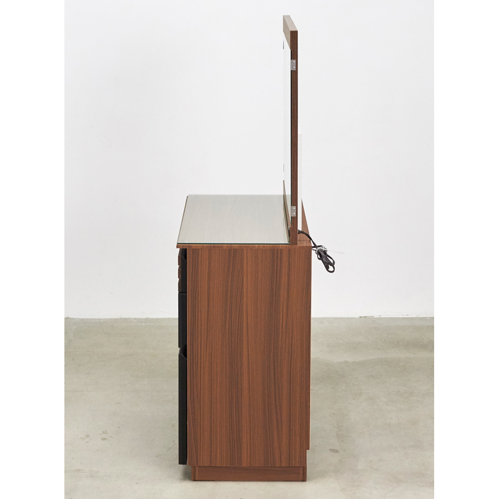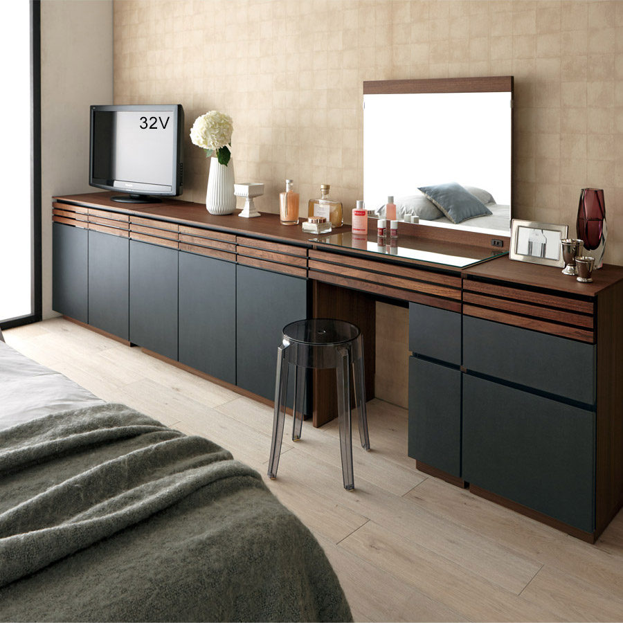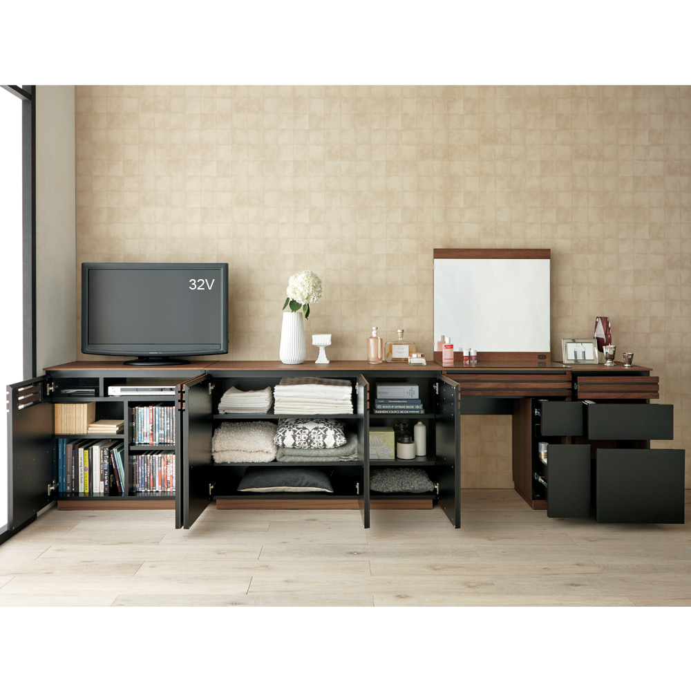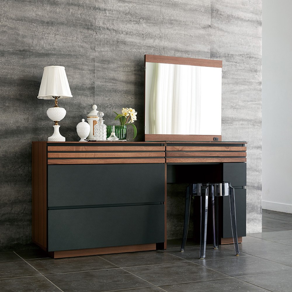 ウォルナット無垢材の格子と黒革調の組合せでさりげない個性が際立ちます。ヨーロッパでも人気の異素材ミックスを、日本の暮しに取り入れやすく設計したディノス・ハウススタイリングのオリジナルシリーズ。お手入れ簡単な天板・コンセントなどの本格的な機能性がポイント。さりげない個性が光る異素材ミックスでトータルコーディネートできるロングセラーのオリジナルシリーズ昨今ヨーロッパを中心にインテリアのトレンド・異素材ミックス。ディノス・ハウススタイリングではいち早くトレンドを取り入れ、日本の住宅でも使いやすいよう設計しました。世界三大銘木に数えられるウォルナットの無垢材を使い、厚みのある格子状に。ブラックレザーのシボ感をリアルに再現した表面材を合わせる事で、大人のシックな格調高いインテリアを簡単に実現できるシリーズ。日本の住宅に合わせて海外輸入ブランドに比べてコンパクトなサイズ感に仕上げ、収納部の大きさなども日本の一般的な収納物を参考に設計しています。トータルコーディネートできるように、奥行や高さを揃えたバリエーションを豊富に展開し、それぞれのご自宅に合った組合せが可能です。特徴的な質感ながら扱いやすい素材が魅力■レザー調の表面材は、リアルな質感を表現したオレフィン材を採用しました。■オレフィンは樹脂製の表面材。今回のレザー風の物ではなく、木目柄の物が普段多く流通しています。■オレフィン材は作り付けの家のドアや、一般的な家具に使用されている身近な素材です。■革のような見た目を表現しつつ、一般的な家具と同じようにお取り扱い頂ける便利さが魅力です。使いやすさにもこだわった機能性■ドライヤーなどの家電機器の使用に便利な1口コンセント(1500W)付き。■天板にはマニュキュアや除光液の液だれがあってもふき取りが簡単な5mm厚強化ガラス付き。■引き出しには開閉しやすいフルスライドレール。深引出には背の高い化粧品やスプレーなどのボトル類も収納できます。■背面は幅木カット仕様で壁にぴったり設置可能です。面倒な組み立てのいらない半完成商品■ミラーを取り付けるだけの簡単な作業のみです。