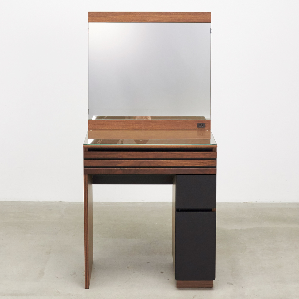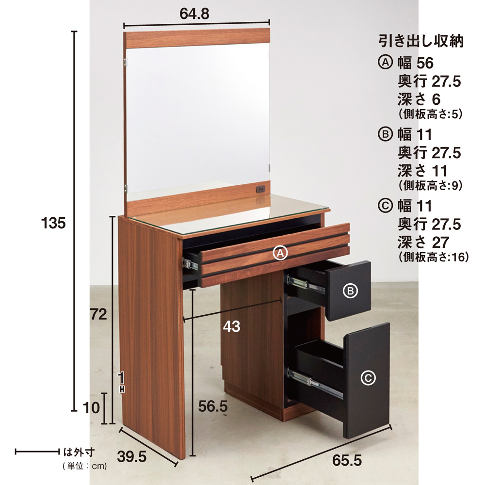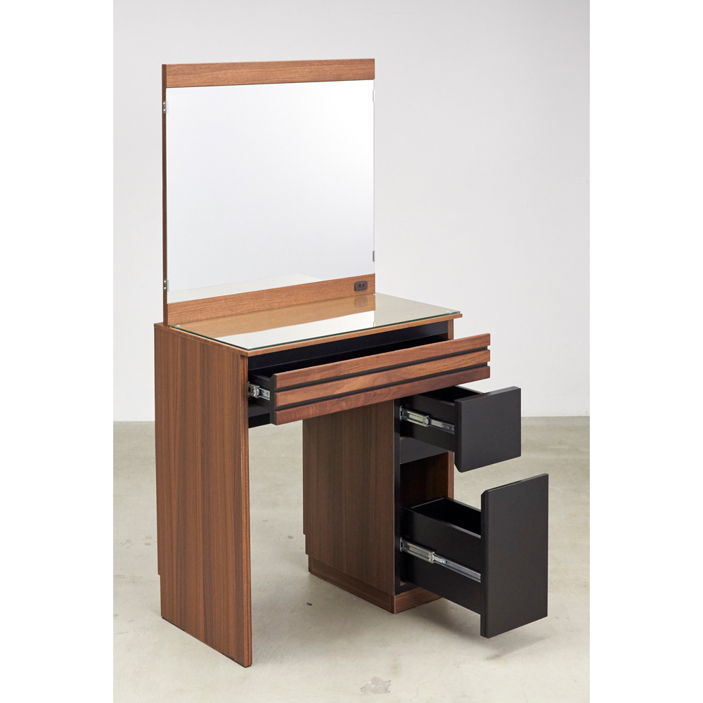 ウォルナット無垢材の格子と黒革調の組合せでさりげない個性が際立ちます。ヨーロッパでも人気の異素材ミックスを、日本の暮しに取り入れやすく設計したディノス・ハウススタイリングのオリジナルシリーズ。お手入れ簡単な天板・コンセントなどの本格的な機能性がポイント。さりげない個性が光る異素材ミックスでトータルコーディネートできるロングセラーのオリジナルシリーズ昨今ヨーロッパを中心にインテリアのトレンド・異素材ミックス。ディノス・ハウススタイリングではいち早くトレンドを取り入れ、日本の住宅でも使いやすいよう設計しました。世界三大銘木に数えられるウォルナットの無垢材を使い、厚みのある格子状に。ブラックレザーのシボ感をリアルに再現した表面材を合わせる事で、大人のシックな格調高いインテリアを簡単に実現できるシリーズ。日本の住宅に合わせて海外輸入ブランドに比べてコンパクトなサイズ感に仕上げ、収納部の大きさなども日本の一般的な収納物を参考に設計しています。トータルコーディネートできるように、奥行や高さを揃えたバリエーションを豊富に展開し、それぞれのご自宅に合った組合せが可能です。特徴的な質感ながら扱いやすい素材が魅力■レザー調の表面材は、リアルな質感を表現したオレフィン材を採用しました。■オレフィンは樹脂製の表面材。今回のレザー風の物ではなく、木目柄の物が普段多く流通しています。■オレフィン材は作り付けの家のドアや、一般的な家具に使用されている身近な素材です。■革のような見た目を表現しつつ、一般的な家具と同じようにお取り扱い頂ける便利さが魅力です。使いやすさにもこだわった機能性■ドライヤーなどの家電機器の使用に便利な1口コンセント(1500W)付き。■天板にはマニュキュアや除光液の液だれがあってもふき取りが簡単な5mm厚強化ガラス付き。■引き出しには開閉しやすいフルスライドレール。深引出には背の高い化粧品やスプレーなどのボトル類も収納できます。■背面は幅木カット仕様で壁にぴったり設置可能です。面倒な組み立てのいらない半完成商品■ミラーを取り付けるだけの簡単な作業のみです。