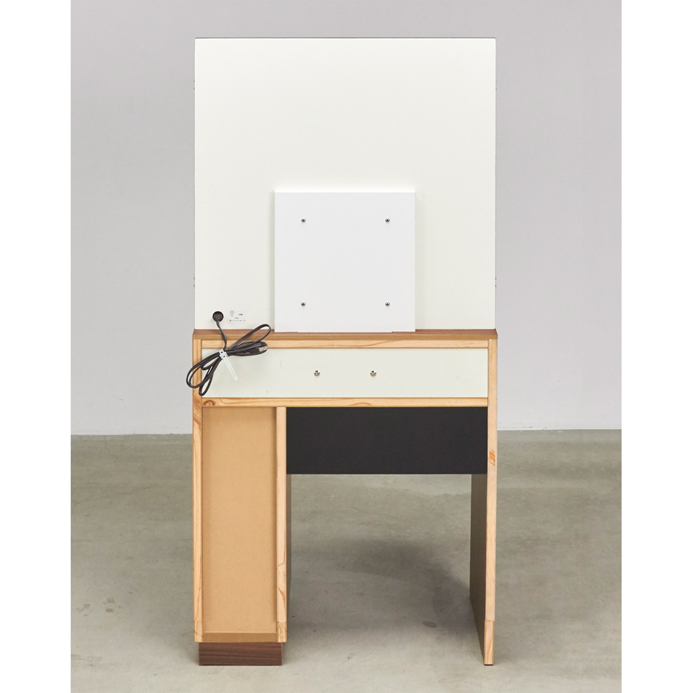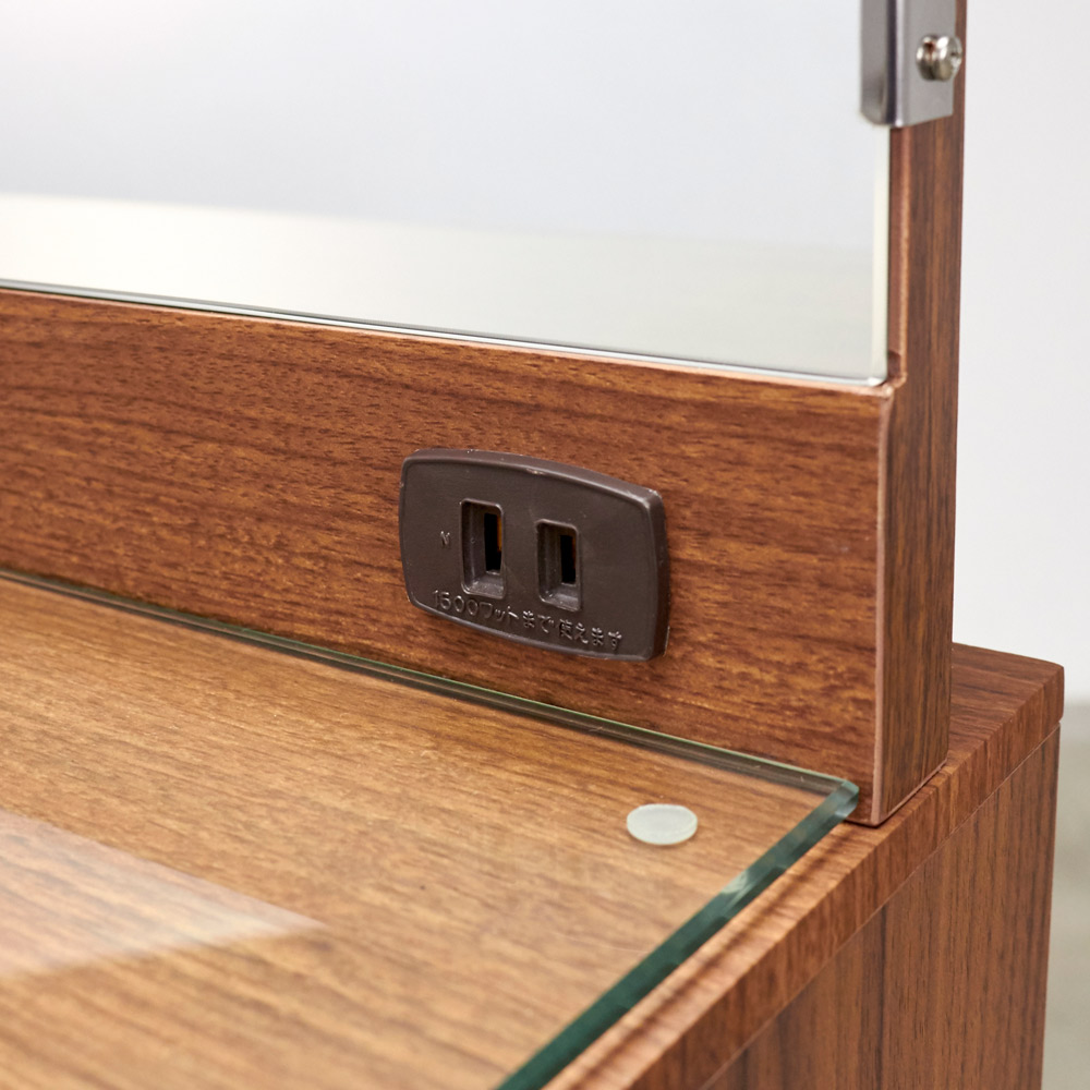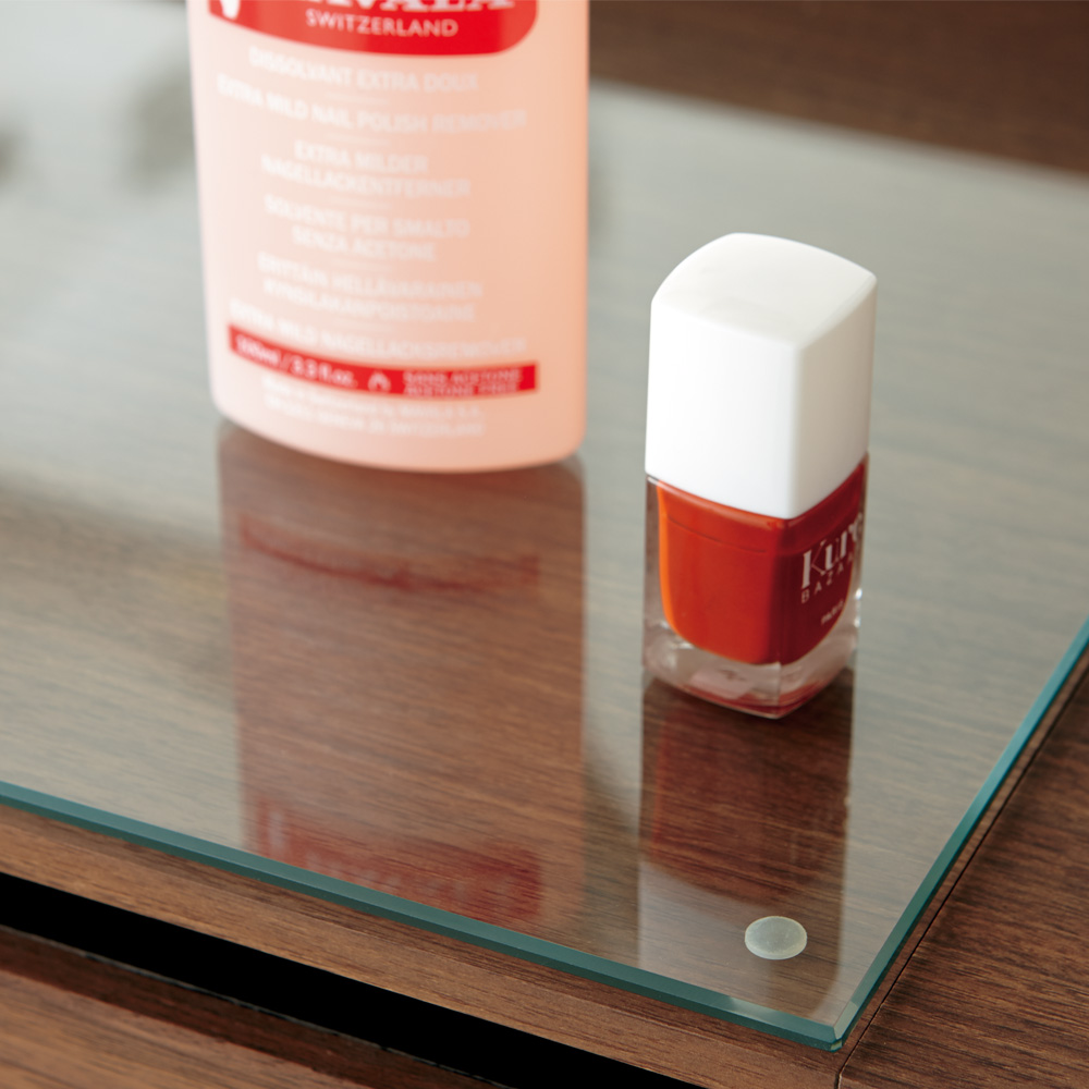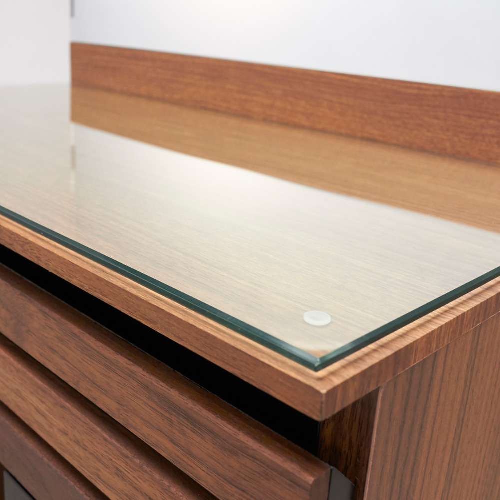 天板には強化ガラスをセット。化粧品などをこぼしてもすぐにきれいに。清潔さを保ちます。