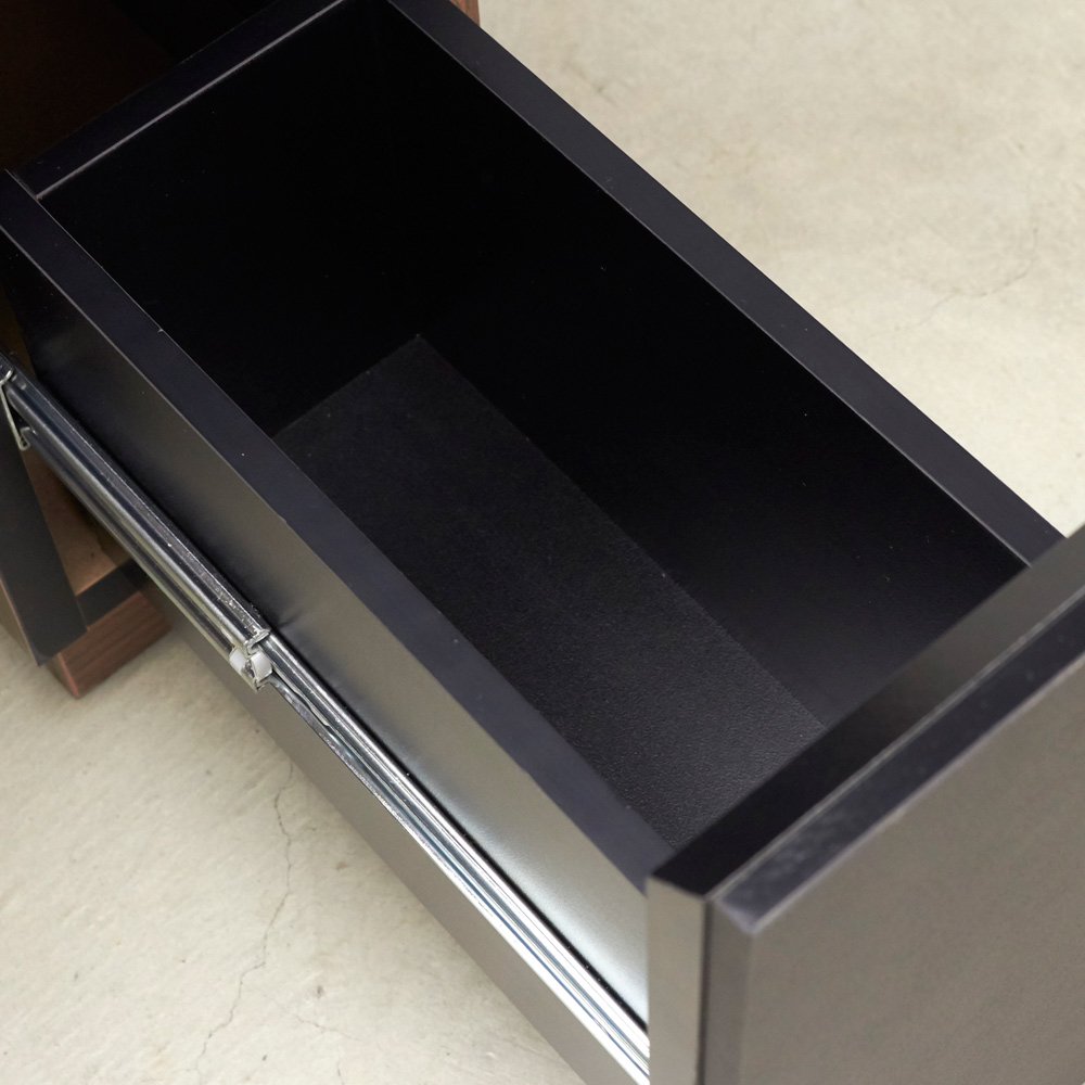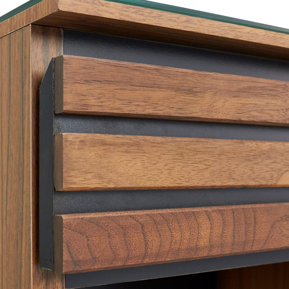引き出し前面に高級感あるウォルナット無垢材とレザー調の表面材を組み合わせたデザイン