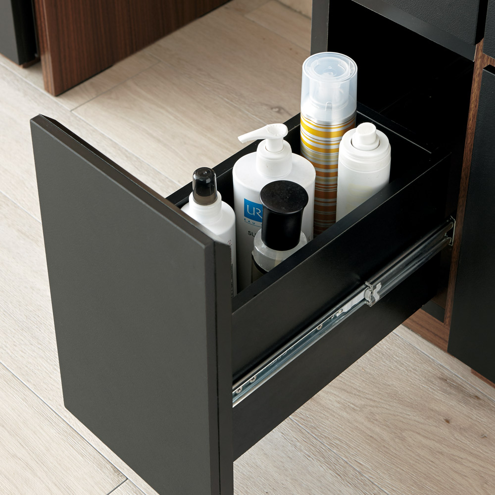 深引き出しには、背の高い化粧品のボトル類も収まります。ストックがあっても安心。