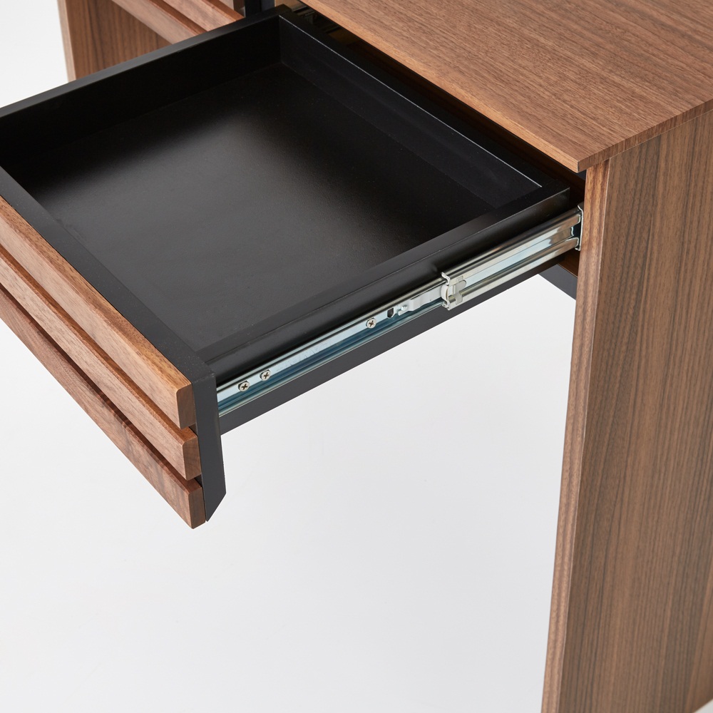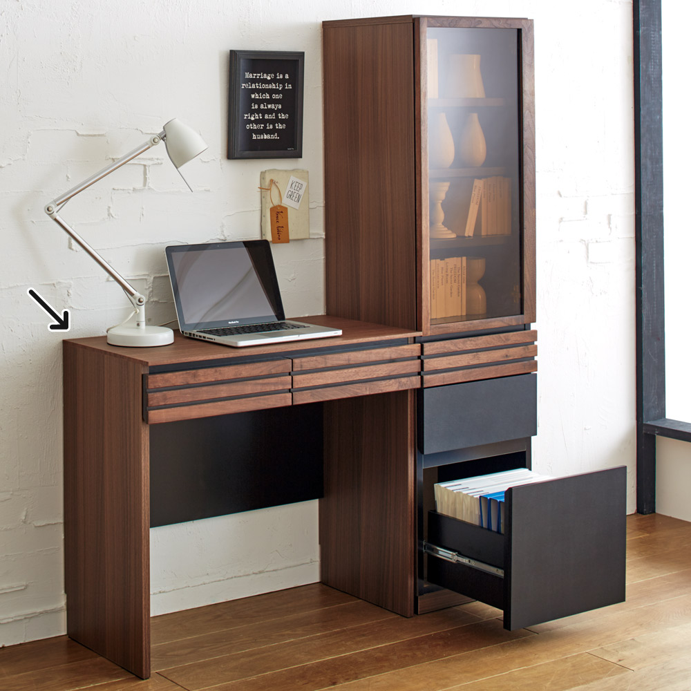 ウォルナット無垢材の格子と黒革調の組合せでさりげない個性が際立ちます。ヨーロッパでも人気の異素材ミックスを、日本の暮しに取り入れやすく設計したディノス・ハウススタイリングのオリジナルシリーズ。奥行きが浅く、書斎にもリビングにも設置しやすいサイズ感が魅力。さりげない個性が光る異素材ミックスでトータルコーディネートできるロングセラーのオリジナルシリーズ昨今ヨーロッパを中心にインテリアのトレンド・異素材ミックス。ディノス・ハウススタイリングではいち早くトレンドを取り入れ、日本の住宅でも使いやすいよう設計しました。世界三大銘木に数えられるウォルナットの無垢材を使い、厚みのある格子状に。ブラックレザーのシボ感をリアルに再現した表面材を合わせる事で、大人のシックな格調高いインテリアを簡単に実現できるシリーズ。日本の住宅に合わせて海外輸入ブランドに比べてコンパクトなサイズ感に仕上げ、収納部の大きさなども日本の一般的な収納物を参考に設計しています。トータルコーディネートできるように、奥行や高さを揃えたバリエーションを豊富に展開し、それぞれのご自宅に合った組合せが可能です。特徴的な質感ながら扱いやすい素材が魅力■レザー調の表面材は、リアルな質感を表現したオレフィン材を採用しました。■オレフィンは樹脂製の表面材。今回のレザー風の物ではなく、木目柄の物が普段多く流通しています。■オレフィン材は作り付けの家のドアや、一般的な家具に使用されている身近な素材です。■革のような見た目を表現しつつ、一般的な家具と同じようにお取り扱い頂ける便利さが魅力です。スリムなサイズ感で書斎は勿論、リビングのワークスペースにも■奥行きは約39cmのコンパクトサイズ。■A4ノートパソコンなどを使用する際にちょうどいい奥行。■リビングルームの一角を、お仕事や勉強をする場所にしたいときにも無理なく設置できます。コンパクトでも高い機能性で本格的なお仕事スペースに■引き出しには、全段ストッパー付きスライドレールを採用。■引き出し内部もシックなブラックで仕上げました。見た目に美しいだけでなく、汚れにくく手入れもしやすくこだわりました。■巾木カット付きで、壁にぴったりと寄せて設置できます。面倒な組み立てのいらない完成商品■組み立て不要の完成品でお届けします。
