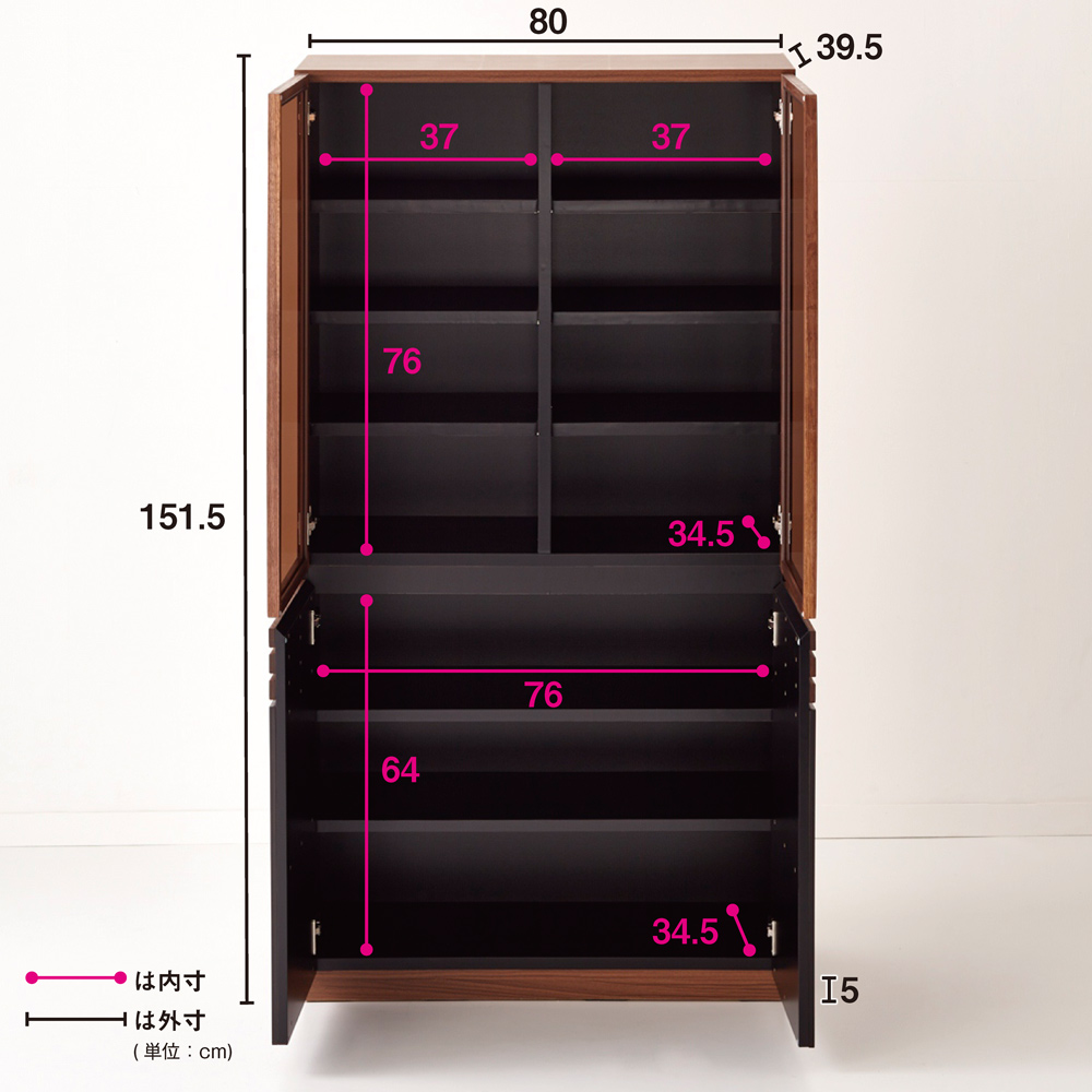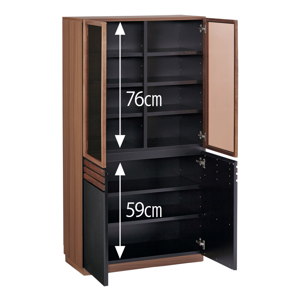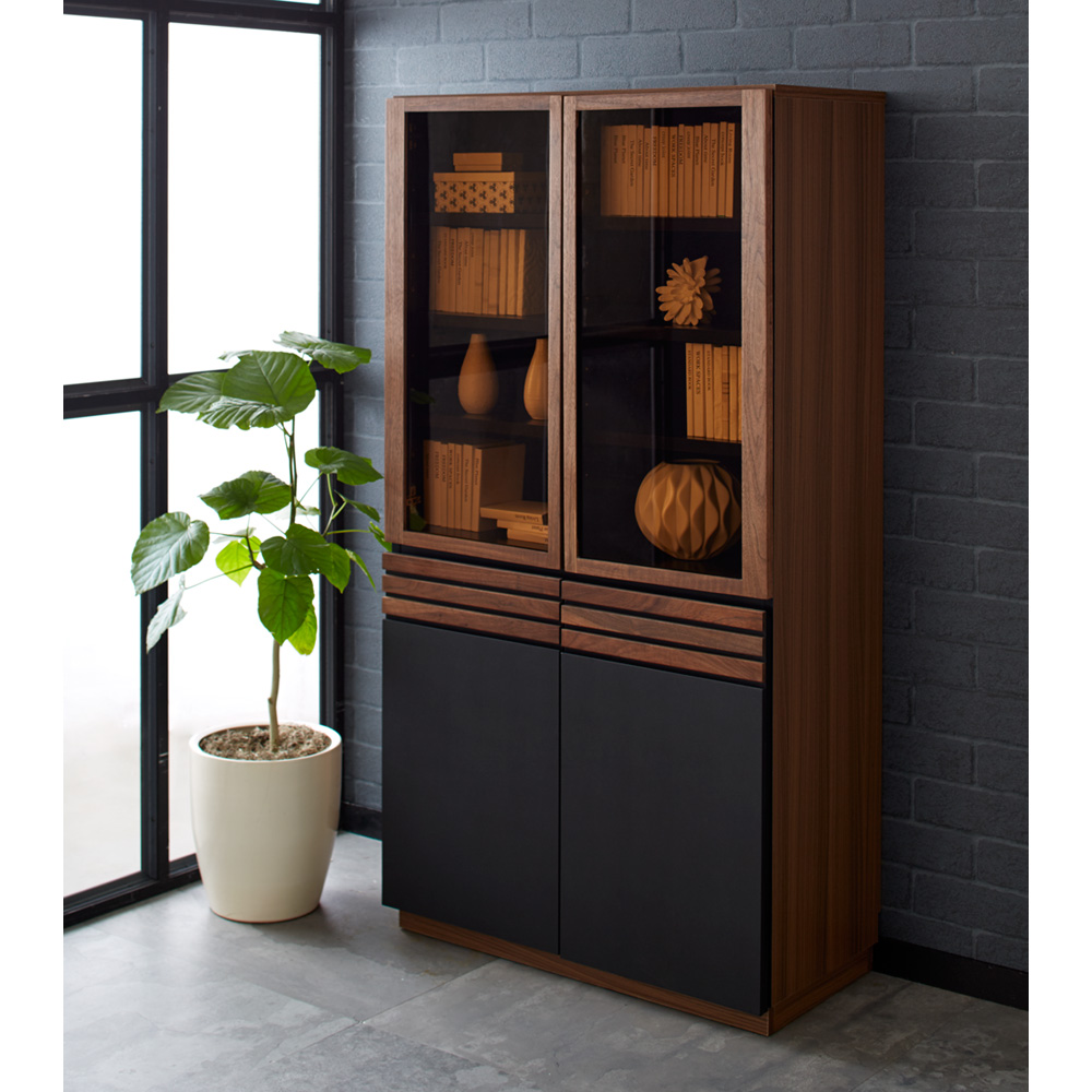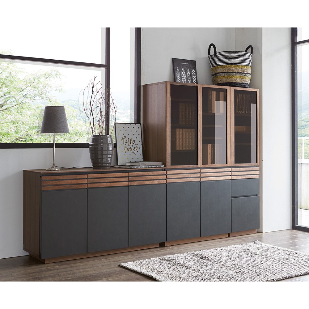 ウォルナット無垢材の格子と黒革調の組合せでさりげない個性が際立ちます。ヨーロッパでも人気の異素材ミックスを、日本の暮しに取り入れやすく設計したディノス・ハウススタイリングのオリジナルシリーズ。高さが控えめで圧迫感を感じさせないサイズ感が魅力の書棚。さりげない個性が光る異素材ミックスでトータルコーディネートできるロングセラーのオリジナルシリーズ昨今ヨーロッパを中心にインテリアのトレンド・異素材ミックス。ディノス・ハウススタイリングではいち早くトレンドを取り入れ、日本の住宅でも使いやすいよう設計しました。世界三大銘木に数えられるウォルナットの無垢材を使い、厚みのある格子状に。ブラックレザーのシボ感をリアルに再現した表面材を合わせる事で、大人のシックな格調高いインテリアを簡単に実現できるシリーズ。日本の住宅に合わせて海外輸入ブランドに比べてコンパクトなサイズ感に仕上げ、収納部の大きさなども日本の一般的な収納物を参考に設計しています。トータルコーディネートできるように、奥行や高さを揃えたバリエーションを豊富に展開し、それぞれのご自宅に合った組合せが可能です。特徴的な質感ながら扱いやすい素材が魅力■レザー調の表面材は、リアルな質感を表現したオレフィン材を採用しました。■オレフィンは樹脂製の表面材。今回のレザー風の物ではなく、木目柄の物が普段多く流通しています。■オレフィン材は作り付けの家のドアや、一般的な家具に使用されている身近な素材です。■革のような見た目を表現しつつ、一般的な家具と同じようにお取り扱い頂ける便利さが魅力です。プラスするだけでぐっと便利になる名脇役。高い機能性とシックなデザインがポイント■アンバー系のガラスを採用し、落ち着いた雰囲気に。■中身を見せつつも色味を調えてくれるので、収納物をコーディネートしなくても見栄え良くまとまります。■背面は幅木を避けられるようにカットされ、壁にぴったり設置できます。■単品でお酒のボトルやグラス、お皿などのコレクションボード・飾り棚としても。面倒な組み立てのいらない完成商品■組み立て不要の完成品でお届けします。