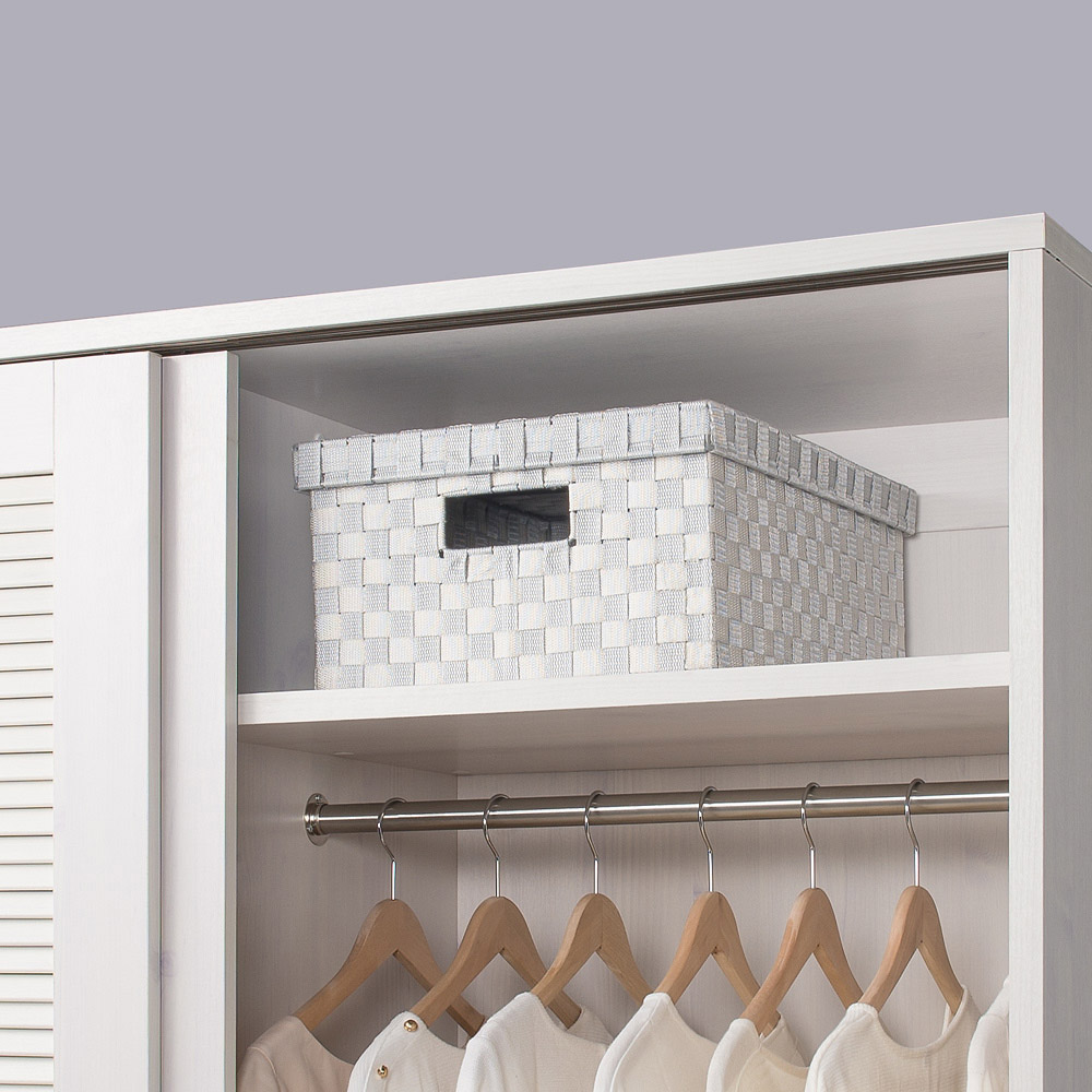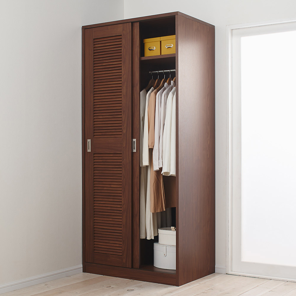 湿気がこもりにくいルーバー扉の衣類に優しい収納クローゼットです。開閉に場所を取らない引き戸式だから寝室や納戸、ウォークインクローゼットなど狭い場所でも手軽にワードローブが作れます。まるで作り付け家具のような大容量引き戸クローゼット●お部屋に大容量の衣類収納空間を作り出す、ルーバー引き戸クローゼット。●清潔感があり、お部屋に広がりを持たせるホワイトと、シックで高級感のあるダークブラウンの2色からお選びいただけます。●高さが200cmあるので衣類だけでなく、かさばる雑貨などもまとめて収納することが可能です。●幅120奥行59高さ200cmの商品です。衣類収納にもピッタリのルーバー扉●扉の前板には通気性にも優れたルーバー扉を採用。●ルーバー一枚一枚から空気を通し、内部を隠しながらホコリも防ぎます。●引き戸タイプなので扉の開閉スペースもとらず、省スペースにお使いいただくことが可能です。細部にわたるこだわりのポイント●ハンガーバーには強度のある径の太いタイプを採用。衣類の重みをしっかり支えます。●引き戸は戸車付きなので、開閉もストレスなくスムーズ。●壁と本体をしっかり固定できる転倒防止金具付きなので、安全面も安心です。