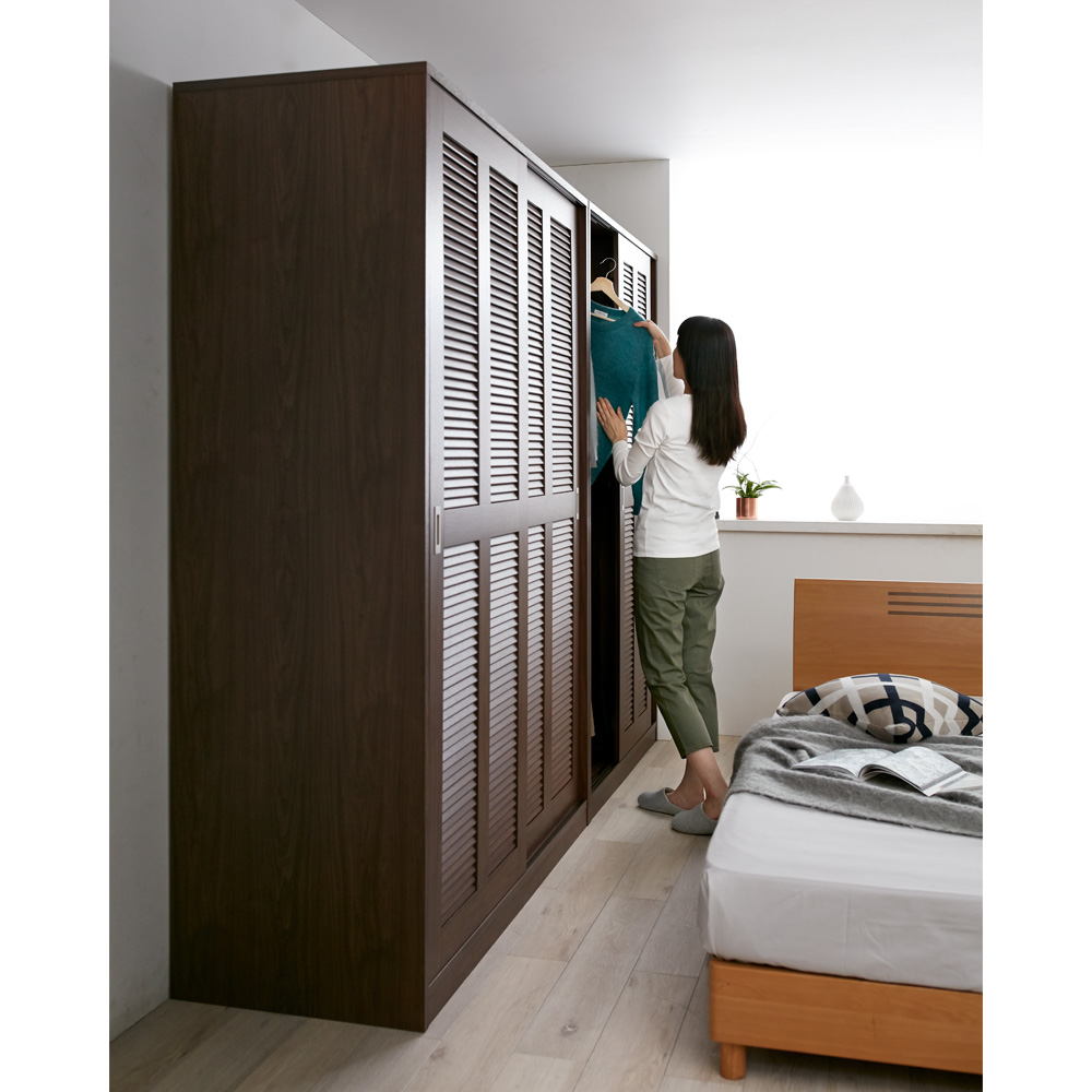 湿気がこもりにくいルーバー扉の衣類に優しい収納クローゼットです。開閉に場所を取らない引き戸式だから寝室や納戸、ウォークインクローゼットなど狭い場所でも手軽にワードローブが作れます。まるで作り付け家具のような大容量引き戸クローゼット●お部屋に大容量の衣類収納空間を作り出す、ルーバー引き戸クローゼット。●清潔感があり、お部屋に広がりを持たせるホワイトと、シックで高級感のあるダークブラウンの2色からお選びいただけます。●高さが200cmあるので衣類だけでなく、かさばる雑貨などもまとめて収納することが可能です。●幅120奥行59高さ200cmの商品です。衣類収納にもピッタリのルーバー扉●扉の前板には通気性にも優れたルーバー扉を採用。●ルーバー一枚一枚から空気を通し、内部を隠しながらホコリも防ぎます。●引き戸タイプなので扉の開閉スペースもとらず、省スペースにお使いいただくことが可能です。細部にわたるこだわりのポイント●ハンガーバーには強度のある径の太いタイプを採用。衣類の重みをしっかり支えます。●引き戸は戸車付きなので、開閉もストレスなくスムーズ。●壁と本体をしっかり固定できる転倒防止金具付きなので、安全面も安心です。