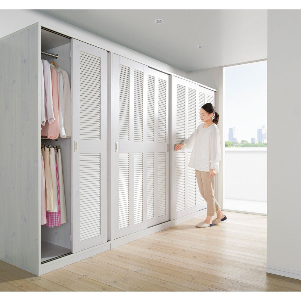 風通しの良いルーバー扉。通気性に優れるルーバーは、内部に湿気や臭いがこもりにくく、衣類を清潔に保ちます。 ※写真左から(ア)ホワイト(イ)ダークブラウン