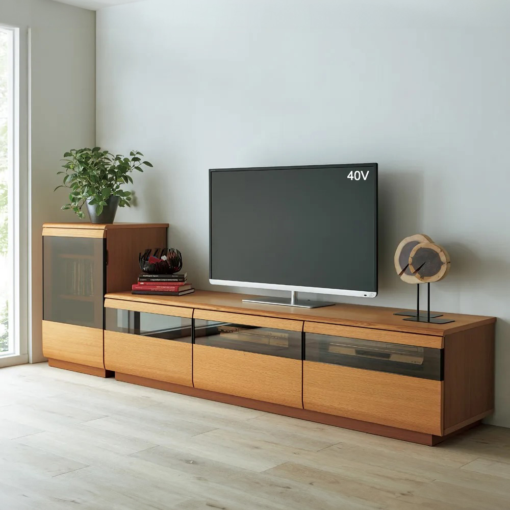 丸みを帯びた美しいフォルムと、オーク材の端正な木目が調和し、美しく確かな存在感を醸しだすテレビ台シリーズ。高級感のあるアールデザインで、デザイナーズマンションのような垢抜けた空間へ。あたたかみのある天然木にRデザインでお部屋に優しい空間を●しっかりとした台輪部、天板に丸みを持たせたデザインなど、安定感のあるフォルムが魅力。●オーク材の端正な風合いが上質な空間に溶け込みます。●デッキ部分はブロンズガラスを使用し、閉じたままでリモコンを使用できます。●角がないアールのデザインは、美しいだけでなく、お子様のいるご家庭でも安心してご利用いただけます。