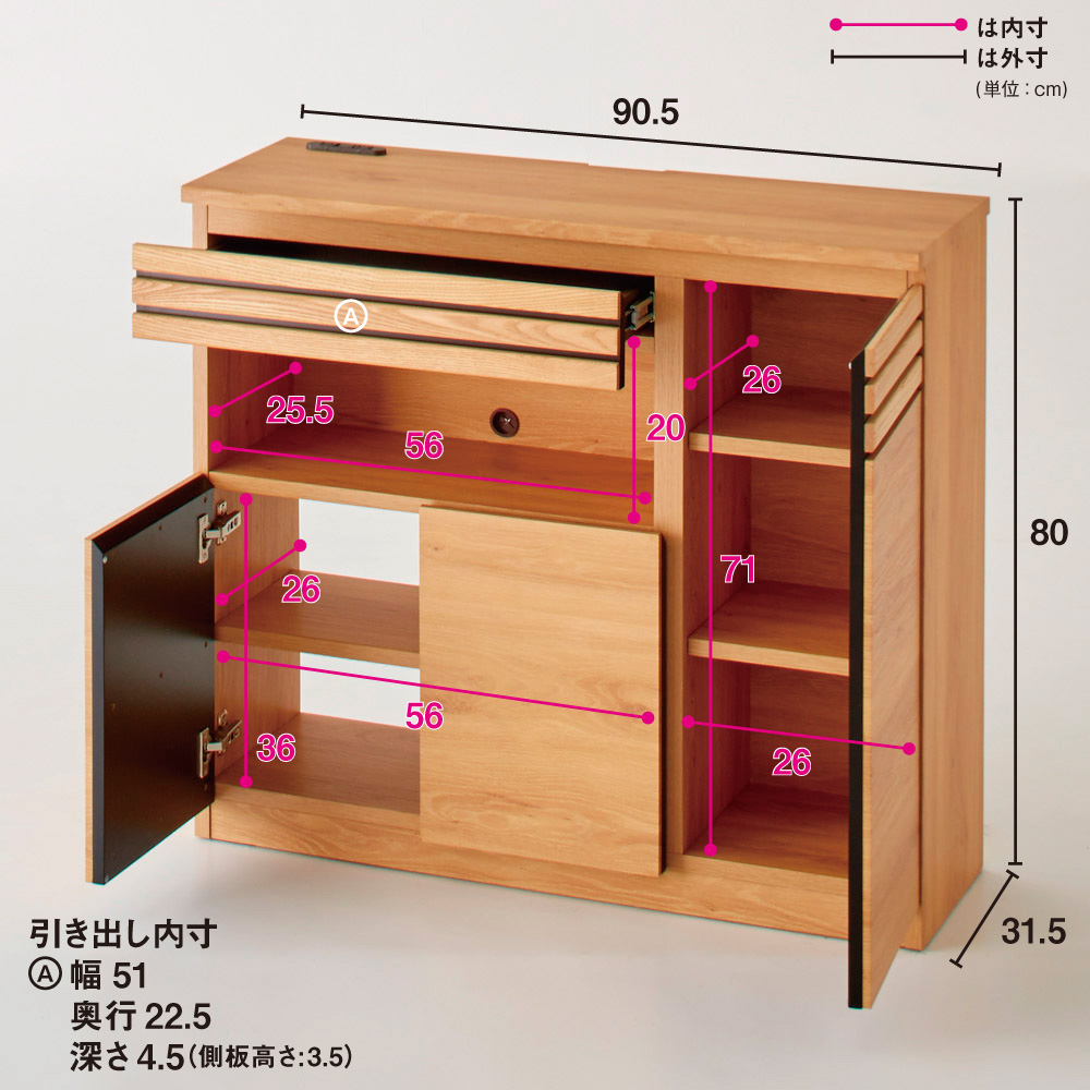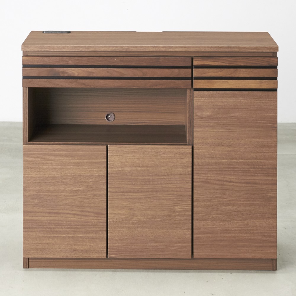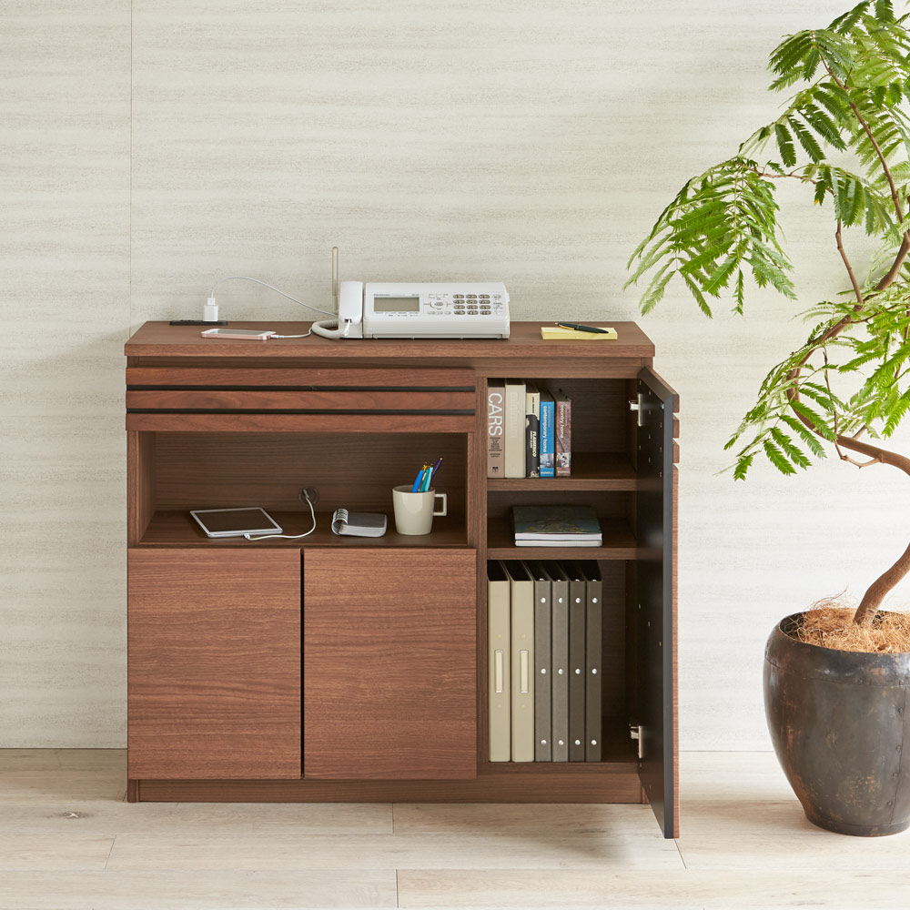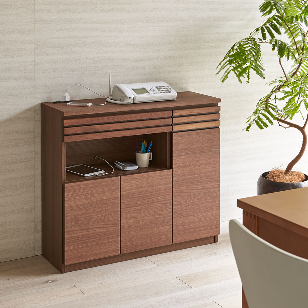 格子に天然木を贅沢に使用した上質感のあるルーター収納・チェストシリーズ。スリムな奥行き31.5cmでリビングや廊下に置きやすい薄型設計。配線のしやすさや壁のコンセントを考えた構造ですっきりと収納できます。リビングボード、電話・FAX台、モバイル収納、プリンター台、窓下収納、カウンター下収納としてもおすすめです。天然木を贅沢に使用した上質感格子にウォルナットもしくはオーク天然木を使用しているのでお客様をおもてなしするリビングに、お洒落で格調高い空間を作り出します。●シックで落ち着いた色合いの『ウォルナット』ダークブラウンを主体とした、ナチュラルモダンスタイルにおすすめです。●自然で柔らかい光が似合う質感の『オーク』トレンドの北欧インテリアとも相性の良いナチュラルカラー。機能性とデザイン性が両立したモダンなルーター収納天然木のリッチな質感が魅力のコンパクト薄型設計。背面に壁面コンセントや配線コードを簡単に処理できるこだわりの構造。見た目と機能性を兼ね備えた才色兼備な収納です。スリムな奥行き31.5cmでリビングや廊下に置きやすい本体奥行きはわずか31.5cmの圧迫感を感じさせないスリムサイズ。薄型なのでダイニングセットのそばでも椅子の邪魔になりません。狭い廊下の使いこなしづらいデッドスペースも有効活用できます。 コンパクトでも収納力はばっちり●天板には、2口コンセント付き。照明スタンドは、もちろんスマートフォンやタブレットの充電、FAXや小型スピーカーなどにも便利●最上段の引き出しは奥までしっかり引き出せるフルスライドレールを採用。文房具や充電器などの迷子になりがちな細々したものの収納に便利です。●中オープン部は高さが20cmあるので、頻繁に出し入れ文房具類や読みかけの本などのちょい置きスペースとしても。●下段の扉内は棚を取り外せばA4ファイルが収まる奥行き、モデムやルーター、コンセントタップの収納やちょっとした書類の整理にも便利です。配線すっきり。設置簡単な完成品背板がなく、棚板をまたいだ配線も簡単。絡まりがちな電気コード類をまとめて収納できます。背板を外したことで、壁面コンセントの正面に設置が可能に。扉を開ければコンセントをそのまま使用できます。組み立て不要の完成品のFAX台完成品のためお届後すぐにお使いいただけます。