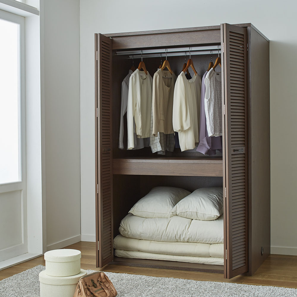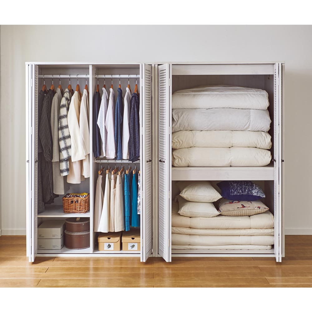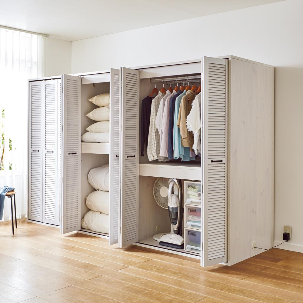 まるで造り付けのような、風通しのよい折れ戸ルーバークローゼット(布団収納)。人気の押入れ代わりになるクローゼットです。ご自宅の収納場所が足りないとお悩みの方におすすめ。通気性のあるルーバー扉で衣類に優しく大量収納●湿気や臭いがこもりにくい洋服に優しいルーバー扉が特徴です。●折れ戸なら開閉に場所を取らないので、寝室や納戸、ウォークインクローゼットなど狭い場所でも手軽にワードローブが作れます。●扉は全開にすれば収納物をひと目で見渡せます。布団の出し入れも楽にできます。●お客様用の布団や座布団がたっぷり収納できる、押入れ代わりになるクローゼットです。●掃除機、扇風機や加湿器などの季節家電、スーツケースなどの大きな収納物も入ります。●布団収納タイプの上段はダブルハンガーで充実の収納力。取り外しも可能です。●側面に配線穴があるので、掃除機を収納したまま充電できます。