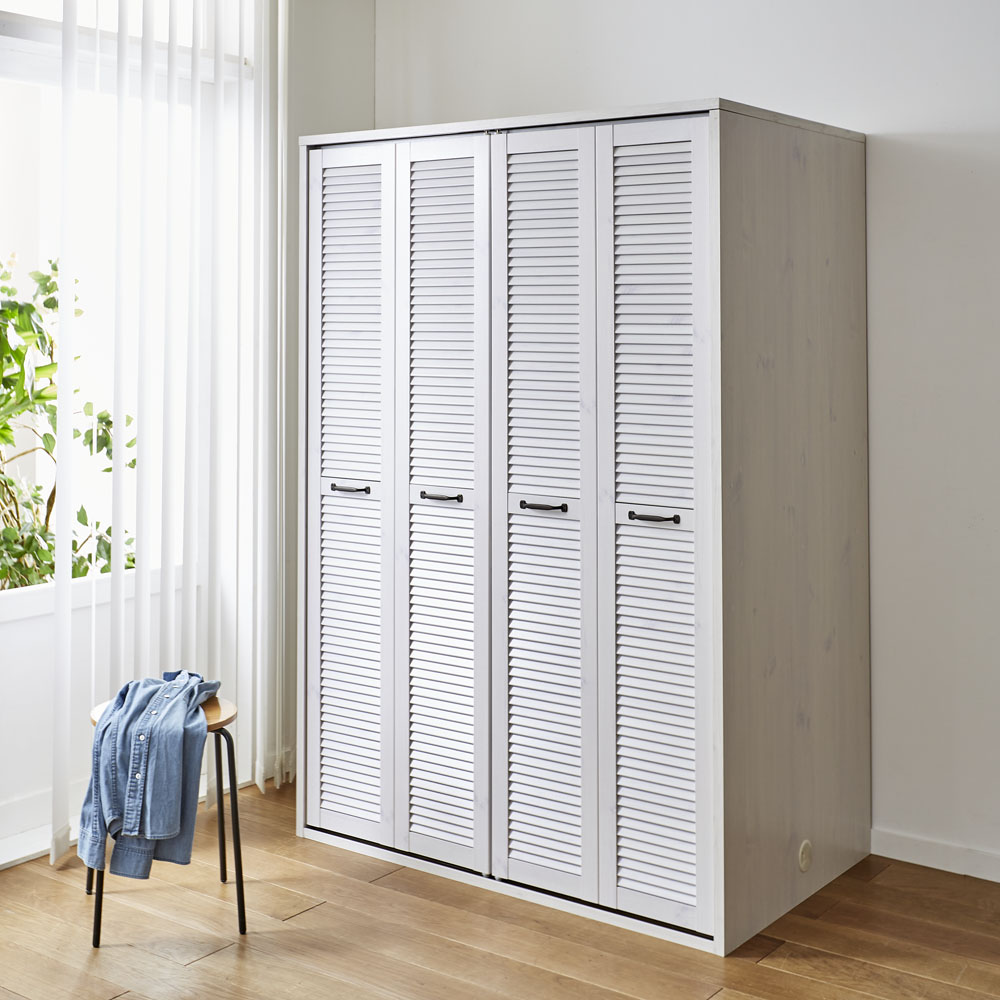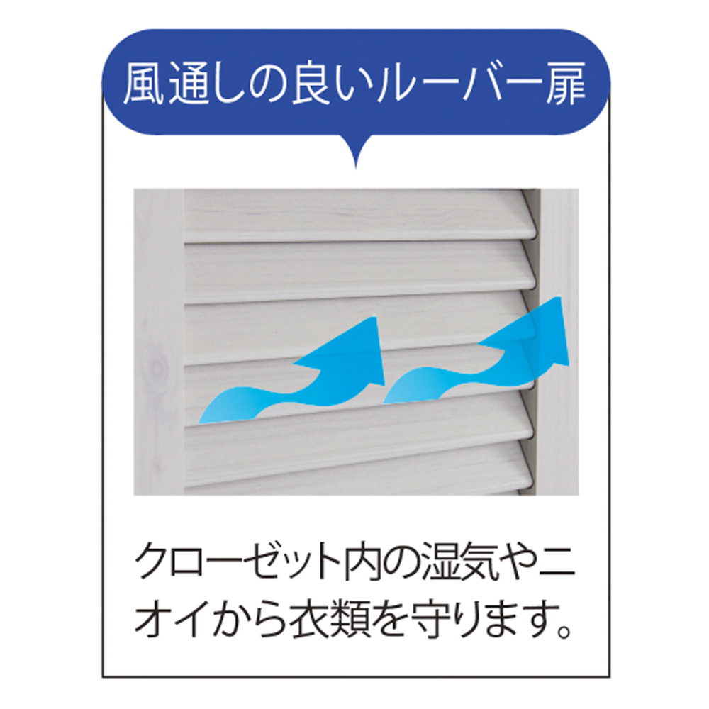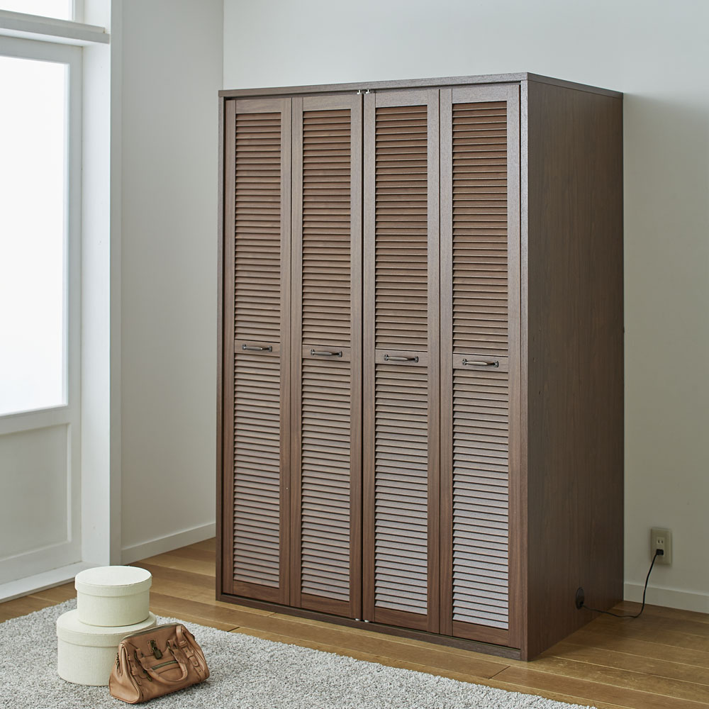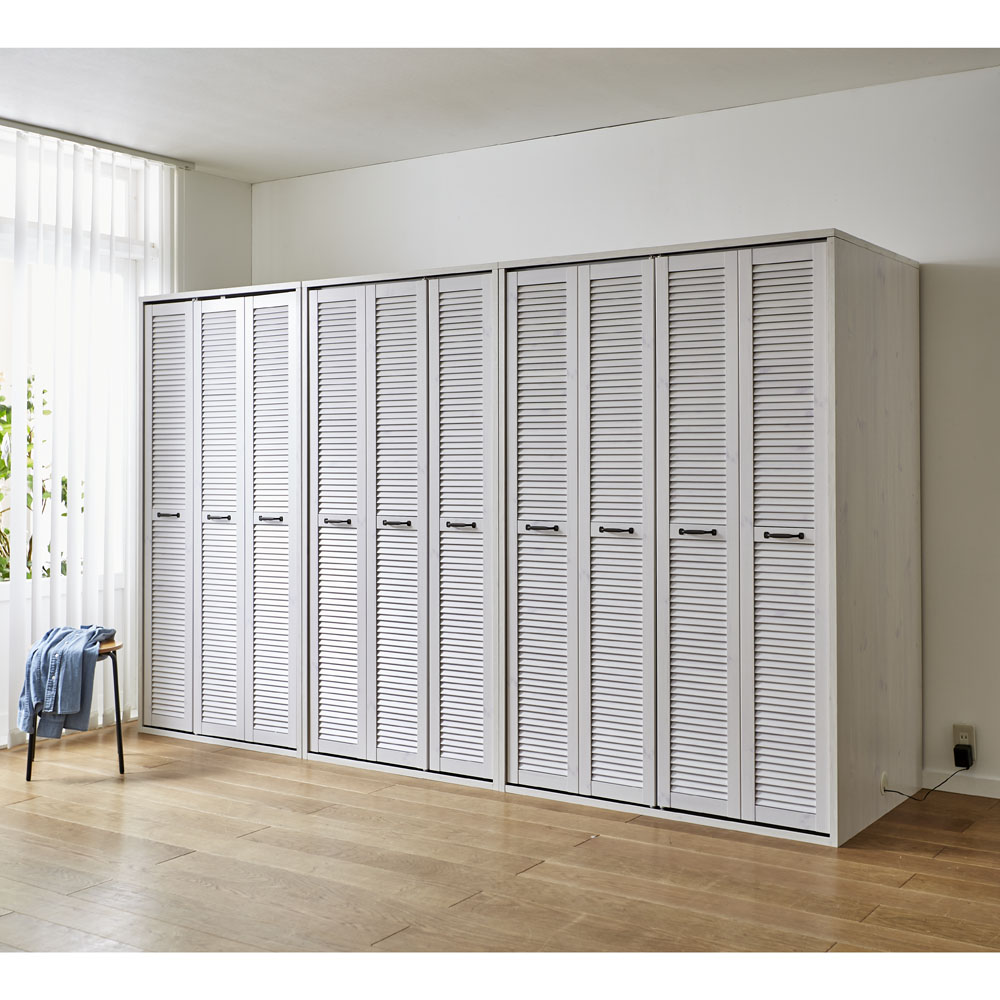 まるで造り付けのような、風通しのよい折れ戸ルーバークローゼット(布団収納)。人気の押入れ代わりになるクローゼットです。ご自宅の収納場所が足りないとお悩みの方におすすめ。通気性のあるルーバー扉で衣類に優しく大量収納●湿気や臭いがこもりにくい洋服に優しいルーバー扉が特徴です。●折れ戸なら開閉に場所を取らないので、寝室や納戸、ウォークインクローゼットなど狭い場所でも手軽にワードローブが作れます。●扉は全開にすれば収納物をひと目で見渡せます。布団の出し入れも楽にできます。●お客様用の布団や座布団がたっぷり収納できる、押入れ代わりになるクローゼットです。●掃除機、扇風機や加湿器などの季節家電、スーツケースなどの大きな収納物も入ります。●布団収納タイプの上段はダブルハンガーで充実の収納力。取り外しも可能です。●側面に配線穴があるので、掃除機を収納したまま充電できます。