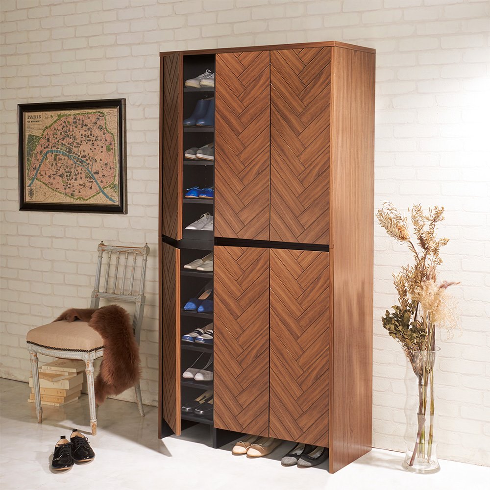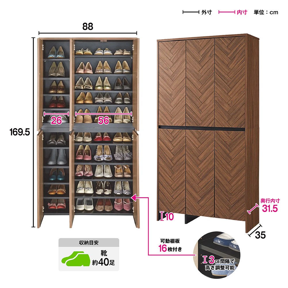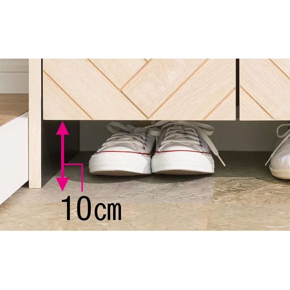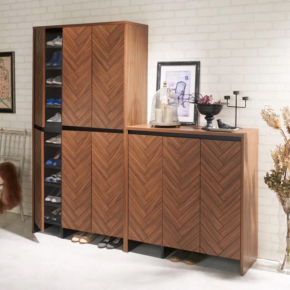 欧米のおしゃれなインテリアで見かけるヘリンボーン柄の扉を使った靴箱。置くだけで空間がランクアップし、憧れのインテリア上級者に。憧れのパリスタイルや西海岸を思わせる、シックな雰囲気のヘリンボーン柄が魅力 ◆歴史あるパリのアパルトマンや、開放的な西海岸インテリアで人気のヘリンボーン柄。 ◆扉を開けた内部はブラックで統一。落ち着いた印象です。玄関に圧迫感が生まれない奥行35cm◆奥行35cmの薄型シューズボックスで、狭い玄関でも安心して設置いただけます。◆下駄箱下に10cmのスペースがあるので、普段履きの靴を取り出しやすく収納できます。使い勝手に拘った機能性◆棚の高さは靴のサイズに合わせて3cm間隔で調節できます。◆棚板奥行が31.5cmなので、サイズの大きい紳士靴も収納できます。担当者からのメッセージ◆デザインだけでなく、収納力も自慢のシューズボックスは、インテリアにこだわりのある方へおすすめ。◆他ではあまり見かけないヘリンボーン柄のシューズボックスで、玄関を洗練された空間に彩ります。◆訪れたゲストに褒められる美しい玄関へ。