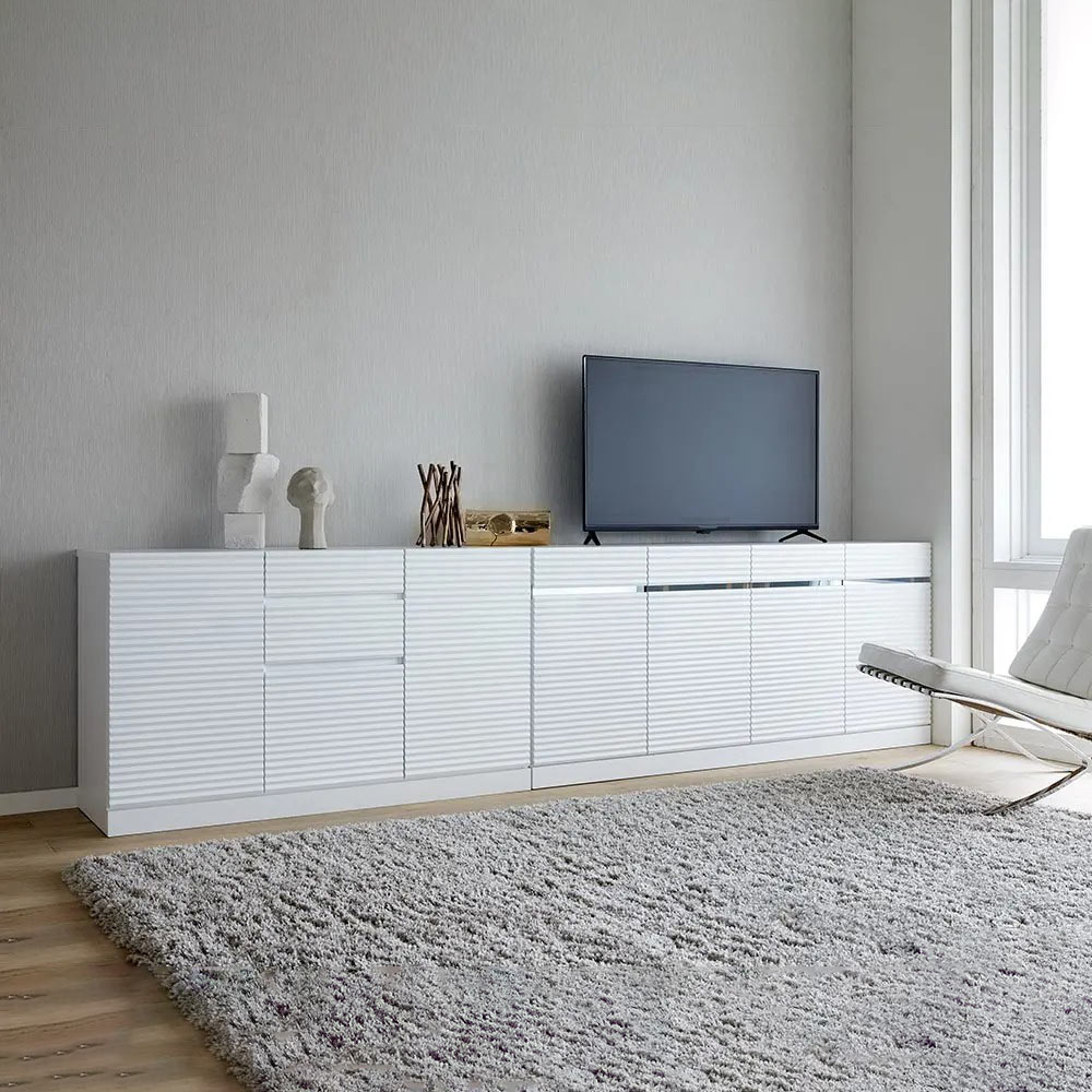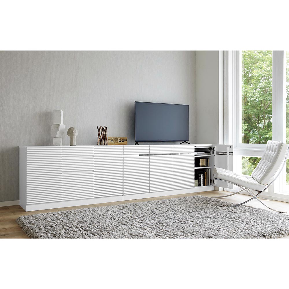 前板に施した立体ボーダーがリッチな存在感のテレビ台シリーズ。こだわりを感じさせる正面のあしらいも魅力的ながら、コーディネートしやすいホワイトカラーで統一。インテリア上級者はもちろん、ビギナーの方も安心して取り入れることができるデザインにこだわりました。インテリア初心者さんから上級者まで。立体ボーダーの表情で魅せる洗練のホワイト家具のオリジナルシリーズ空間に明るさと広がりをもたらす人気のホワイトカラーの家具を、ハウススタイリングがモダンにグレードアップ。前板に施した立体的なボーダーラインが陰影ある表情を魅せる洗練のデザイン。どんな壁紙、フローリングにも合わせやすい、定番の白色に凹凸で表情をつけることで、一味違う個性を持たせました。トータルコーディネートできるサイズバリエーション日本の住宅に合わせて海外輸入ブランドに比べてコンパクトなサイズ感に仕上げ、収納部の大きさなども日本の一般的な収納物を参考に設計しています。トータルコーディネートできるように、奥行や高さを揃えたバリエーションを豊富に展開し、それぞれのご自宅に合った組合せが可能です。インテリア上級者はもちろん、ビギナーの方も失敗なくお部屋に迎え入れやすいラインナップが魅力です。日々使うものだからこそ、機能性にもこだわったハイタイプテレビ台■デッキ収納部を閉めたままリモコン操作が可能。スリット部を通してリモコン操作できる仕組みです。■スリット部にはガラスを貼っているのでホコリが侵入することもなく清潔です。■扉の手掛け部分は正面からは見えないように掘り込みをつけています。美観を損なわずに使いやすさを追求しました。■棚板を固定する棚ダボは抜け落ちにくくしっかり固定される金属製のネジダボ式。絶妙なサイズ感でお部屋の空きスペースに無理なく収まる薄型・ロータイプ■本体は41.5cmの薄型タイプ。柱横などにも収まります。■高さは71cmで窓下におさまります。一般的な窓とカーテンであれば、天板上にカーテンを引きずらずに済む点も魅力。面倒な組み立てのいらない完成商品■組み立て不要の完成品でお届けします。