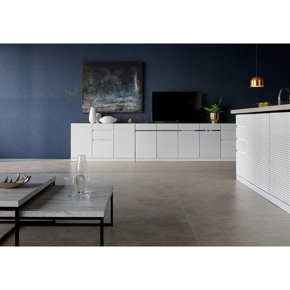 リビングキャビネットとならべてロータイプの壁面収納のようにしても。さりげないストライプが壁面の装飾のようにも見えてお部屋の印象が変わります。