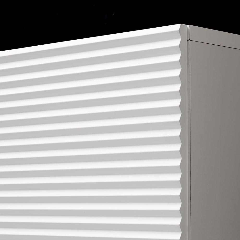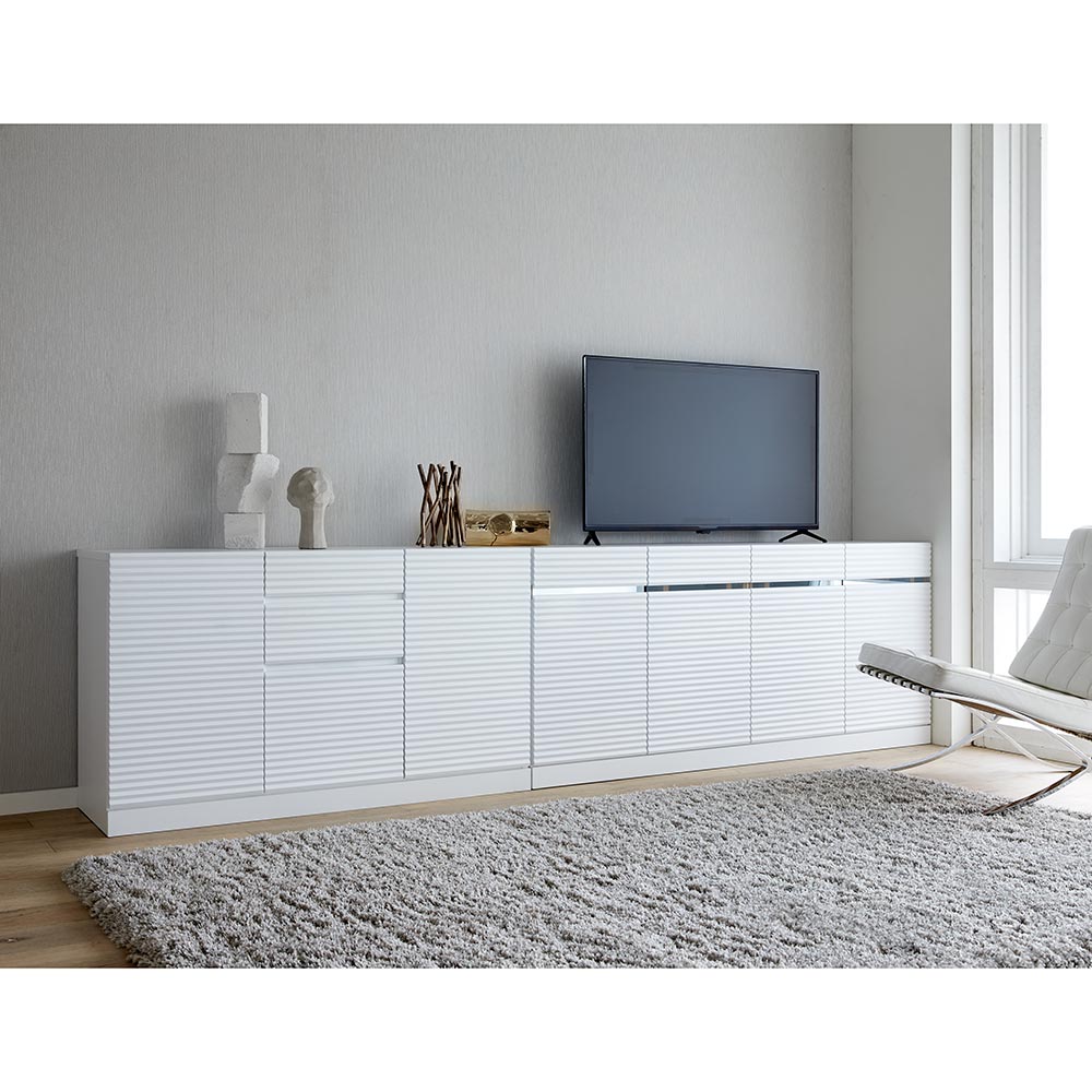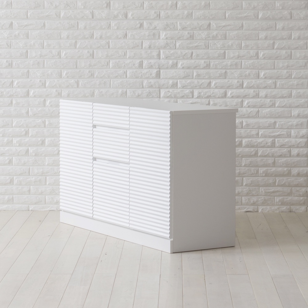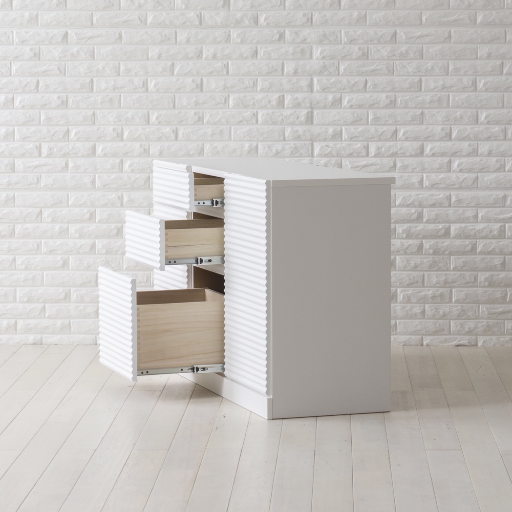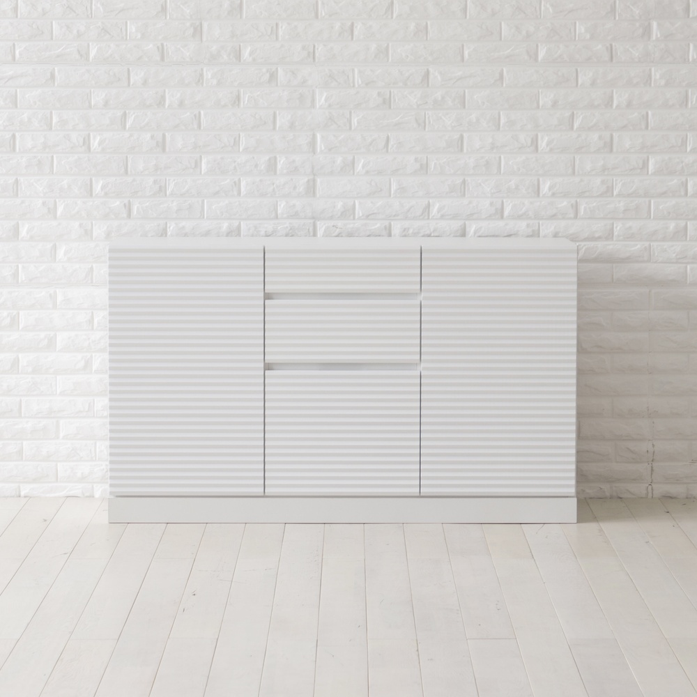 前面に施した立体的なボーダーがリッチなインテリアを叶えるシリーズ。コーディネートしやすいホワイトの家具に丁寧な加工を施すことで、他とは一味違う上質な存在感を放ちます。