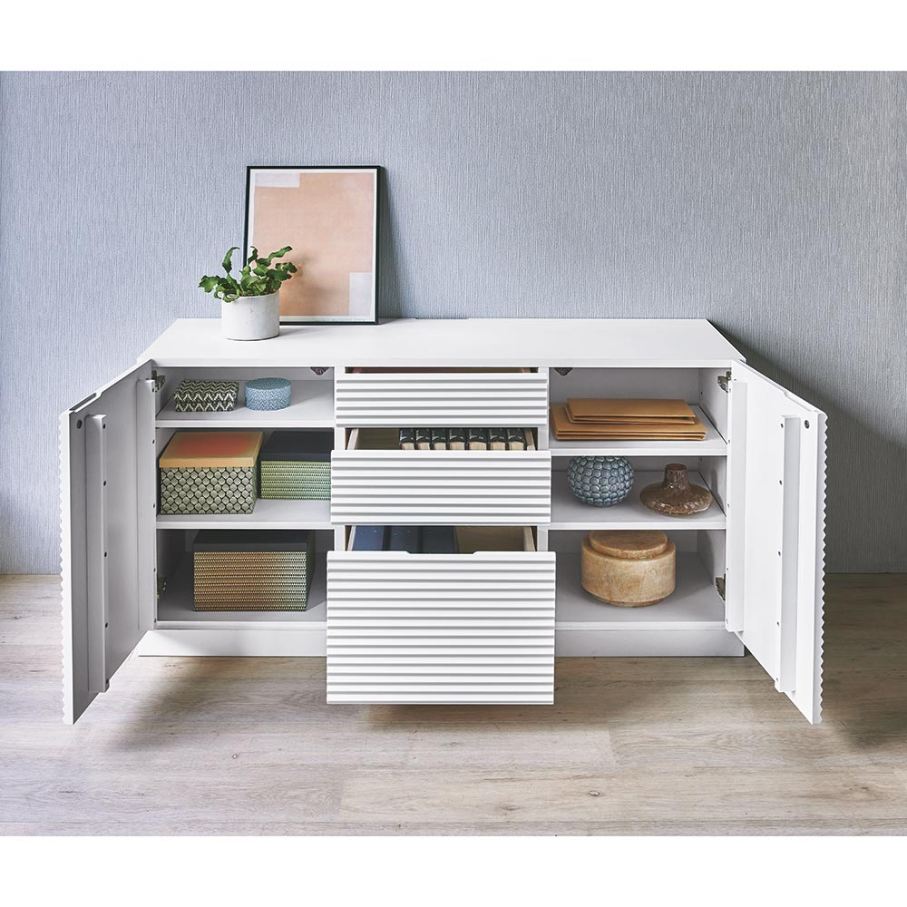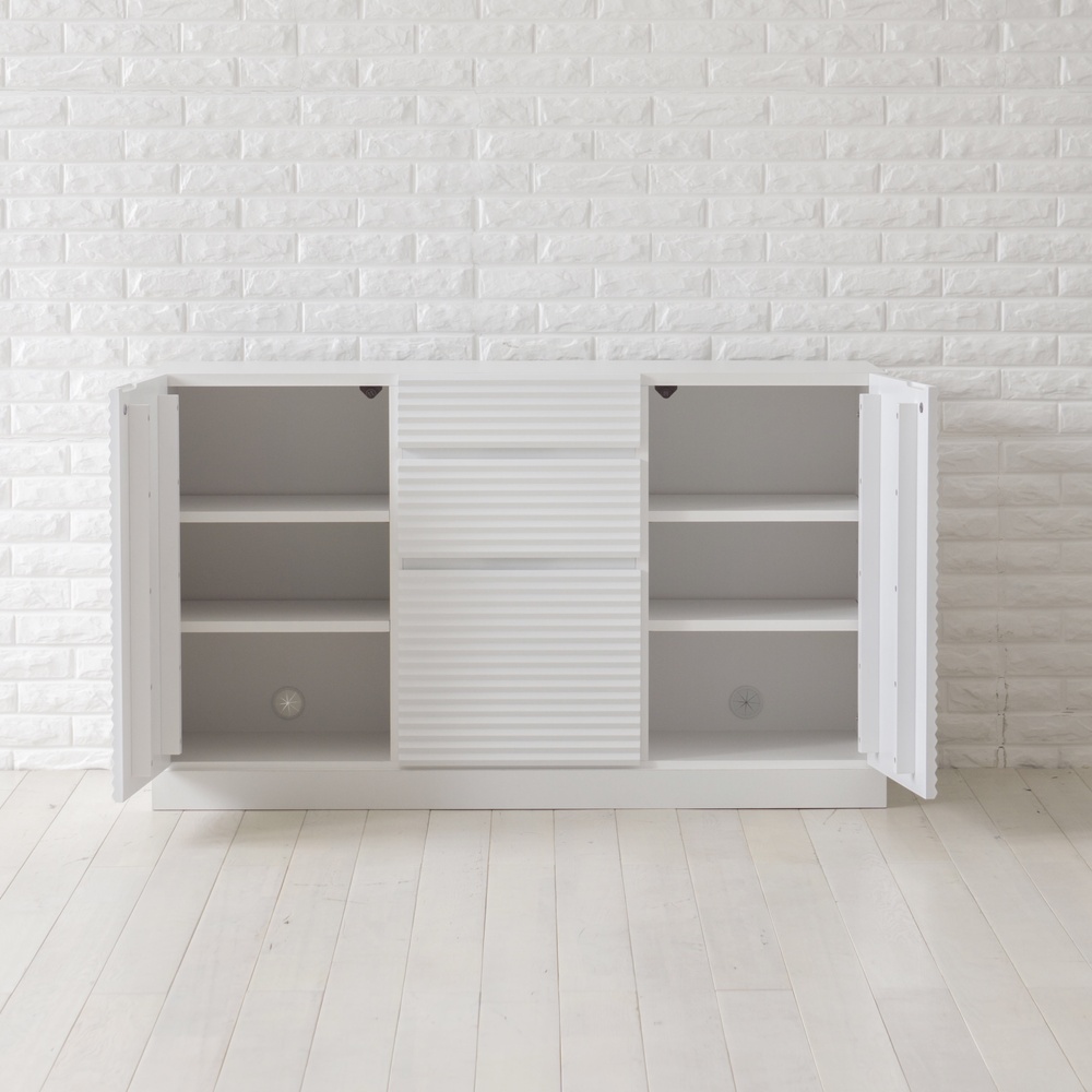 前板に施した立体ボーダーがリッチな存在感のキャビネット。こだわりを感じさせる正面のあしらいも魅力的ながら、コーディネートしやすいホワイトカラーで統一。インテリア上級者はもちろん、ビギナーの方も安心して取り入れることができるデザインにこだわりました。インテリア初心者さんから上級者まで。立体ボーダーの表情で魅せる洗練のホワイト家具のオリジナルシリーズ空間に明るさと広がりをもたらす人気のホワイトカラーの家具を、ハウススタイリングがモダンにグレードアップ。前板に施した立体的なボーダーラインが陰影ある表情を魅せる洗練のデザイン。どんな壁紙、フローリングにも合わせやすい、定番の白色に凹凸で表情をつけることで、一味違う個性を持たせました。トータルコーディネートできるサイズバリエーション日本の住宅に合わせて海外輸入ブランドに比べてコンパクトなサイズ感に仕上げ、収納部の大きさなども日本の一般的な収納物を参考に設計しています。トータルコーディネートできるように、奥行や高さを揃えたバリエーションを豊富に展開し、それぞれのご自宅に合った組合せが可能です。インテリア上級者はもちろん、ビギナーの方も失敗なくお部屋に迎え入れやすいラインナップが魅力です。使いやすさにもこだわった機能性■引き出しは開閉がスムーズなレール付。最下段は奥のモノも出し入れしやすいフルスライドレール。■奥までしっかり引き出し事が出来るので、奥にしまったアイテムも簡単に出し入れできます。■引き出しと扉の手掛け部分は正面からは見えないように掘り込みをつけています。美観を損なわずに使いやすさを追求しました。■棚板を固定する棚ダボは抜け落ちにくくしっかり固定される金属製のネジダボ式。■背板にはコード穴を設け、目隠ししたいルーターやモデムなを内部に設置できるように設計しています。■天板上の奥にはコード通し用のスリットを設けています。オーディオなどの電気製品をスマートに設置可能です。絶妙なサイズ感でお部屋の空きスペースに無理なく収まる薄型・ロータイプ■本体は41.5cmの薄型タイプ。柱横などにも収まります。■高さは71cmで窓下におさまります。一般的な窓とカーテンであれば、天板上にカーテンを引きずらずに済む点も魅力。面倒な組み立てのいらない完成商品■組み立て不要の完成品でお届けします。