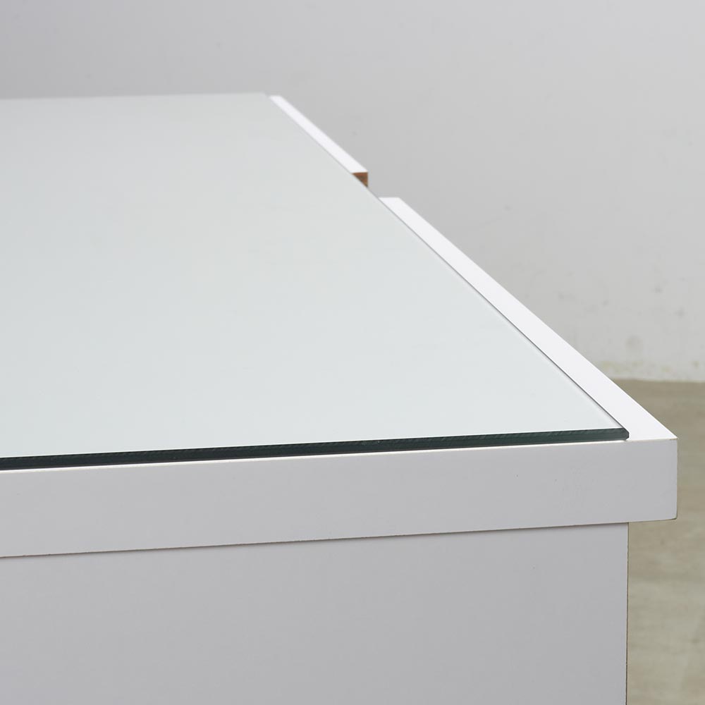 天板奥のコード用スリットを避けてガラス天板を乗せています。