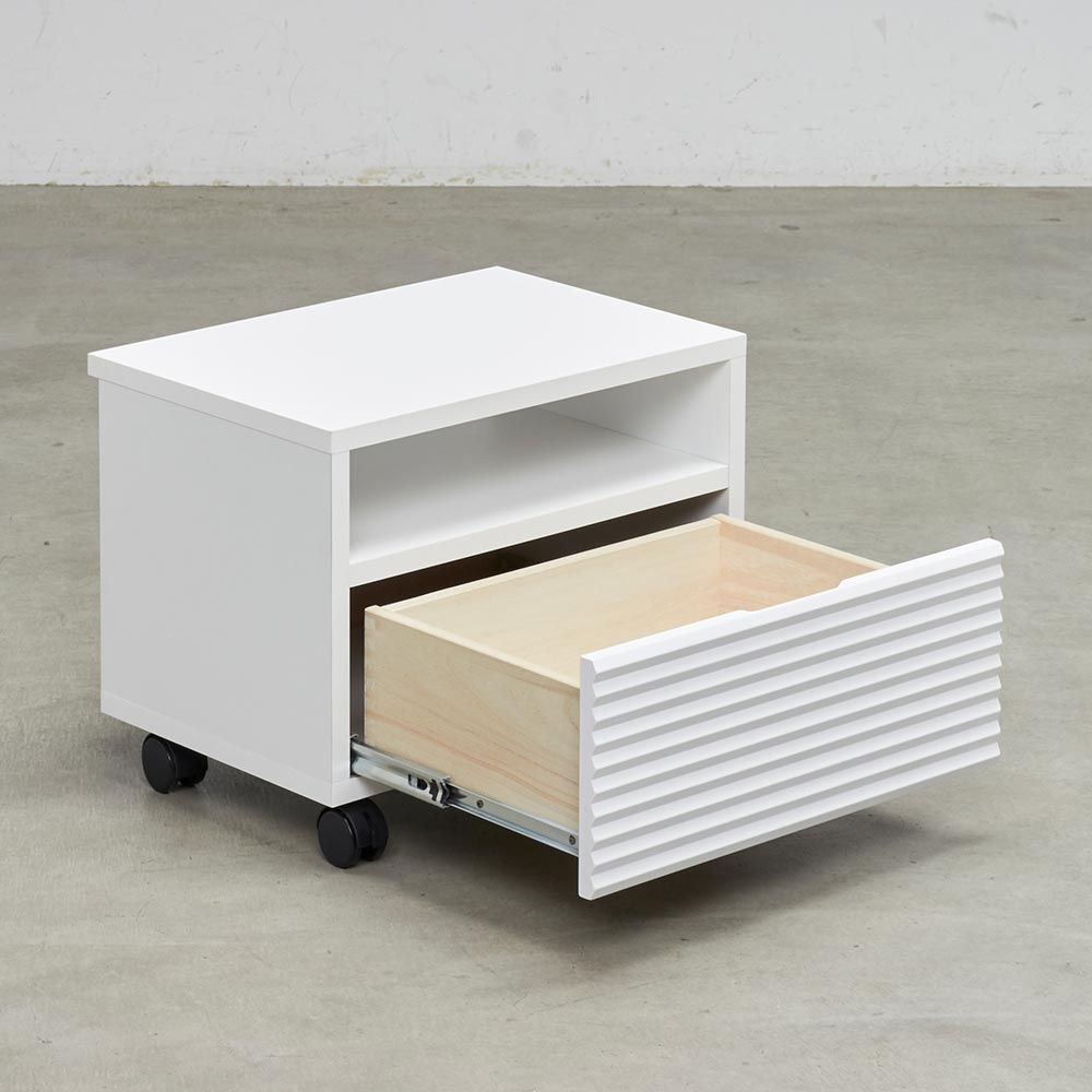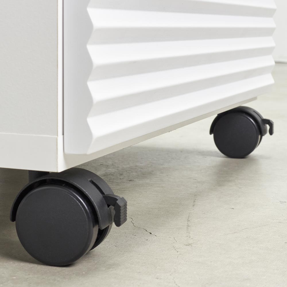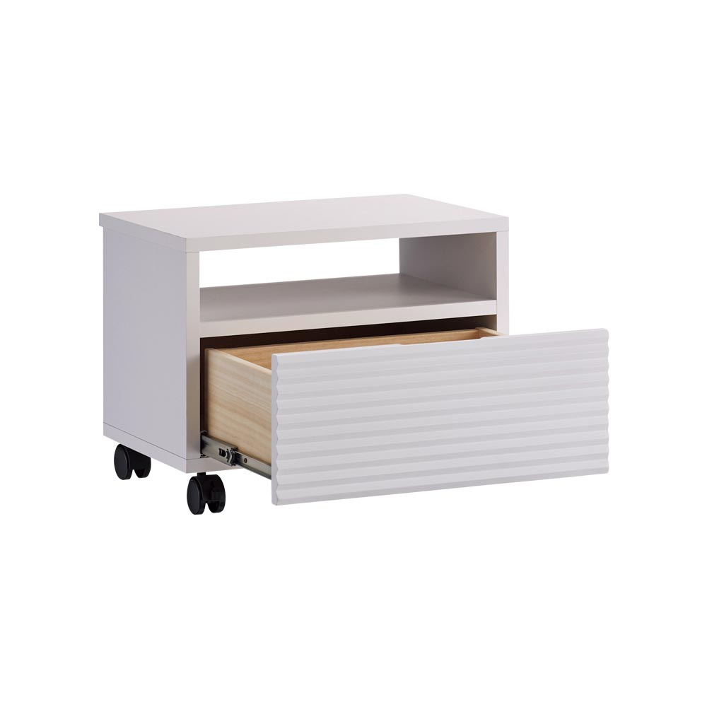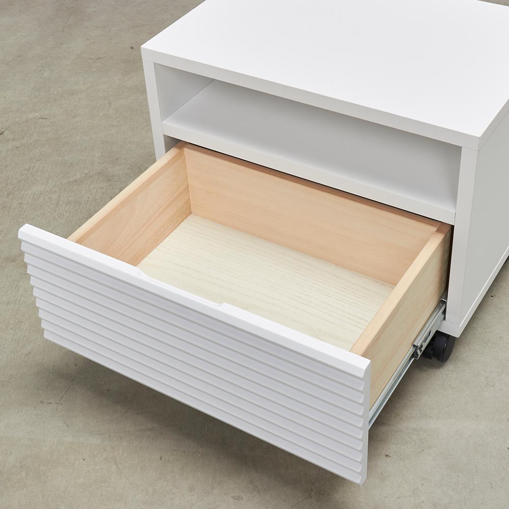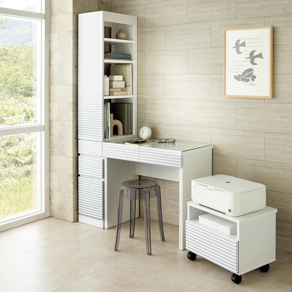 前板に施した立体ボーダーがリッチな存在感のデスクワゴン・プリンターワゴン。こだわりを感じさせる正面のあしらいも魅力的ながら、コーディネートしやすいホワイトカラーで統一。インテリア上級者はもちろん、ビギナーの方も安心して取り入れることができるデザイン。インテリア初心者さんから上級者まで。立体ボーダーの表情で魅せる洗練のホワイト家具のオリジナルシリーズ空間に明るさと広がりをもたらす人気のホワイトカラーの家具を、ハウススタイリングがモダンにグレードアップ。前板に施した立体的なボーダーラインが陰影ある表情を魅せる洗練のデザイン。どんな壁紙、フローリングにも合わせやすい、定番の白色に凹凸で表情をつけることで、一味違う個性を持たせました。トータルコーディネートできるサイズバリエーション日本の住宅に合わせて海外輸入ブランドに比べてコンパクトなサイズ感に仕上げ、収納部の大きさなども日本の一般的な収納物を参考に設計しています。トータルコーディネートできるように、奥行や高さを揃えたバリエーションを豊富に展開し、それぞれのご自宅に合った組合せが可能です。インテリア上級者はもちろん、ビギナーの方も失敗なくお部屋に迎え入れやすいラインナップが魅力です。プリンターの定位置にぴったり。使いやすさにもこだわった機能性■天板は一般的なプリンターを乗せてもデスク下にきちんとワゴンごと収まるよう設計しました。■オープン部はコピー用紙の束をそのまま収納するのに便利です。■引き出しは深めに設計し、ガジェット類の付属品や空き箱などもおさまります。■キャスターは前2輪がストッパー付き。プリンターを使う際はロックをかけると安定しやすくなります。直ぐにお使いいただける完成品■キャスターを取り付けるだけの完成品でお届けします。箱から出して簡単にご使用いただけますので時短にも。