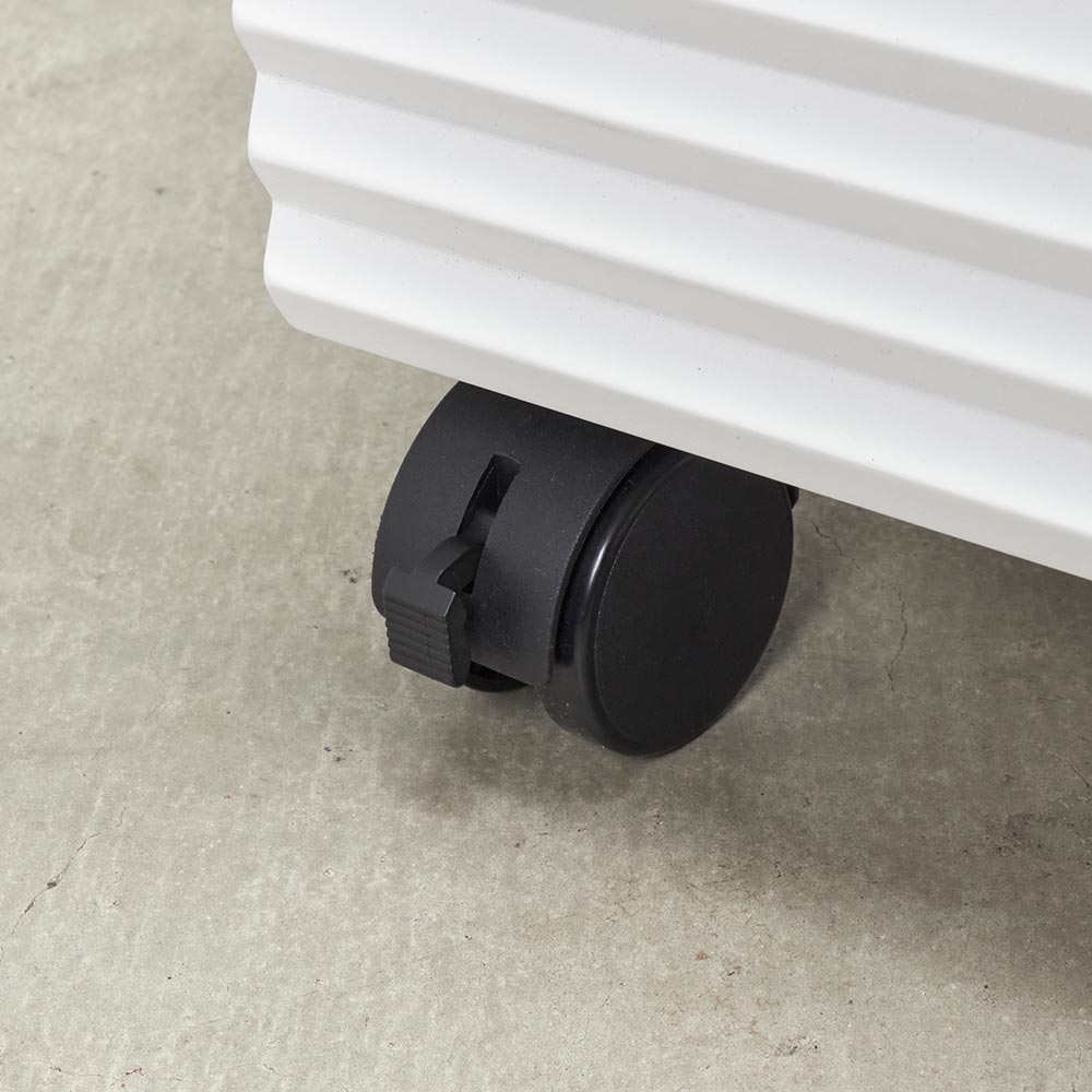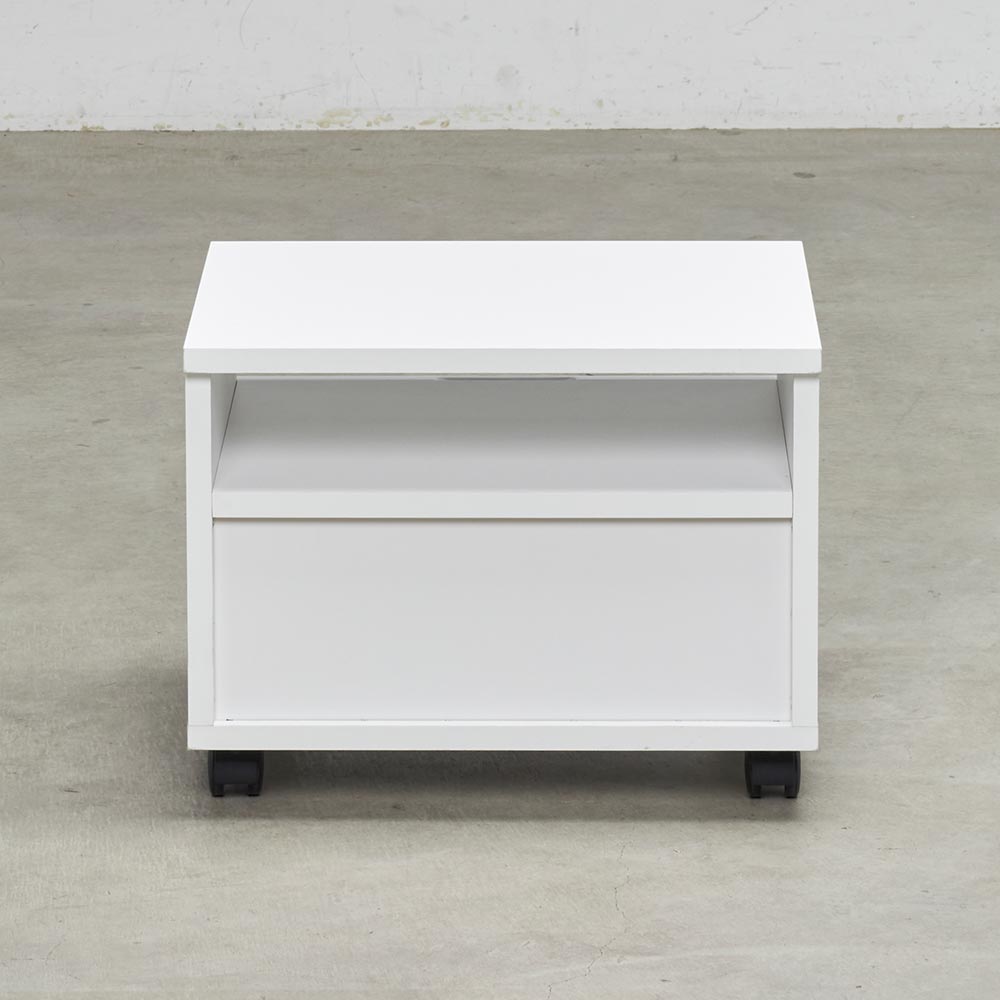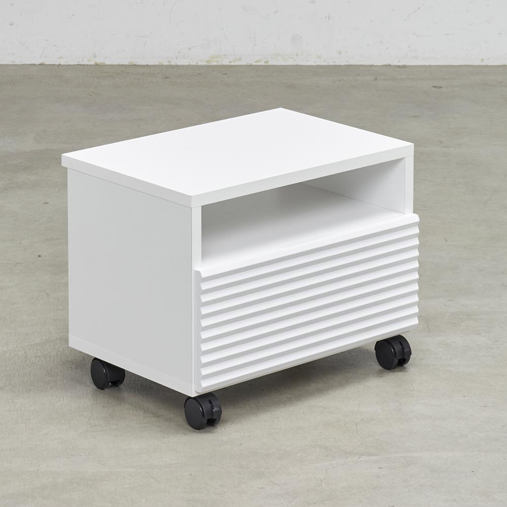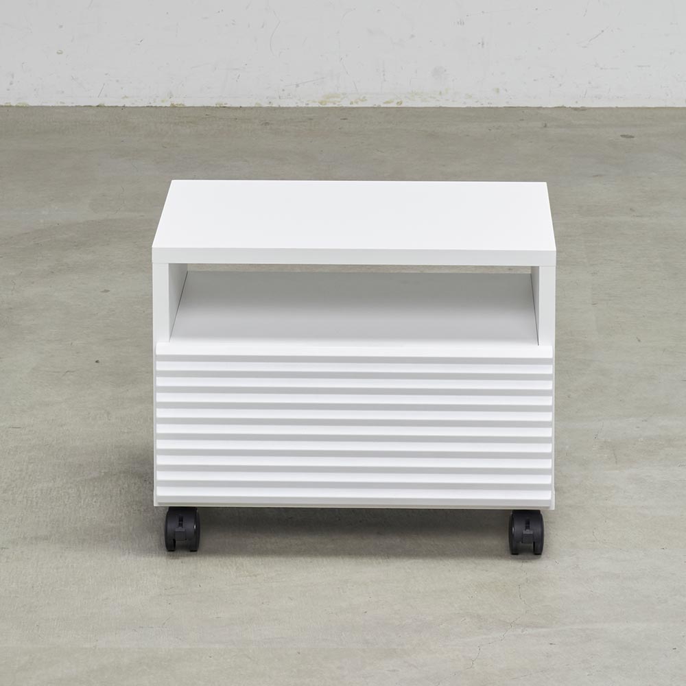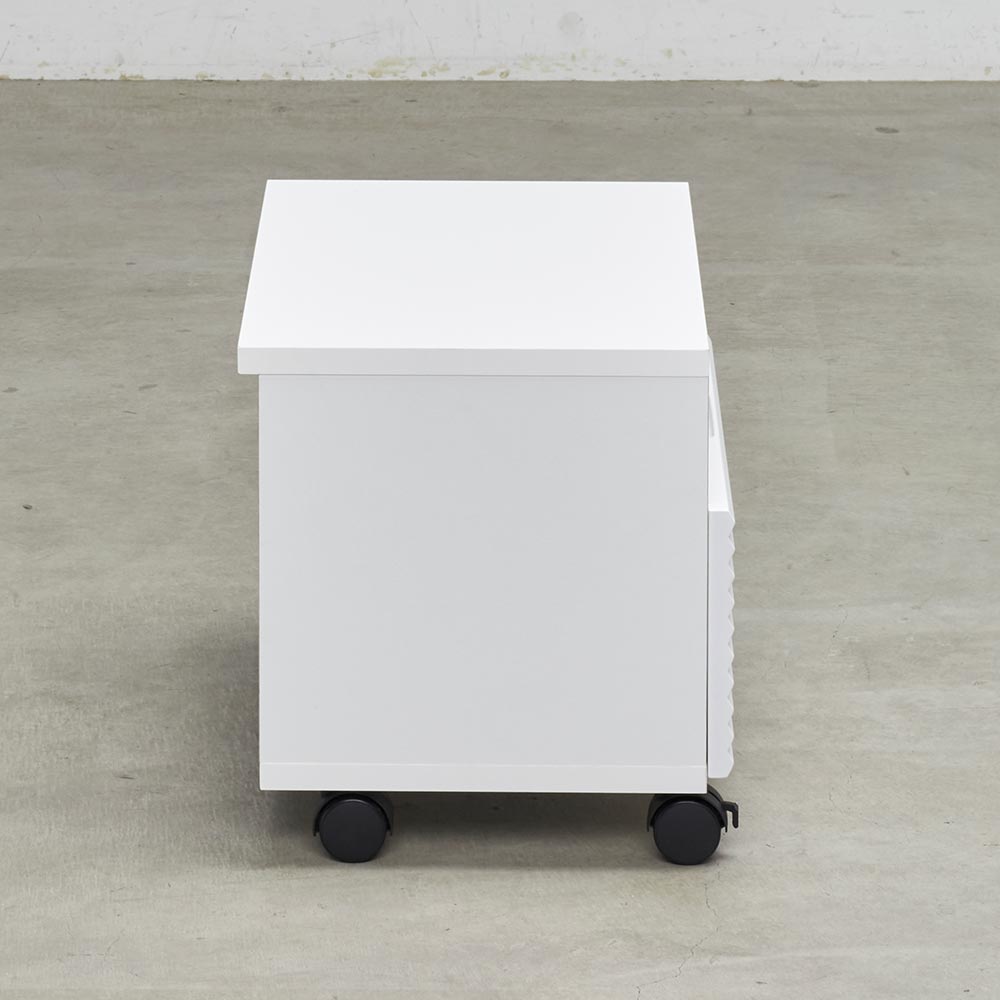 前板に施した立体ボーダーがリッチな存在感のデスクワゴン・プリンターワゴン。こだわりを感じさせる正面のあしらいも魅力的ながら、コーディネートしやすいホワイトカラーで統一。インテリア上級者はもちろん、ビギナーの方も安心して取り入れることができるデザイン。インテリア初心者さんから上級者まで。立体ボーダーの表情で魅せる洗練のホワイト家具のオリジナルシリーズ空間に明るさと広がりをもたらす人気のホワイトカラーの家具を、ハウススタイリングがモダンにグレードアップ。前板に施した立体的なボーダーラインが陰影ある表情を魅せる洗練のデザイン。どんな壁紙、フローリングにも合わせやすい、定番の白色に凹凸で表情をつけることで、一味違う個性を持たせました。トータルコーディネートできるサイズバリエーション日本の住宅に合わせて海外輸入ブランドに比べてコンパクトなサイズ感に仕上げ、収納部の大きさなども日本の一般的な収納物を参考に設計しています。トータルコーディネートできるように、奥行や高さを揃えたバリエーションを豊富に展開し、それぞれのご自宅に合った組合せが可能です。インテリア上級者はもちろん、ビギナーの方も失敗なくお部屋に迎え入れやすいラインナップが魅力です。プリンターの定位置にぴったり。使いやすさにもこだわった機能性■天板は一般的なプリンターを乗せてもデスク下にきちんとワゴンごと収まるよう設計しました。■オープン部はコピー用紙の束をそのまま収納するのに便利です。■引き出しは深めに設計し、ガジェット類の付属品や空き箱などもおさまります。■キャスターは前2輪がストッパー付き。プリンターを使う際はロックをかけると安定しやすくなります。直ぐにお使いいただける完成品■キャスターを取り付けるだけの完成品でお届けします。箱から出して簡単にご使用いただけますので時短にも。