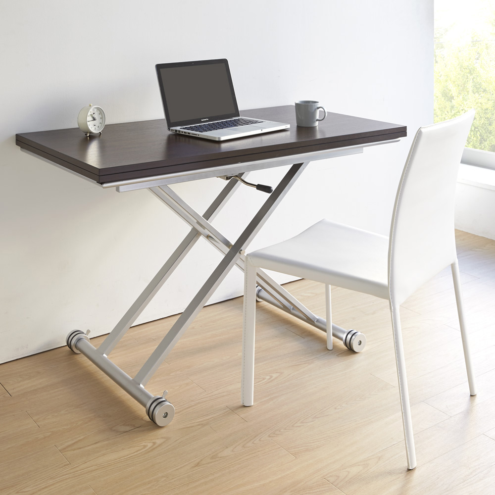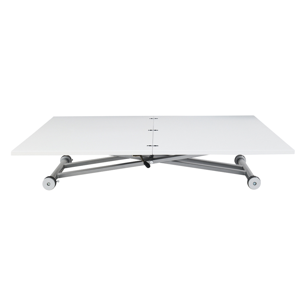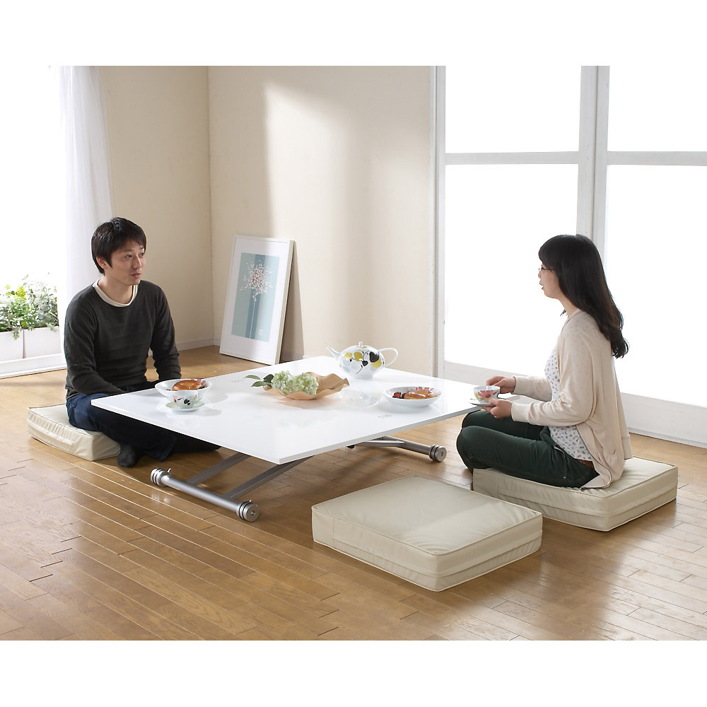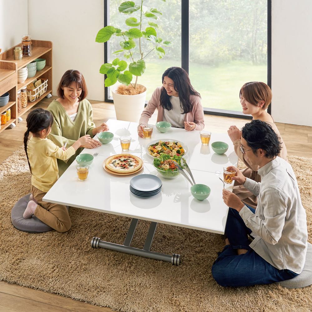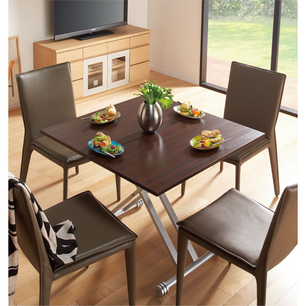 在宅勤務、テレワークにもおすすめの昇降式テーブル。大人気の伸長式テーブルにパーソナルなコンパクトサイズです。一人の時はコンパクトに、人数が増えたら天板を広げて。ダイニングテーブルやパソコンデスク、アイロン作業にも幅広く活躍します。大きさ・高さが自在に変化するテーブルは個人の趣味から家族での団らん、普段の食事からお客様が集まるホームパーティーまで。あらゆる時と場面にフィットする優れものです。シンプルですっきりとしたフォルムとベーシックな色展開でどんなインテリアにもしっくり馴染みます。ソファ前のリビングテーブル・センターテーブルとしてだけでなく、ダイニングテーブル・パソコンデスク・ワークテーブル(作業台)として、1台で多機能に使用することができます。[point01] 簡単3ステップで天板サイズが2倍に!一人のときはコンパクトに。お友達が来た時にはさっと広げて大きく。天板を広げるには、下にあるロックを外し天板を回転させてたたまれた天板を広げるだけ。広げた状態での天板のサイズは90cm×90cm。これは大体ですが畳をちょうど半分にしたほどの大きさです。天板をたたんだ際には90cm×45cmでさらにその半分になります。たたんだ状態でもコーヒーテーブルとして2人でお茶やお食事を楽しむには十分なサイズです。[point02] 状況に合わせて。高さ無段階調節。天板高さは33cm〜74cmで無段階の調節が可能。座椅子やクッションと合わせて低めに、パソコン作業のためにスツールに合わせて高く、アイロンかけをするので立った時の高さに合わせて…。無段階調節だからこそできるイスやその時の姿勢に合わせたフィット感はリフティングテーブルならではの魅力です。[point03] 毎日使うものだからこそ、お手入れしやす清潔に(ア)ホワイトの天板はウレタン塗装を施し、汚れに強くふき取りも簡単な塗装を施しました。ウレタン塗装はダイニングテーブルにも一般的に用いられる塗装です。(イ)ダークブラウンは表面材にメラミン化粧板を採用しました。こちらも汚に強くありながら、かつ木目調の高級感を持つ素材です。メラミン化粧板は角から建材まで幅広く使用されています。[point04] 組立不要の楽々完成品商品は完成品でのお届けになりますので箱から出してすぐに設置、ご使用いただけます。〜お客様から続々と口コミが届いています〜●とても重宝してます!普段は半分サイズで使え、人が集まる時は広げられ、便利です。デザインも、気に入っています。 (東京都)●用途に応じて高さ、大きさを変えることができて便利です。搬入の際はかなり重いので大変でしたが、設置してからはキャスターもついているので重さはきになりません。 (神奈川県)●レビューを読んで、重いらしいというのは聞いていたので、それはその通りでしたが、他は昇降も伸展もすべてスムーズで気に入っています。 (和歌山県)