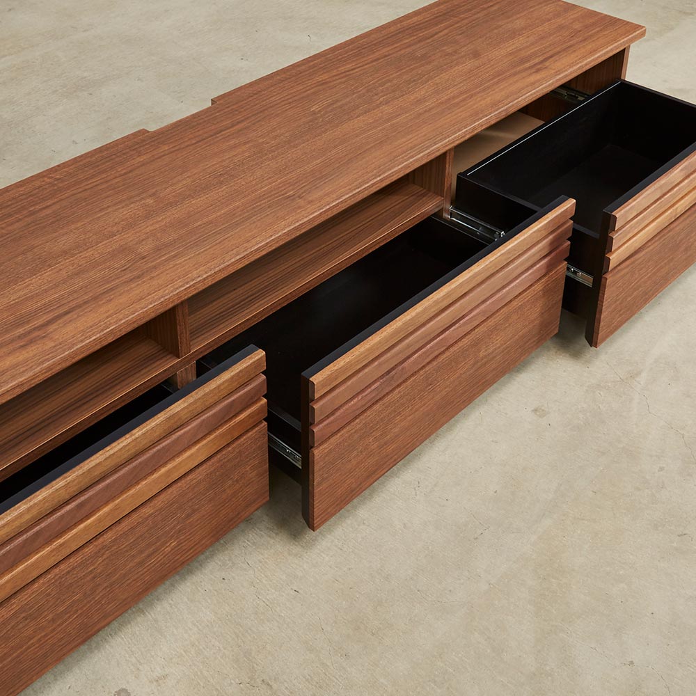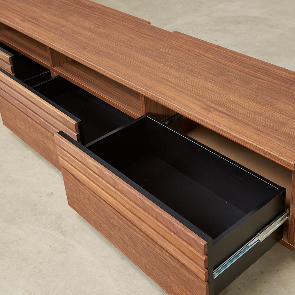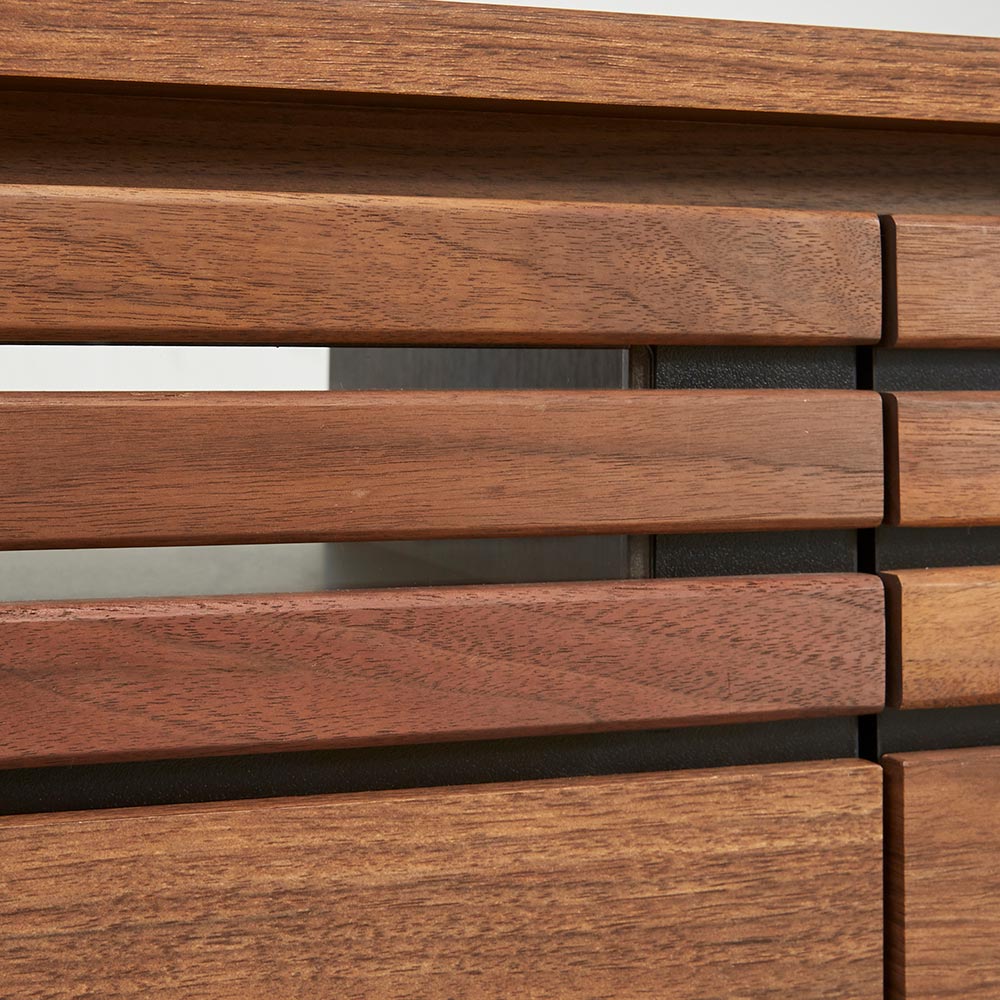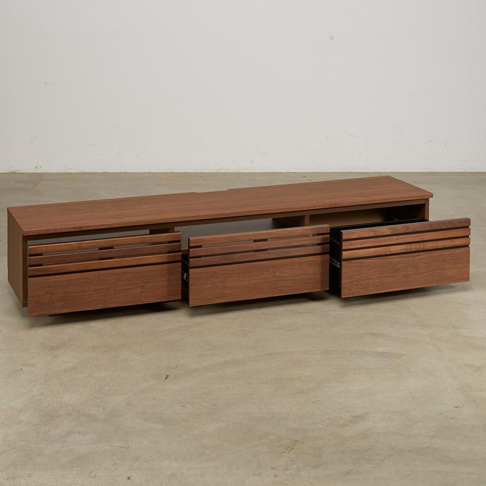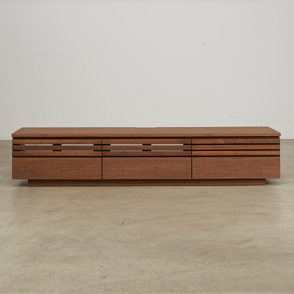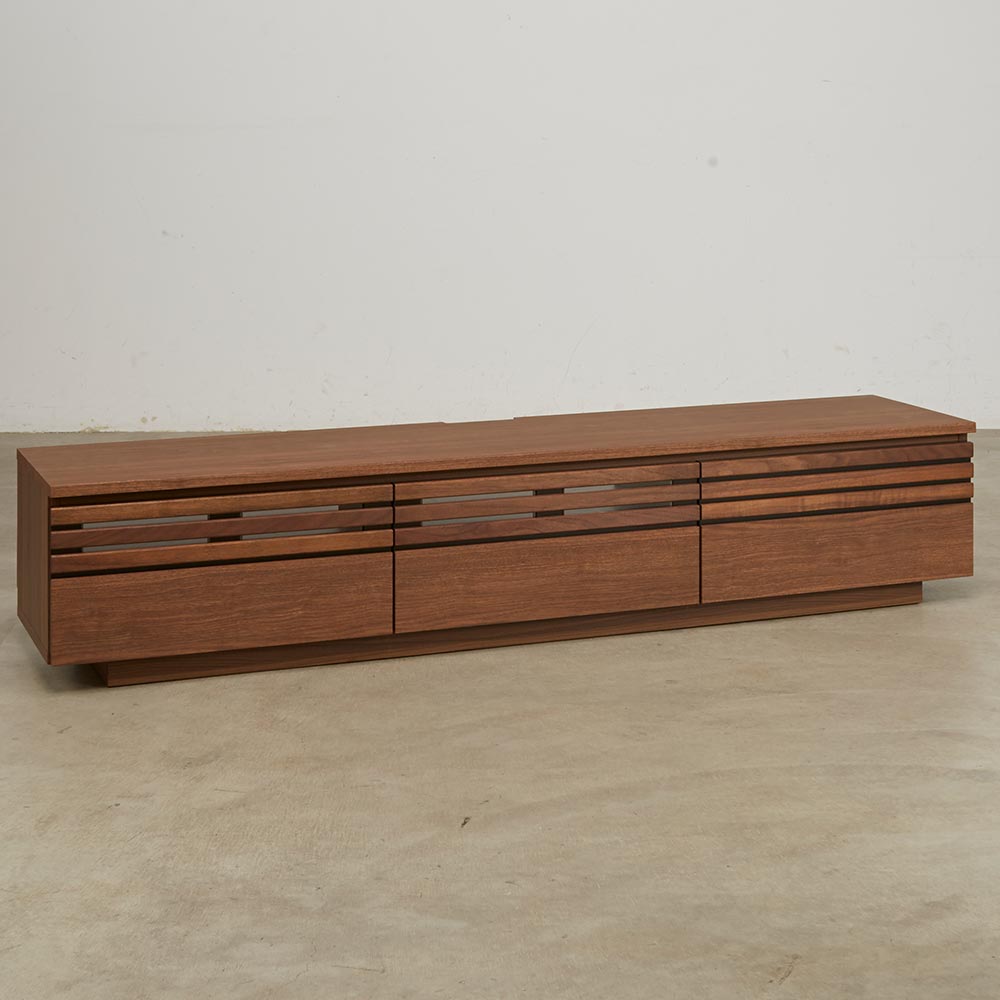 天然木ならではの美しい質感。落ち着いたスタイルと頼れる収納力を兼ね備え、暮らしに沿ったサイズ展開が自慢のリビングボードシリーズ。格子に天然木をふんだんに使用した上質感のある佇まいが空間に品よくなじみます。格子に天然木を贅沢に使用した上質感ウォルナットもしくはオーク天然木を使用しているのでお客様をおもてなしするリビングに、お洒落で格調高い空間を作り出します。●シックで落ち着いた色合いの『ウォルナット』ダークブラウンを主体とした、ナチュラルモダンスタイルにおすすめです。●自然で柔らかい光が似合う質感の『オーク』トレンドの北欧インテリアとも相性の良いナチュラルカラー。リビングに上質さとスマートな印象を素材にこだわったシンプルなデザインが上質さを醸します。大型テレビにも対応するラインナップが自慢。豊富な品揃えからぴったりが選べるナチュラルなリビングボードシリーズです。高さ35.5cmのローボードタイプのテレビ台は、床やソファに座ってのテレビ鑑賞におすすめです。機能面へのこだわり幅150.5cmなら60型まで、幅180.5cmなら70型まで、幅200.5・240.5cmなら80型までのテレビに対応しています。デッキ収納部の背面はオープン仕様。ストレスなく配線ができます。扉・引き出しのスリット部分には3mm厚のガラス窓仕様。閉めたままリモコン操作が可能です。背面に巾木よけカット(高さ10奥行1cm)があるので、壁にぴったりつけて設置できます。CD・DVDもたっぷり収納できる引出しスライドレールなので開閉もスムーズで奥まで出し入れが簡単です。検索性の高い引き出し構造で、ストレスなくお気に入りのメディアを探せます。組み立て不要の完成品テレビボード完成品のためお届後すぐに使えるテレビボードです。
