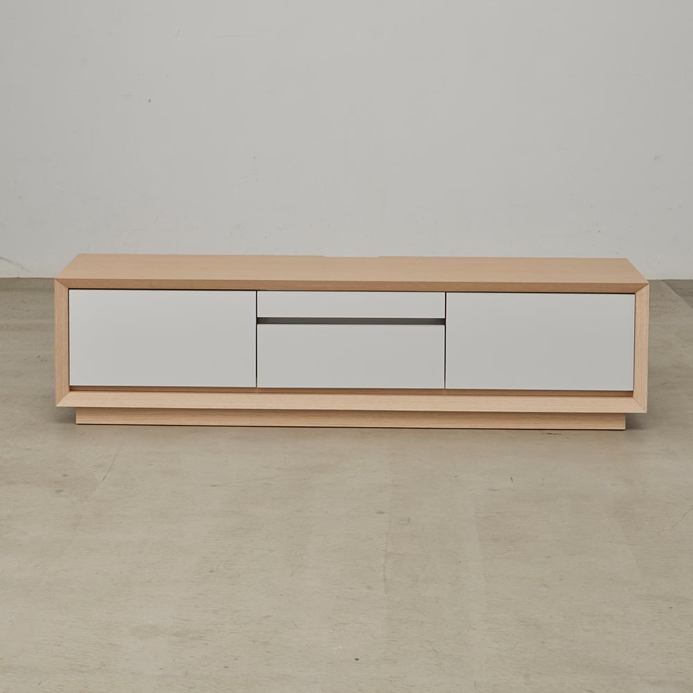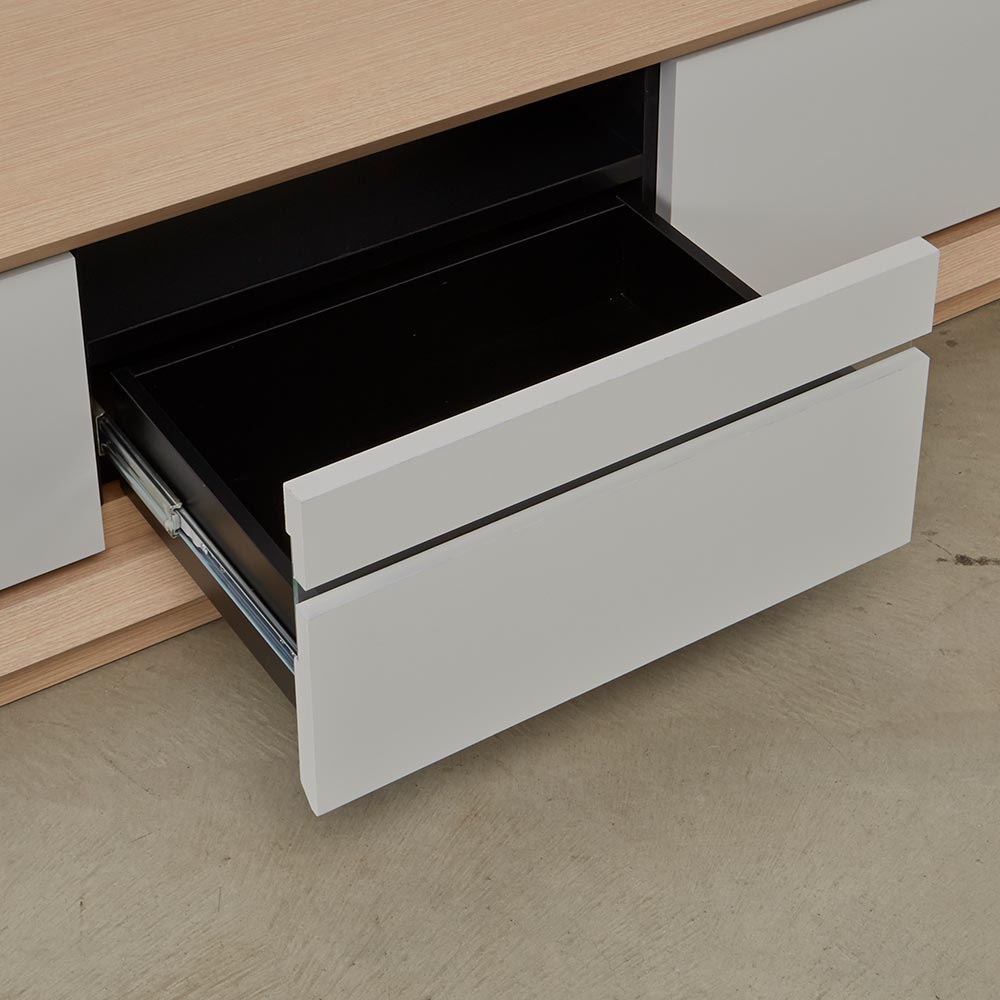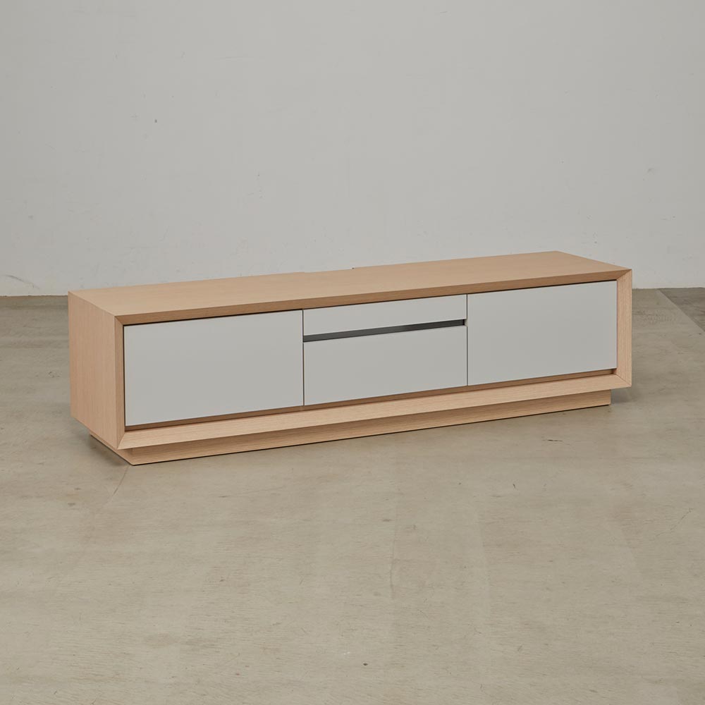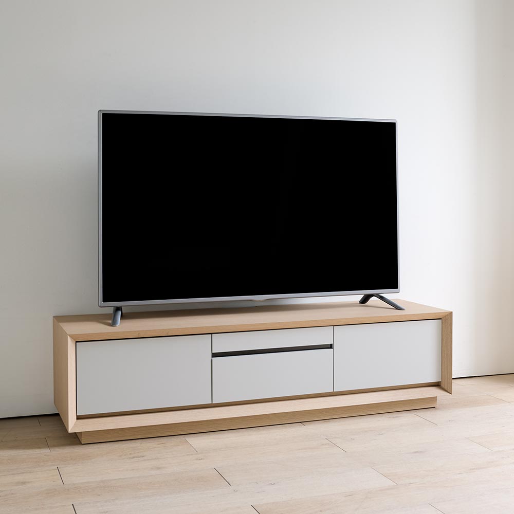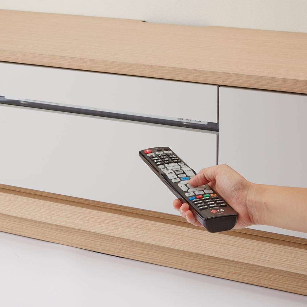 洗練と温もりのマッチングが織なすミニマルデザインの収納シリーズ■洗練されたコンテンポラリーデザインマットなライトグレーの前面とナチュラルカラーのフレームが織りなす上質な佇まい。余計な装飾を排したミニマルデザインで、リビングやダイニングに静かな存在感。取っ手のないフラットな扉面で、壁のような美しさ。■丁寧な造りと美しいディテール4隅の繊細な仕上げが、モダンなスタイリッシュ感をさらに引き立てる。シンプルなデザインなので、様々なインテリアスタイルに合わせやすい。■暮らしに寄りそう機能と使いやすさデッキ収納部の前板にガラスを使用。ほこりが入りにくく閉じた状態でリモコンが使えます。扉内の可動棚で収納物に合わせて自由に整理。キズや汚れが、つきにくいメラミン表面材を使用。お手入れがラクです。■品質へのこだわり日本の品質基準に基づいた企画で、信頼できる日系中国工場での製造。安定感のある頑丈な造りで、長くお使いいただける確かな品質に仕上げました。