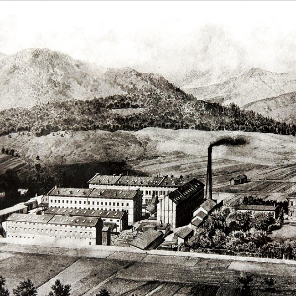 ブナの森に囲まれた、1860年代のチェコ・ビストリッチェ工場。