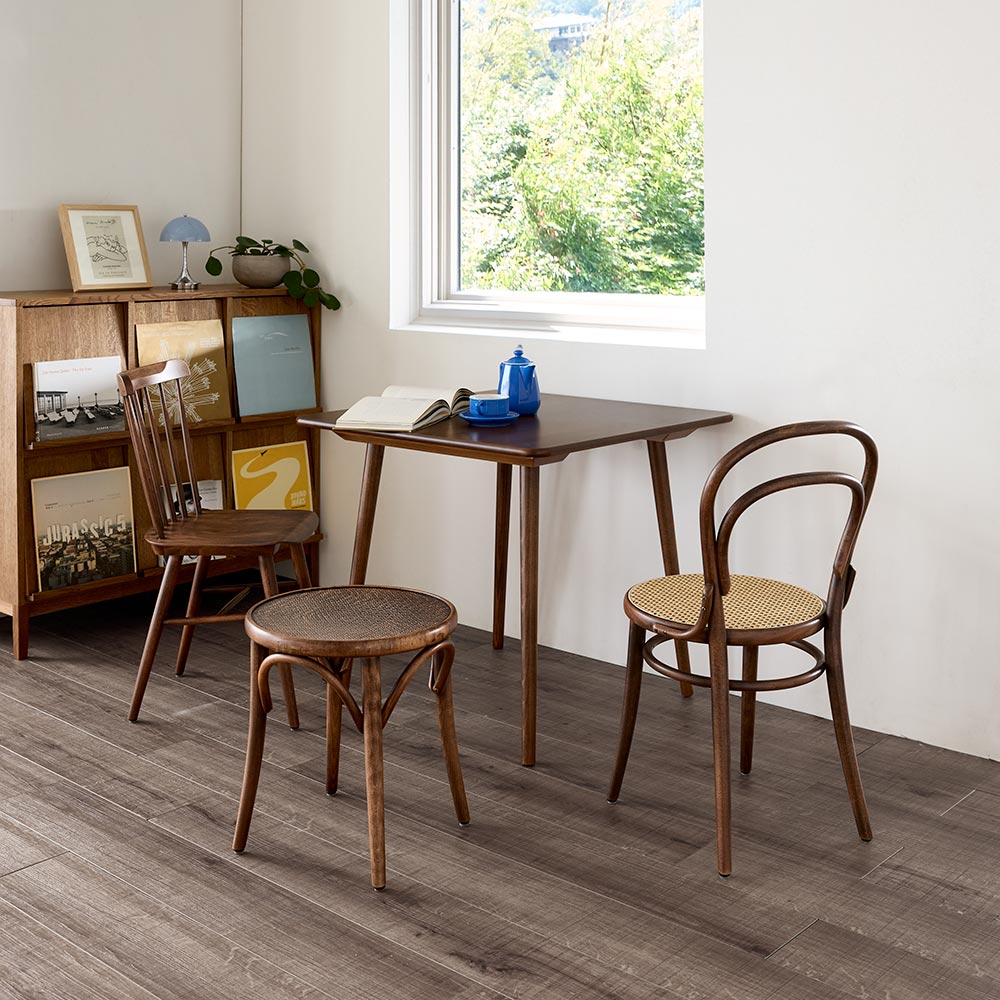 TONの別のシリーズと組み合わせてコーディネート。左からウィンザーチェア、No.60スツール、テーブル