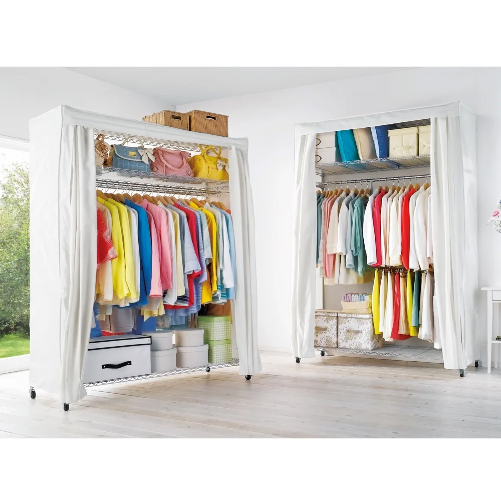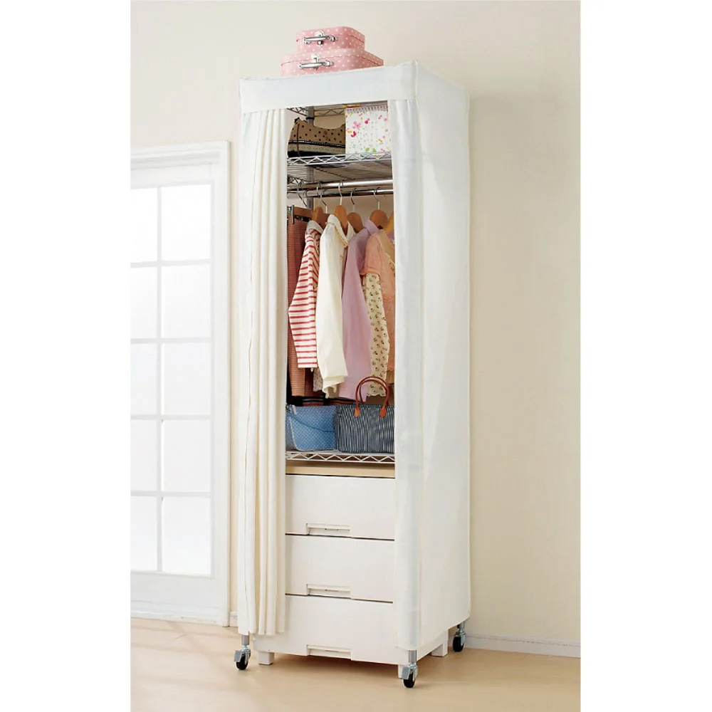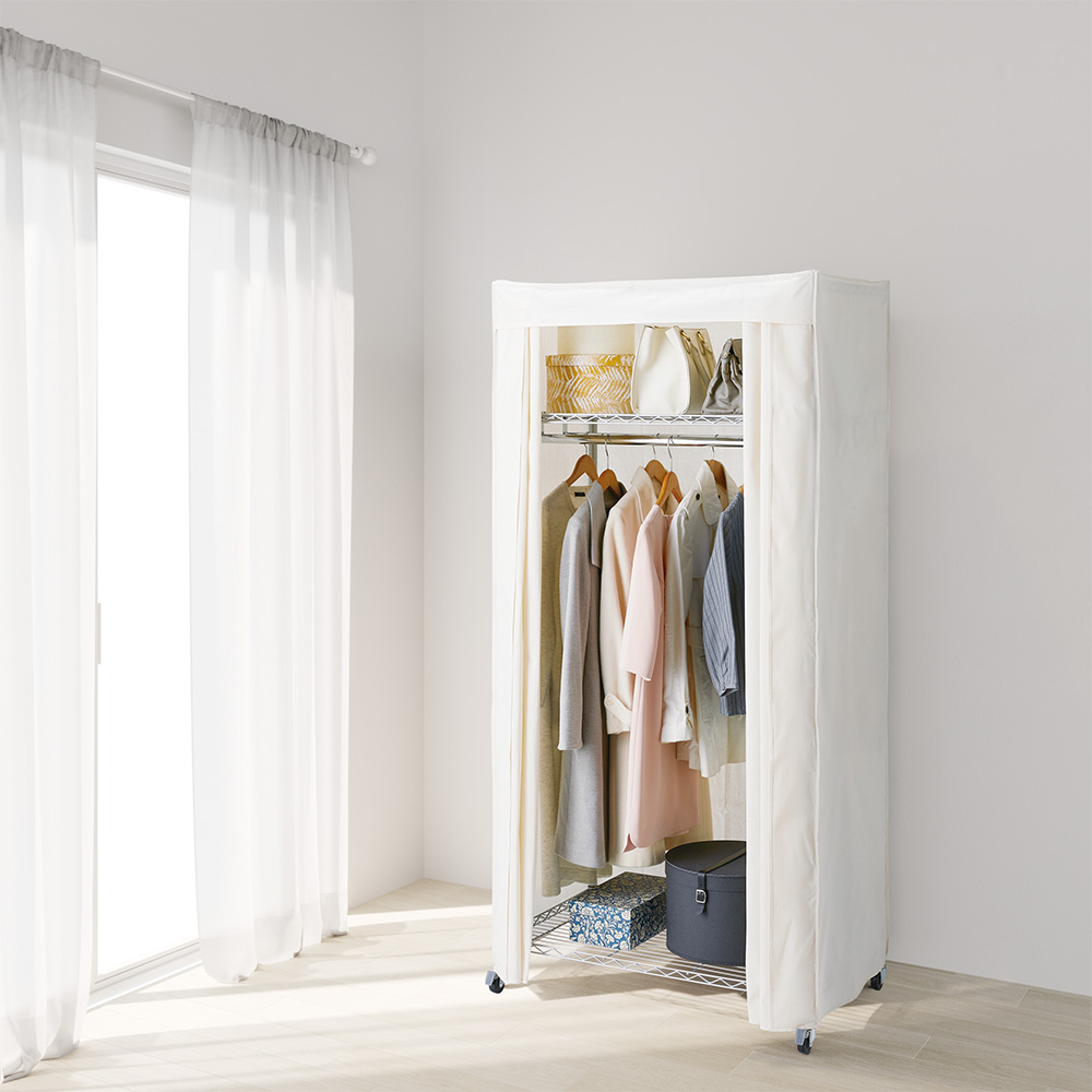 使用イメージ(ア)パイプ色シルバー 前面のカーテンを閉めれば、ホコリや日焼けから衣類を守ります。突然のお客様でも安心で見た目もすっきりします。 ※写真は別売りのロータイプ幅61cmです。