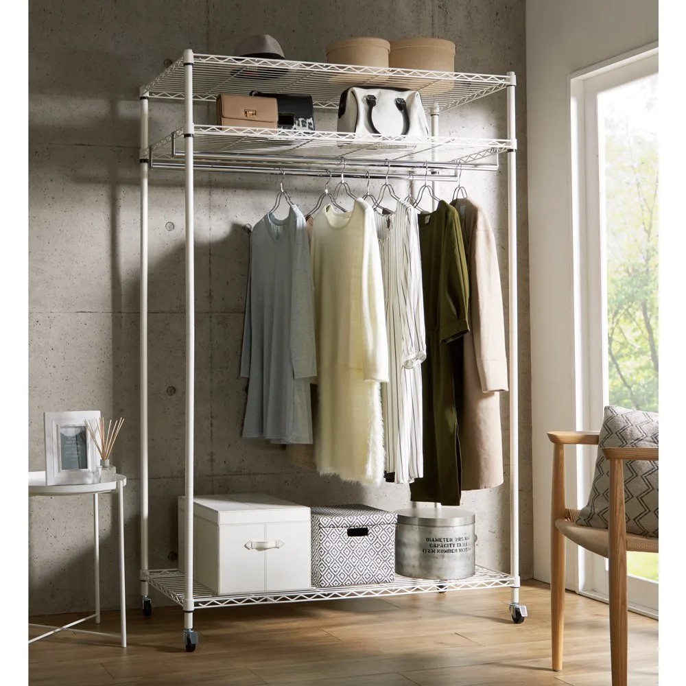 使用イメージ(ア)パイプ色シルバー 棚の位置を高めに設定すればロング丈のコートも余裕で掛けられます。 ※写真は別売りのロータイプ幅61cmです。