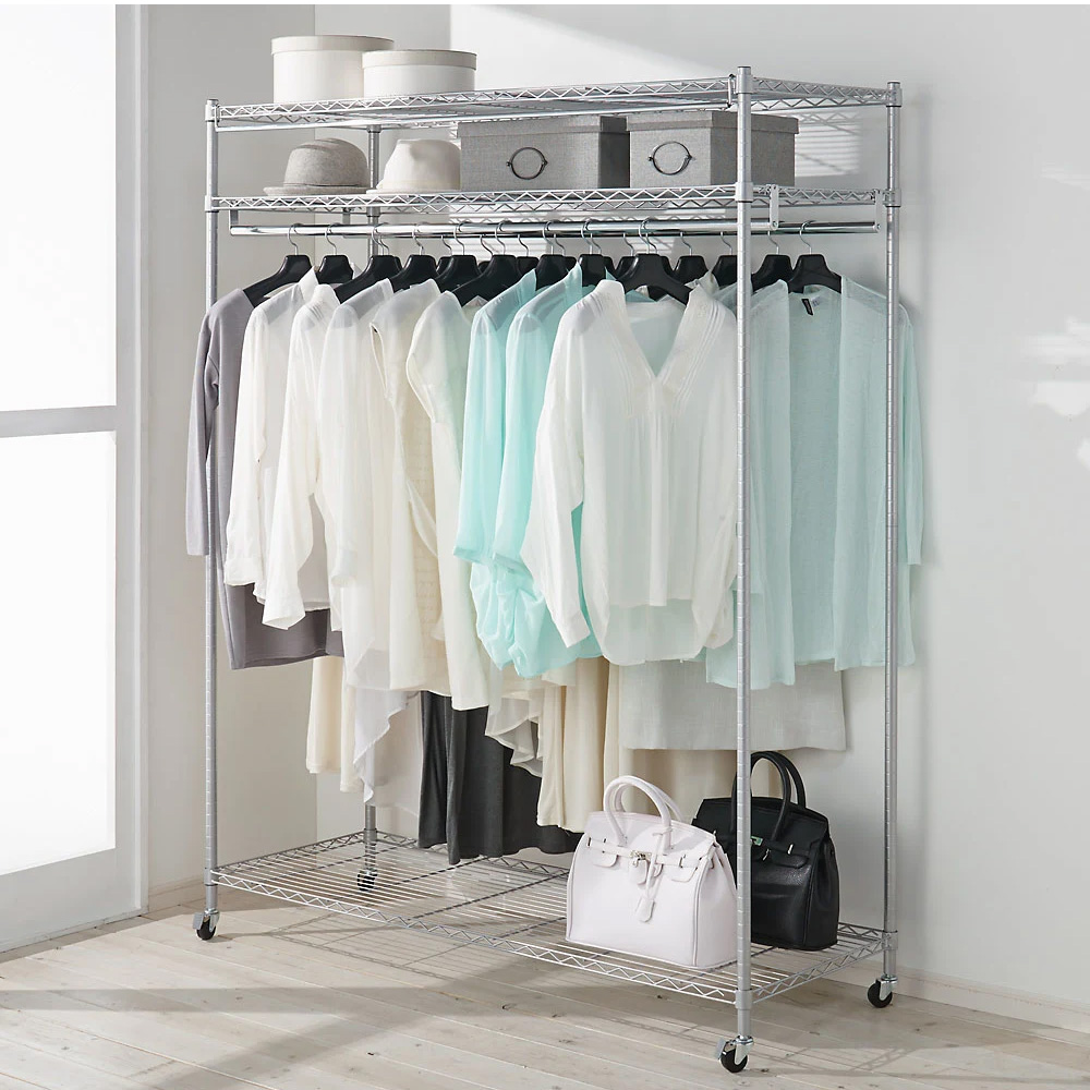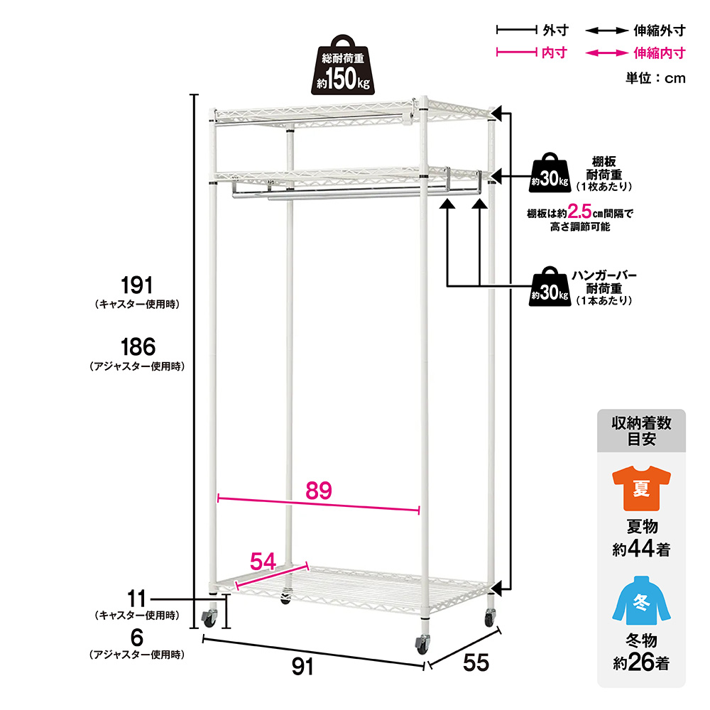 シリーズ累計17000台(※2009年12月〜2020年1月ディノスでのシリーズ累計出荷数)突破!しっかり支える強度とホコリよけのカバー付きが人気のロングセラー商品。頑丈なスチールシェルフを収納ハンガーに仕上げました。高さ調整も簡単にできる棚付きで衣類収納だけでなくバッグ収納にも便利です。衣類をたくさん収納したい方におすすめの頑丈クローゼットハンガーですハンガーバー2本付きにすることで収納力をアップさせました●ディノスでロングセラーの人気のハンガーラックです。●強度のあるスチールラックをクローゼットハンガーに仕上げました。●第三者公的機関で試験済み。耐荷重150kgだからお持ちの洋服を大量収納できます。●ハンガーバーは2本付き。前後2段掛けで効率よく収納できます。●ハンガーバーの高さは好きな位置に設定できるのでコートハンガーとしても便利です。●キャスター付きなので服を掛けたままの移動もラクラク。女性にも簡単に動かせます。●アジャスターも付属しており、キャスター無しで固定ご使用いただけます。●お届けする商品は幅91奥行55高さ191(キャスター使用時)cmの商品です棚板3枚付きだからバッグ収納や収納ケースも置けます●2.5cmピッチでフレキシブルに高さ調整できるスチール製のシェルフです。●収納する物の高さに合わせてお使いいただけます。●頑丈な棚付きだからバッグやシューズボックス、季節の家電まで収納できます。洗濯できるフルカバー付きだから大切な衣類を守ります●本体を覆うフルカバー付きだから日焼けやホコリから洋服をしっかり守ります。(棚を一番上に設定することでカバーの上からも荷物が置けます。)●カバーの色はベージュよりの白で不織布のような質感です。