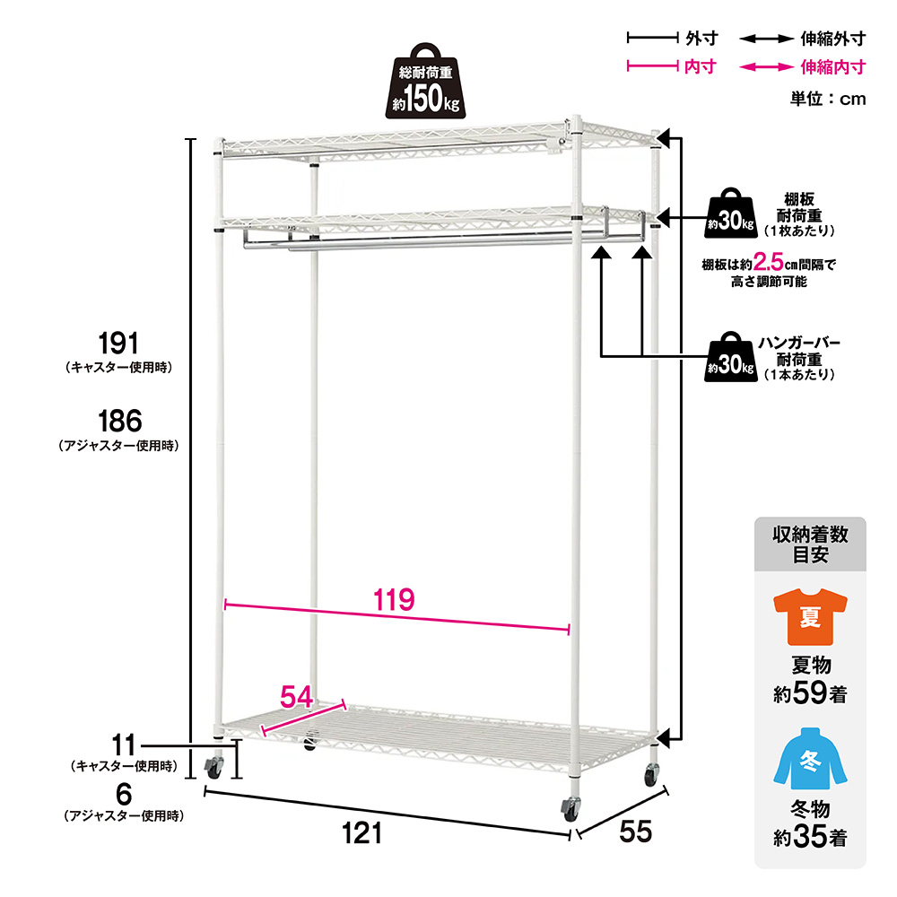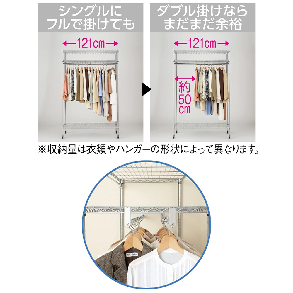 シリーズ累計17000台(※2009年12月〜2020年1月ディノスでのシリーズ累計出荷数)突破!しっかり支える強度とホコリよけのカバー付きが人気のロングセラー商品。頑丈なスチールシェルフを収納ハンガーに仕上げました。高さ調整も簡単にできる棚付きで衣類収納だけでなくバッグ収納にも便利です。衣類をたくさん収納したい方におすすめの頑丈クローゼットハンガーですハンガーバー2本付きにすることで収納力をアップさせました●ディノスでロングセラーの人気のハンガーラックです。●強度のあるスチールラックをクローゼットハンガーに仕上げました。●第三者公的機関で試験済み。耐荷重150kgだからお持ちの洋服を大量収納できます。●ハンガーバーは2本付き。前後2段掛けで効率よく収納できます。●ハンガーバーの高さは好きな位置に設定できるのでコートハンガーとしても便利です。●キャスター付きなので服を掛けたままの移動もラクラク。女性にも簡単に動かせます。●アジャスターも付属しており、キャスター無しで固定ご使用いただけます。●お届けする商品は幅121奥行55高さ191(キャスター使用時)cmの商品です棚板3枚付きだからバッグ収納や収納ケースも置けます●2.5cmピッチでフレキシブルに高さ調整できるスチール製のシェルフです。●収納する物の高さに合わせてお使いいただけます。●頑丈な棚付きだからバッグやシューズボックス、季節の家電まで収納できます。洗濯できるフルカバー付きだから大切な衣類を守ります●本体を覆うフルカバー付きだから日焼けやホコリから洋服をしっかり守ります。(棚を一番上に設定することでカバーの上からも荷物が置けます。)●カバーの色はベージュよりの白で不織布のような質感です。