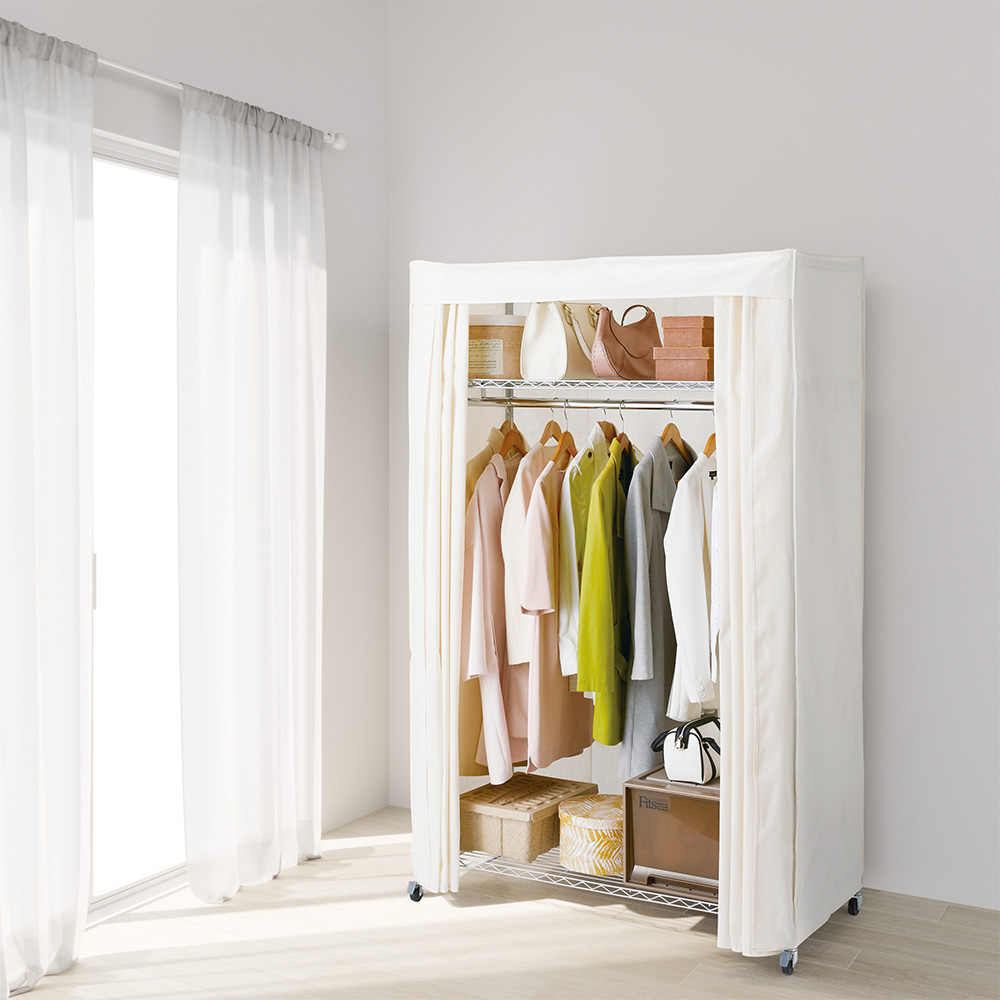 使用イメージ(ア)パイプ色シルバー 前面のカーテンを閉めれば、ホコリや日焼けから衣類を守ります。突然のお客様でも安心で見た目もすっきりします。 ※写真は別売りのロータイプ幅152cmです。