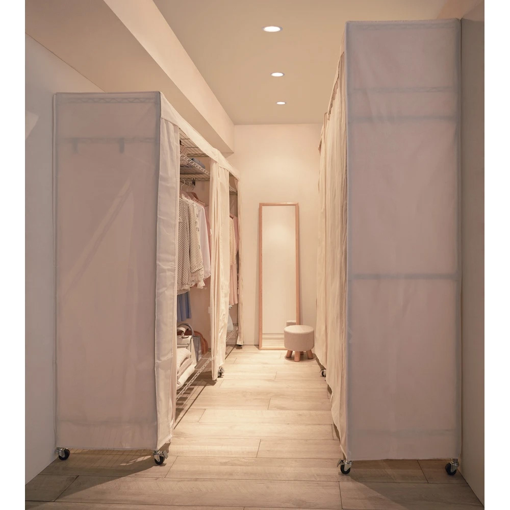 使用イメージ(ア)パイプ色シルバー 前面のカーテンを閉めれば、ホコリや日焼けから衣類を守ります。突然のお客様でも安心で見た目もすっきりします。 ※写真は別売りのロータイプ幅152cmです。