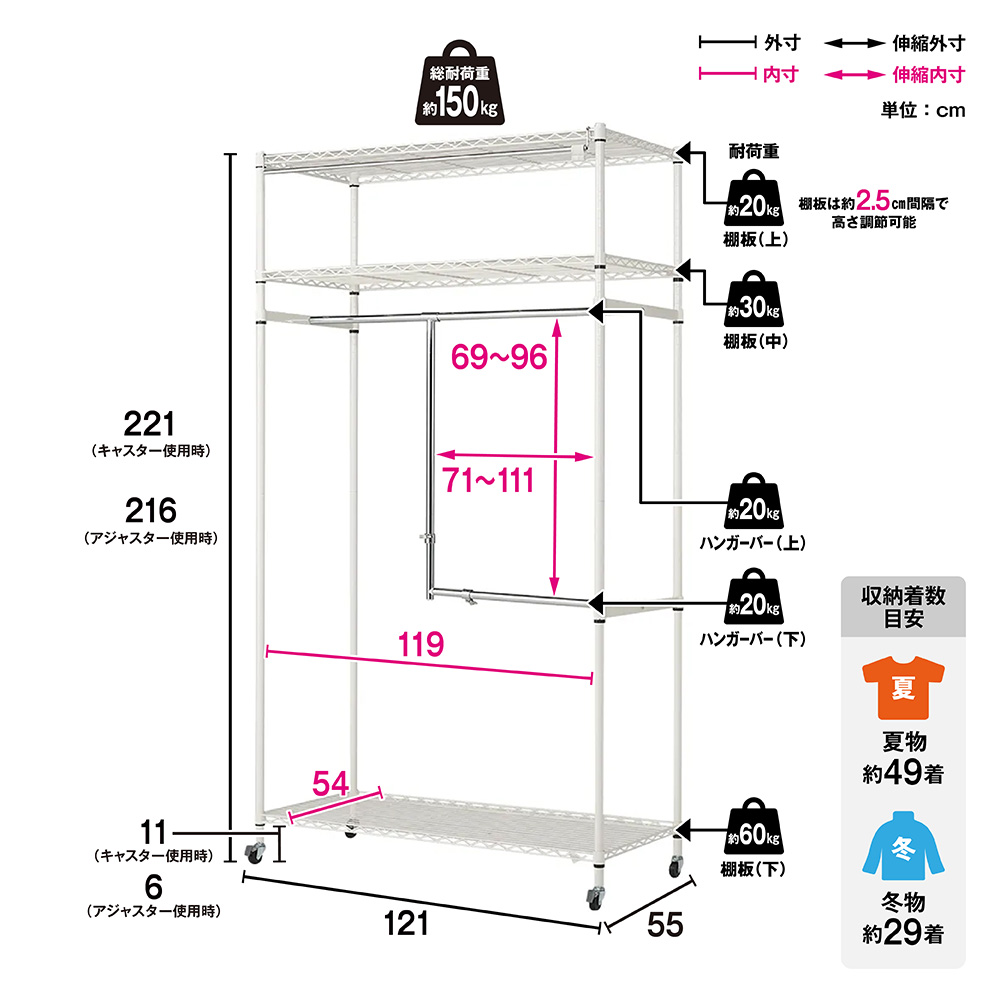 シリーズ累計17000台(※2009年12月〜2020年1月ディノスでのシリーズ累計出荷数)突破!しっかり支える強度とホコリよけのカバー付きが人気のロングセラー商品。頑丈なスチールシェルフを収納ハンガーに仕上げました。高さ調整も簡単にできる棚付きで衣類収納だけでなくバッグ収納にも便利です。衣類をたくさん収納したい方におすすめの頑丈クローゼットハンガーです上下2段掛けハンガーにすることで収納力をアップさせました●ディノスでロングセラーの人気のハンガーラックです。●強度のあるスチールラックをクローゼットハンガーに仕上げました。●第三者公的機関で試験済み。耐荷重150kgだからお持ちの洋服を大量収納できます。●上下2段掛けで収納力アップ。ロングコートも掛けられます。●ハンガーバーの高さは好きな位置に設定できるのでコートハンガーとしても便利です。●キャスター付きなので服を掛けたままの移動もラクラク。女性にも簡単に動かせます。●アジャスターも付属しており、キャスター無しで固定ご使用いただけます。●お届けする商品は幅121奥行55高さ221(キャスター使用時)cmの商品です棚板3枚付きだからバッグ収納や収納ケースも置けます●2.5cmピッチでフレキシブルに高さ調整できるスチール製のシェルフです。●収納する物の高さに合わせてお使いいただけます。●頑丈な棚付きだからバッグやシューズボックス、季節の家電まで収納できます。洗濯できるフルカバー付きだから大切な衣類を守ります●本体を覆うフルカバー付きだから日焼けやホコリから洋服をしっかり守ります。(棚を一番上に設定することでカバーの上からも荷物が置けます。)●カバーの色はベージュよりの白で不織布のような質感です。
