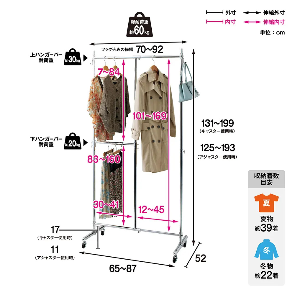 【詳細サイズ】 ※衣類の収納目安は、衣類をハンガーに掛けた際の厚さを夏物約3cm、冬物約5cmで算出。