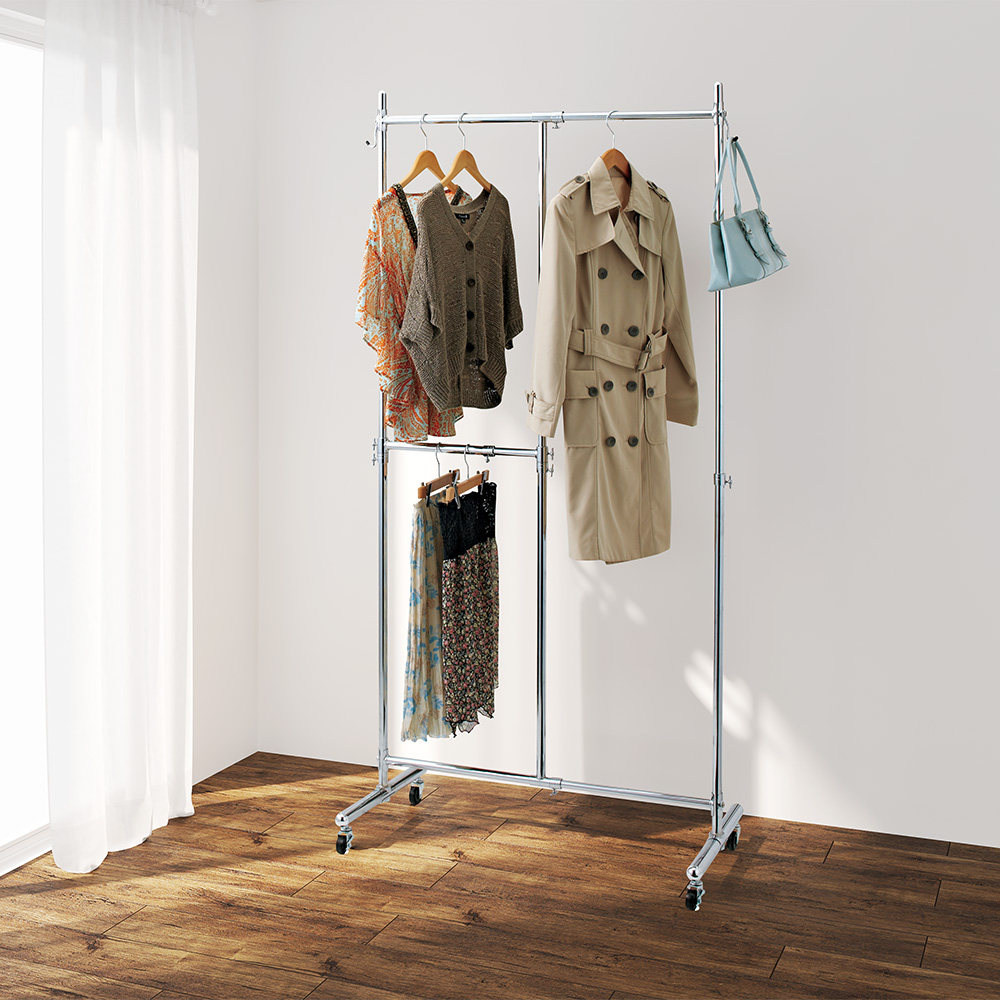 洋服好きに贈る幅と高さが変えられるプロ仕様ハンガーラック。設置スペースや収納量に合わせて幅・高さのサイズが伸縮する収納ハンガー。タンスやワードローブの代わりになる、2段掛けの大容量収納クローゼット。ハンガーラックでもう失敗したくないという方におすすめのロングセラー商品●ディノスのハンガーラックで人気の頑丈な作りの収納ハンガーラックです。●光沢のあるシルバーメッキで飽きのこないシンプルなデザインです。●衣類の収納量に応じてシングルタイプ、ダブルタイプからお選びください。頑丈さを証明するために「総耐荷重100kg」の試験をクリア(※ダブルタイプ)●総耐荷重100kgを実証するための第三者公的機関の厳しい試験をクリアしました。●肉厚なパイプやスチール製の中間リングが洋服をたくさん掛けてもしっかりと支えます。●冬物の重たい服を掛けるコートハンガーとしてもおすすめです。【POINT】〜設置場所や衣類に合わせて幅と高さが変えられます〜●本体の幅・高さが伸縮します。設置場所に合わせて無駄なく置くことができます。●2段掛けバー付きなので、ジャケットやパンツ、スカートも効率よく収納可能です。洋服を掛けたままでもラクラク移動ができる頑丈キャスター付き●衣類の重さをしっかり支えて、掃除の際にも移動が楽にできるタフなキャスター付き。●動かす必要のない場合は付属のアジャスターをお使いください。●バッグ、ベルトやストールが掛けられる便利なサイドフック付きです。