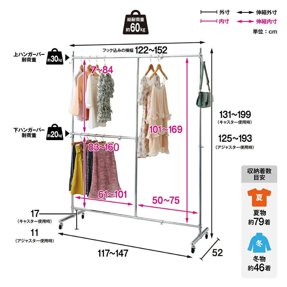 洋服好きに贈る幅と高さが変えられるプロ仕様ハンガーラック。設置スペースや収納量に合わせて幅・高さのサイズが伸縮する収納ハンガー。タンスやワードローブの代わりになる、2段掛けの大容量収納クローゼット。ハンガーラックでもう失敗したくないという方におすすめのロングセラー商品●ディノスのハンガーラックで人気の頑丈な作りの収納ハンガーラックです。●光沢のあるシルバーメッキで飽きのこないシンプルなデザインです。●衣類の収納量に応じてシングルタイプ、ダブルタイプからお選びください。頑丈さを証明するために「総耐荷重100kg」の試験をクリア(※ダブルタイプ)●総耐荷重100kgを実証するための第三者公的機関の厳しい試験をクリアしました。●肉厚なパイプやスチール製の中間リングが洋服をたくさん掛けてもしっかりと支えます。●冬物の重たい服を掛けるコートハンガーとしてもおすすめです。【POINT】〜設置場所や衣類に合わせて幅と高さが変えられます〜●本体の幅・高さが伸縮します。設置場所に合わせて無駄なく置くことができます。●2段掛けバー付きなので、ジャケットやパンツ、スカートも効率よく収納可能です。洋服を掛けたままでもラクラク移動ができる頑丈キャスター付き●衣類の重さをしっかり支えて、掃除の際にも移動が楽にできるタフなキャスター付き。●動かす必要のない場合は付属のアジャスターをお使いください。●バッグ、ベルトやストールが掛けられる便利なサイドフック付きです。
