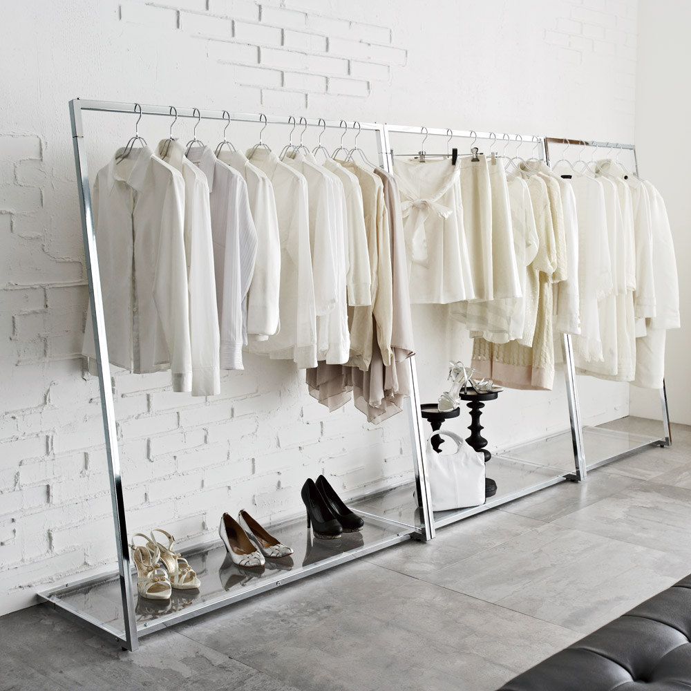 高級ブティックのようなリッチな佇まいにお気に入りのファッションを飾って。壁面に設置しやすい圧迫感のない都会的なデザインは玄関、リビングルーム、寝室など場所を選ばずお使いいただけます。落ち着いたクールなシルバー色でどんなインテリアにも調和します。フジテレビにて毎週木曜日夜10時から放送中の2023年7月期ドラマ『この素晴らしき世界』に撮影協力で使用されました!美しいデザインと強度を併せ持つL字型のハンガーラック。●強度のあるスチール角パイプをフレームに使用し、歪まない耐久性を持たせました。●こぼれ止め付きなので衣類を掛けたハンガーが落ちにくい仕様となっています。●エッジの効いたフレームの脚元にはバッグや靴をディスプレイできるアクリル棚付きです。■床接地面にはアジャスター付きでぐらつきなども簡単に調整が可能です。ラグジュアリーなL型のフォルムが壁面に圧迫感なくフィットします。●シンプルなデザインながら掛けやすく、取り出しやすい収納ハンガーです。●靴やバッグ収納ができるオープンタイプで置き場所を選びません。●リビングルームや並べてウォークインクローゼットにも、玄関のコートハンガーとしてもご使用いただけます。■シンプルな形なのでたくさん並べて使用しても美しく。ブティックのような衣類収納が楽しめます。さりげなくあしらわれた透明なアクリル板が上品な輝き■下部にはアクリルプレートを設置。お気に入りの靴やカバンをディスプレイするように収納可能。■アクリルなので拭き掃除も簡単。もし汚れてもサッと一拭きで美しく。クールなシルバー色が内装材を選ばずオールマイティに活躍■本体はシンプルかつクールなシルバー色。どんな内装材にも調和しやすい万能カラーです。■お部屋のインテリアコーディネートに迷う場合は定番のこのシルバー色がおすすめです。簡単組み立てのシンプルな形■パーツが少ないため組み立ても簡単。直ぐにご使用いただけます。