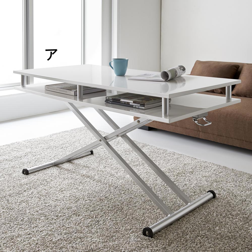 ガス圧式昇降テーブルなので天板の高さ調節がラクラク!ローテーブルからダイニングテーブルまで幅広くお使い頂けます。在宅勤務、テレワークにも最適。サッとしまえる棚付きリフトテーブルで天板すっきり!!リモコンや雑誌、ノートパソコンなどリビング周りのアイテムが収納できる便利なセンターテーブル。二重天板なのでサッと出し入れができるので、食事のときなどにさっと天板上をきれいにできます。また、ガス圧式昇降テーブルなので天板の高さ調節もラクラク。高さ調節を行えばセンターテーブルからダイニングテーブルまで幅広くお使い頂けるリフティングテーブルです。〜収納力を兼ね備えた二重天板〜◆天板と中天板の間には高さ約8cmの空間があるので小物の収納に便利です。◆リモコンやノートパソコンなど、リビング周り置きがちな小物をさっとしまえば天板を広々使えます。◆天板の下にさっと隠すことができるので来客時も安心です。〜幅広いシーンに対応する昇降式〜◆天板下のレバー操作でテーブルの高さを簡単に変えることができます。 ※テーブルを下げるときはレバーを握って天板か中天板の中央に手を置き、体重をかけて下げます。◆幅102cmタイプは高さ46〜81cm、幅120cmタイプは高さ47〜83.5cmまでの高さで無段階調節可能です。◆天板高さを低すれば、ソファーや座椅子・クッションと合わせて使えるフロアテーブルとして。ソファーサイドテーブルとしても!!◆天板高さを高くすれば、椅子(チェア)と合わせて食事をするダイニングテーブルに。◆お部屋の様々なシチュエーションでお使い頂けます。〜移動がラクなキャスター付き◆脚部にはキャスターが付いているので、お掃除などの際に移動がラクにできます。◆ダイニングからリビングへ、作業スペースなどお部屋での活動が多いテーブルは、フットワークも軽い優れもの。【バイヤーからのメッセージ】◆上質で快適な暮らし、デザイン性だけでは無く、機能性も兼ね備えたバイヤー一押しのオシャレな昇降テーブルです。◆デザイナー、設計担当者と何度も交渉、サンプルチェックも繰り返し行い、厳しい基準をクリアした価値ある作りです。◆リビング、ダイニングルームだけでなく、ゲストルームに設置してお客様をお迎えしても、素敵な造りとなっております。◆お部屋に置くだけで、洗練された雰囲気を演出してくれる、通販のディノスがおすすめする一品です。〜お客様から続々と口コミをいただいております〜◆高さの調整も簡単にできるし移動もスムーズでお掃除も苦になりません。ホワイトカラーも上品でお気に入りです。ダイニングテーブルにも机にもなるので大満足しています。◆ソファー用に購入しました。主にくつろぐ時は低く、食事の時などは高くといった感じで使用しています。使い勝手はかなりよいのではないかと思います。どれにしようか?色々悩みましたが昇降式にしてよかったです。天板の艶もよい感じです。◆高さを用途によって変えられるは、とても便利。棚付きで、物を下に入れられるので、テーブルの上は常にきれいにしていられるのもとても良い。ただ、通常は高さを一番低くして使っているのだが、その場合はテーブルの幅より脚が少しはみ出るので、つまずいてしまう事も・・・。総合的に見て90パーセント満足しています。