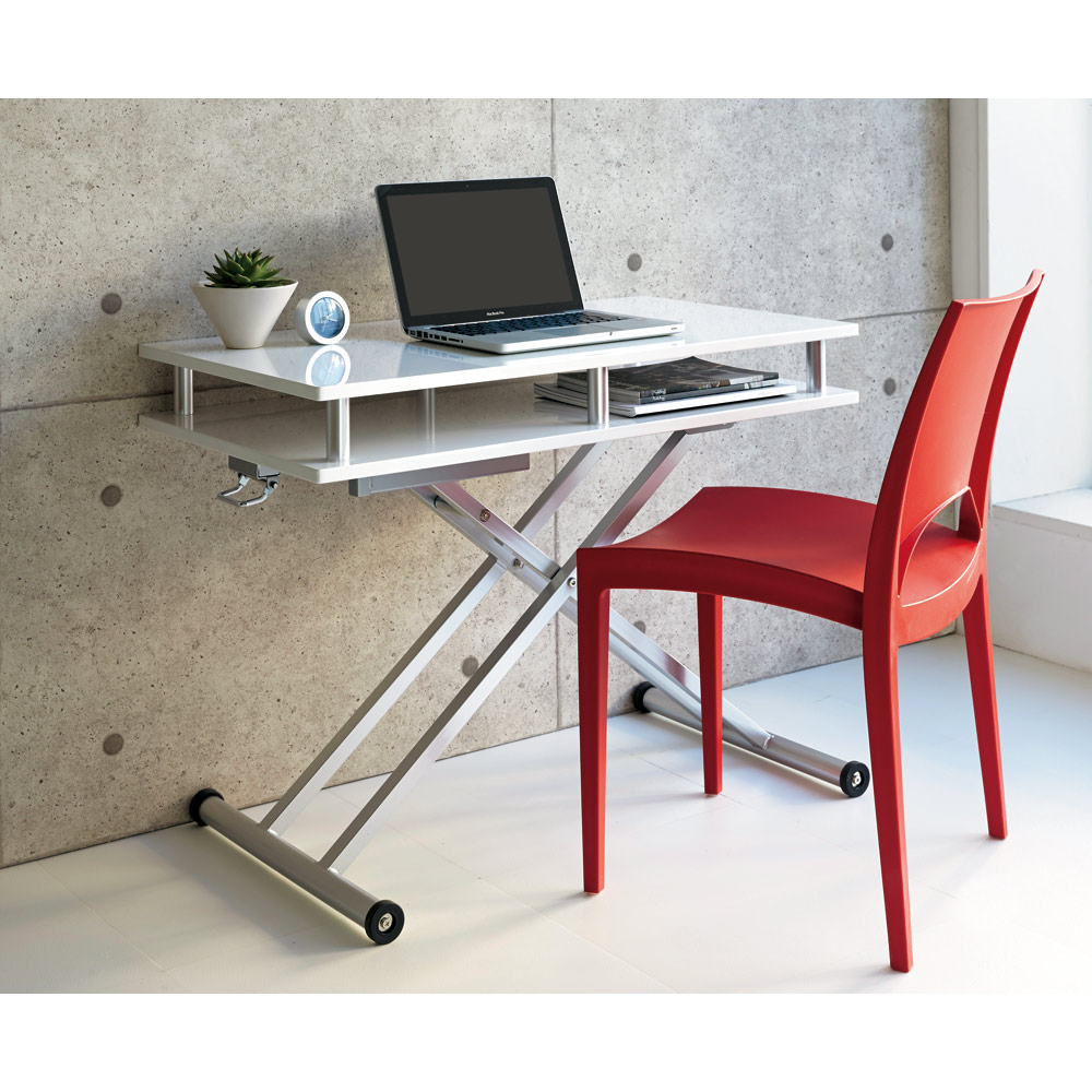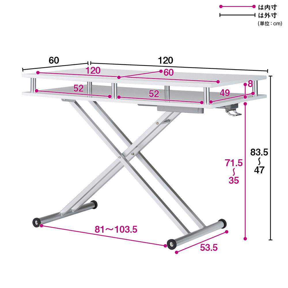 (ア)ホワイト サッとしまえる棚付きリフトテーブルで天板すっきり!! ※高さ47cm時