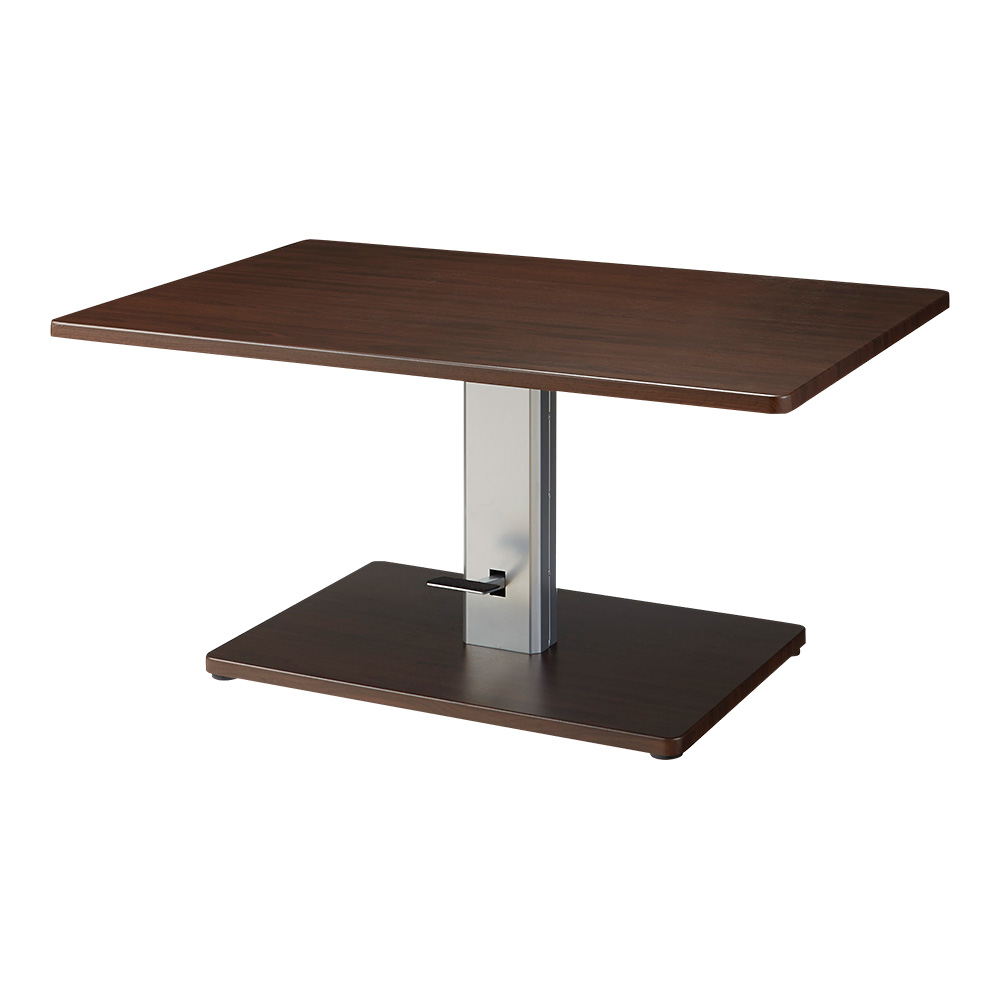 ボリュームのある天板なのに、高さ調節が簡単なLD兼用昇降テーブル。くつろぐ時は低め、食事では高め。シーンに合わせて天板の高さが55〜75cmの間で調整できるリフティングテーブルです。ボリュームのある天板の昇降テーブル奥行80cmのゆったりサイズの昇降式テーブル。天板の高さは55〜75cmまで高さを調整できるので、センターテーブルとしてもダイニング用テーブルとしてもゆったり。ワーキングデスク・おけいこ机としてなど幅広い目的でもお使いいただけます。用途に合わせて天板高さを調節◎テーブルは天板高さ55〜75cmの間で無段階調節可能です。 ◎高さ調節はフットペダルを踏みながら天板に手を添えて上げ下げするだけの簡単操作。◎椅子、ソファーへの立ち座りの際にも邪魔になりにくいセンターレッグ構造。 ◎底面にはアジャスターが6個付いているので、無垢材のフローリングに設置しても、がたつかないように調整できます。こだわりの天板◎木目柄が美しいダークブラウンは、水や汚れがしみこみにくい素材PVCを使用。◎ホワイトは、光沢が美しいポリエステル化粧板を使用。 ◎両色ともに簡単な汚れ・水に配慮した素材なので、食事用のダイニングテーブル、学習机としてもお使いいただけます。 ◎天板と台座は同じ素材を使用してたデザイン性の高いテーブル。 ◎脚部ベースは、エッジの角を抑えた仕様。足をぶつけても痛くありません。