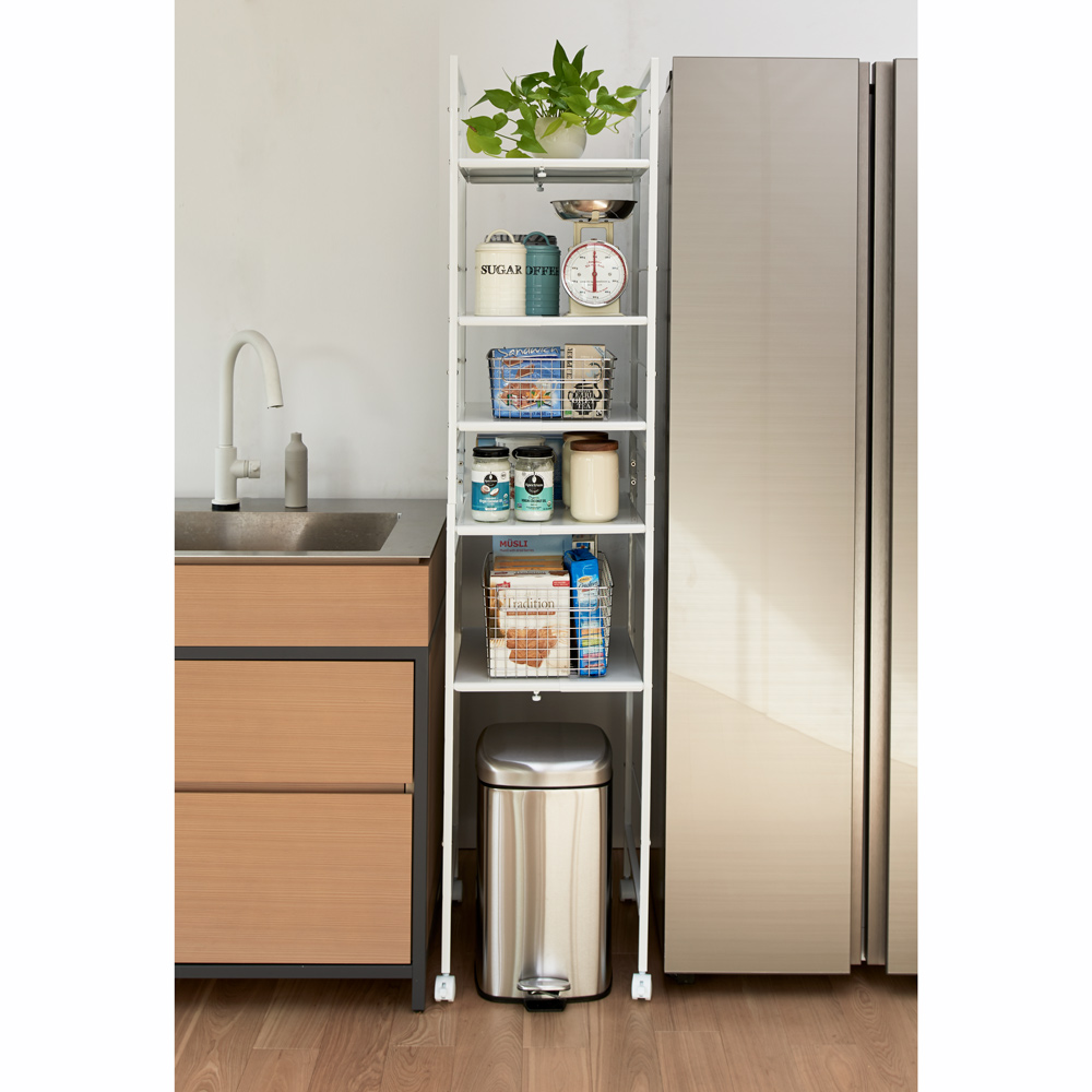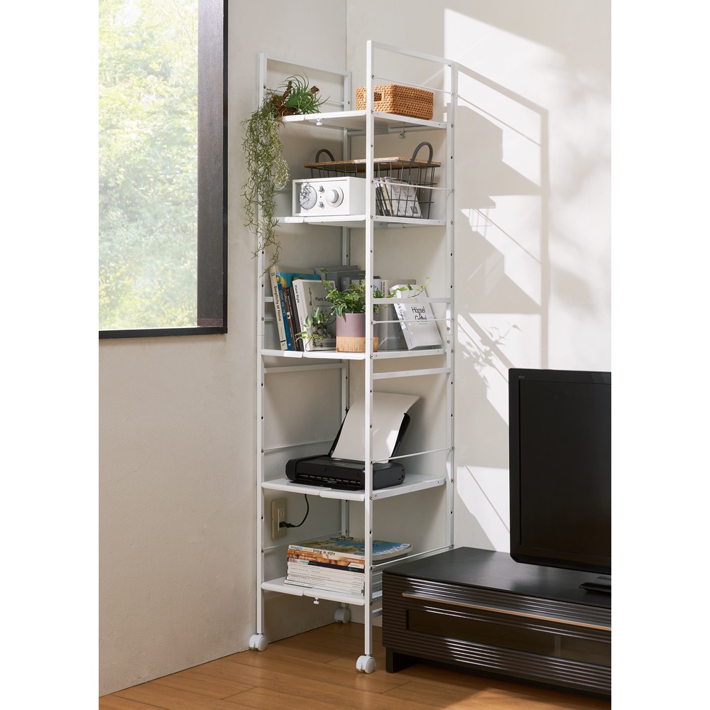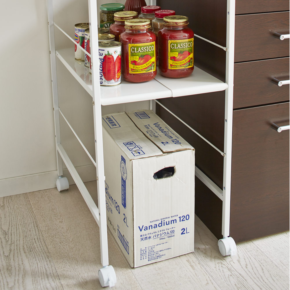 隙間の空間や収納物の量にあわせて、ピッタリと幅伸縮するキッチンラック。キャスター付きで奥までたっぷり収納できるタワーラックタイプのキッチン収納棚です。オーダー家具感覚ですき間にぴったり収まるので、シンク横や冷蔵庫の隣などのデッドスペースを有効活用できます。アルミホイルやインスタント食材・ペットボトル飲料など、普段よく使うキッチン用品のストッカーとしても大活躍です。キッチンの無駄なスキマを充実の収納スペースに◆シンクの横や冷蔵庫の隣、壁と食器棚の間など…ご自宅のキッチンに無駄になっている隙間空間はありませんか。◆幅伸縮のサポートラックなので、空いている場所やすき間に合わせてピッタリと簡単に収納を増やすことができます。◆オーダー家具のように、お好みの幅ですきまにぴったりと設置できる便利なキッチン収納です。◆ねじを緩めるだけで、女性でも簡単に幅を調整できます。◆わずかなすき間の空間が、充実のキッチンストッカー・キッチン収納に。◆インスタント食品やペットボトル等の食品ストック、アルミホイルやサランラップ、キッチンペーパーなどのキッチン用品まで、まとめてすっきりと保管できます。取り出しやすさにこだわった、便利なキッチンアイデア収納◆オープンラックタイプの収納棚なので、使う頻度の高い調味料や食材のストックをスムーズに取り出すことができます。◆本体はキャスター付で、隙間に収めても下段の奥の物まで取り出しやすいよう工夫しています。◆スチールの棚板は、収納物に合わせて10cm間隔で高さを調節できます。◆ラックの横にはこぼれ止めが付いているので、収納物の落下を防いで安心です。ホワイトの収納ラックでキッチンを清潔な空間に◆白の隙間ラックが、キッチンを清潔感のあるスッキリとした印象に変身させます。◆紛体塗装のスチール製で、汚れをサッと簡単にふき取れます。◆キャスター付なので、床のお掃除もラクラクです。キッチン以外にも活躍の場がたくさん!◆シンプルなデザインで置き場所を選びません。◆洗面所や子供部屋、書斎、テレワーク時のデスク横など自宅の色々な場所で使えるラックです。