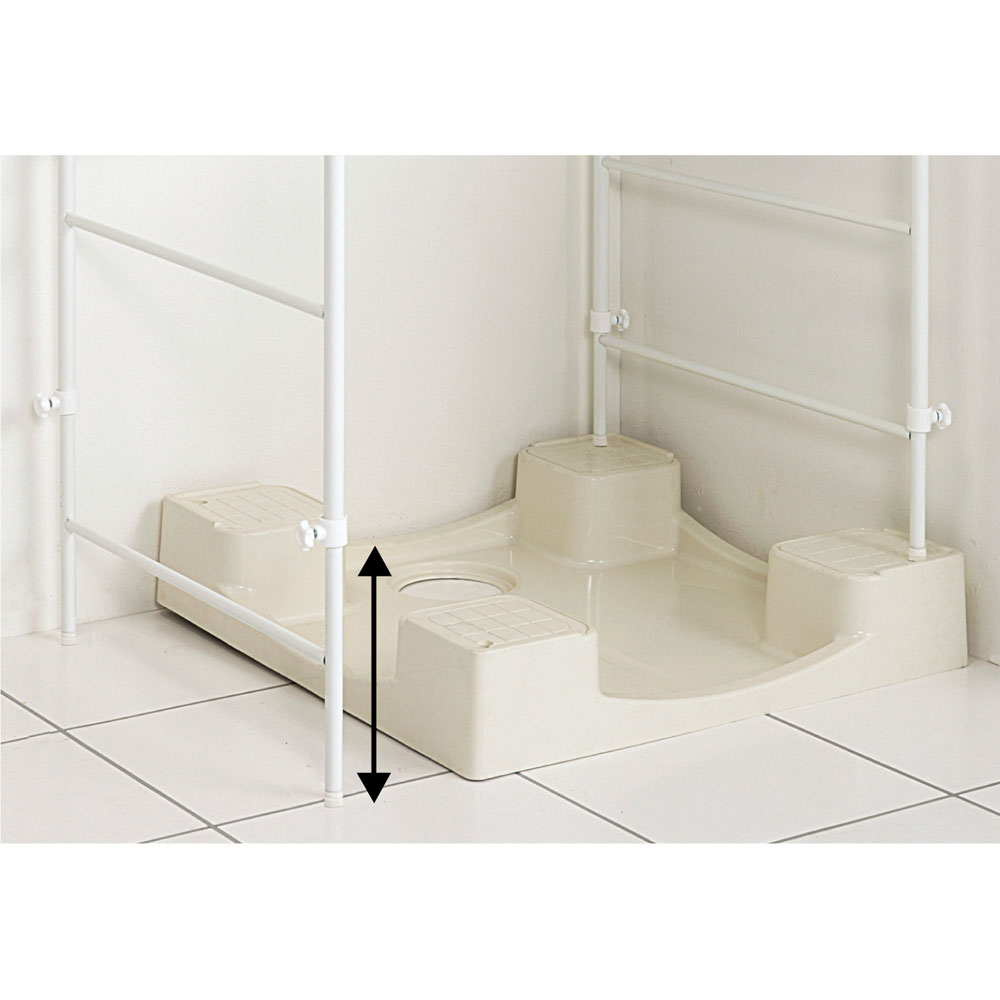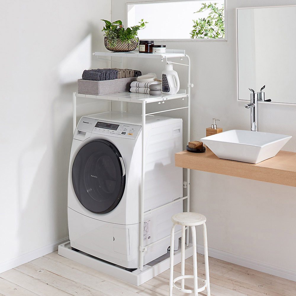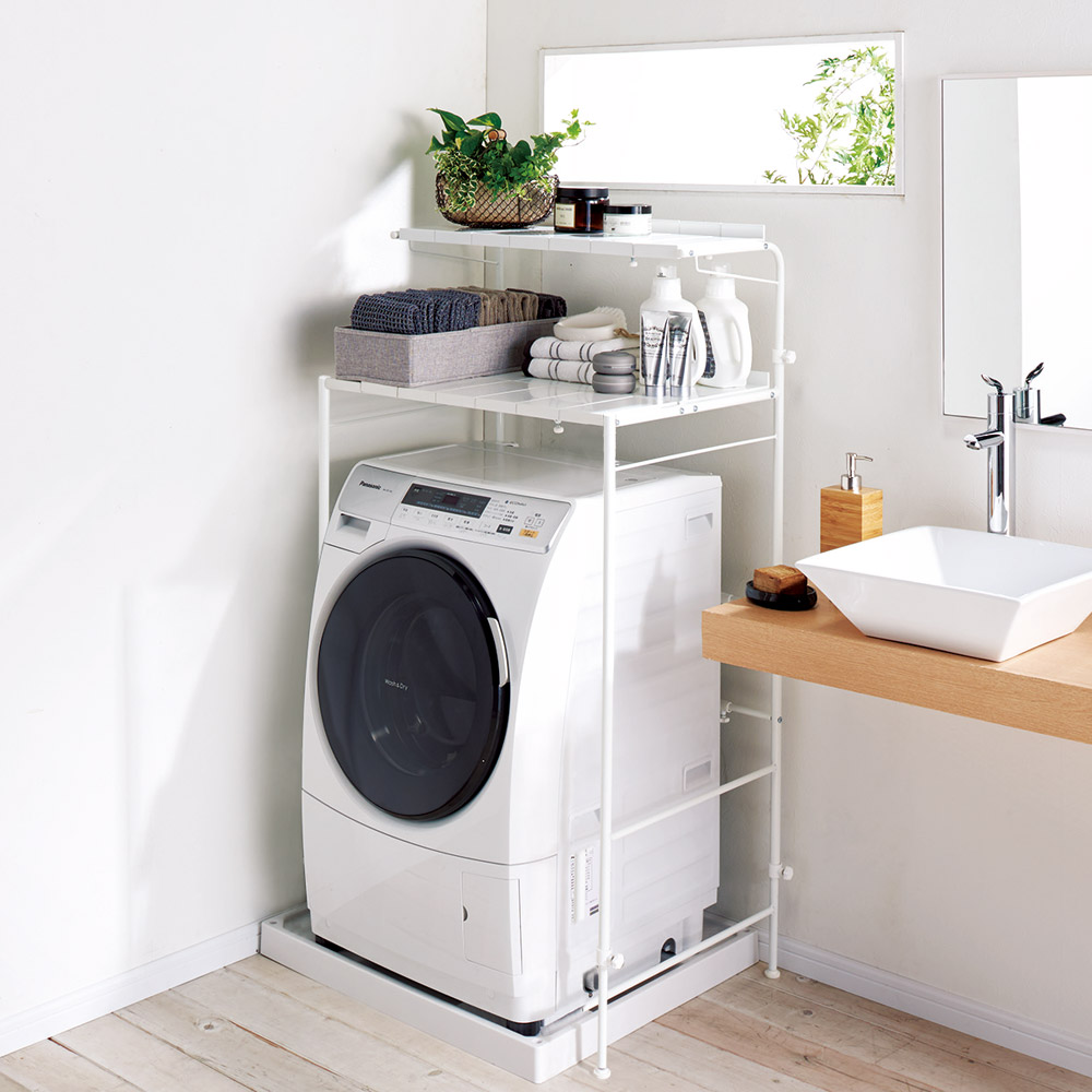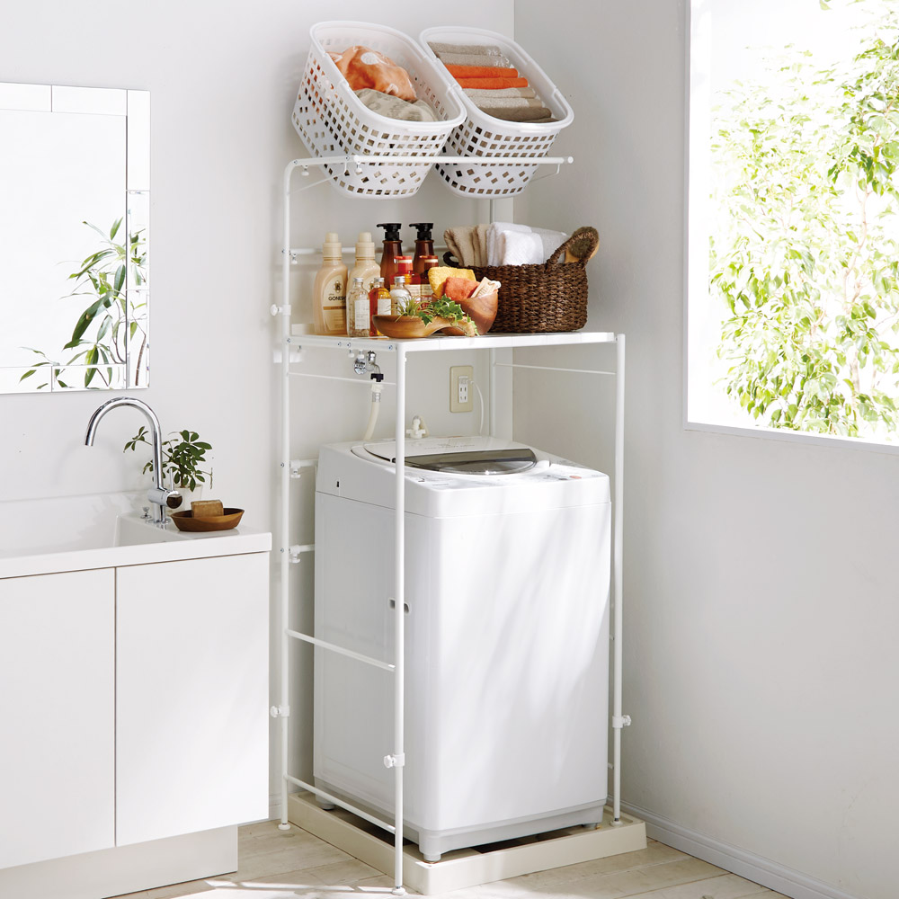 防水パンや洗濯機周りの段差を32cmまでまたげるランドリーラック。幅のサイズと棚板の高さも自由に調整できるので、蛇口を避けながら洗濯機の大きさに合わせてぴったり設置ができます。※当商品は、洗濯機を動かさずにラックを設置可能です。どんな場所でも柔軟に対応できるアイデア満載のランドリーラックです!●「脚の高さ調節」「幅の伸縮」「棚の高さ調整」の3つの大きな特徴をもったランドリー・サニタリーラックです。●収納がたっぷりできる棚3段タイプ、窓下にぴったり収まる棚2段タイプ、洗濯カゴが上にのせられる棚1段・バスケット2個付きタイプの計3つをご用意しております。●本体の全体高さは約149〜187cmに調整可能です。狭い場所や高窓を避けて低めの設置もできます。●洗濯機対応内寸は幅80cm、高さ135cmまでになります。 ・防水パンが壁際にあるのでラックが設置できない... ・洗面所に段差があって収納場所がつくれない... ・蛇口が洗濯機のすぐ後ろにあるのでランドリーシェルフが置けない... そんなお悩みをお持ちの方へぜひともオススメの商品です。脚の伸縮は32cmまで!高い段差や防水パンもラクラクまたぐ優れものです!●脚部が伸縮するので床に段差がある脱衣所や洗面所でも気にせず使用することができます。●マンションや集合住宅に見られる壁付の防水パンでも、脚の高さを左右で変えてしっかり設置することができます。●脚には微調整できるアジャスターが付いているので、柔らかい床でも安心して使うことができます。●調整方法はツマミをまわして固定するだけの簡単構造です。幅は69cm〜89cmまで自在にサイズが変えられる伸縮式です●幅は小型〜大型洗濯機まで対応できる幅伸縮式です。●ドラム式・蓋付き問わずお好みの洗濯機やスペースに合わせてぴったり設置ができます。●調整方法は棚の下にあるツマミをゆるめて固定するだけの簡単構造です。棚はたっぷり収納ができる奥行49cm!高さを変えれば後ろの蛇口も避けられます!●下段の棚板はボトル洗剤やバスタオルがしまえる深型の奥行49cmです。●ハンガーが縦に置けるサイズなので、かごやバスケット・衣類の収納としても便利です。●棚板は置きたい幅に合わせて枚数を調整できる分割式です。●棚板の素材は水や汚れに強い樹脂製。作業台としても便利です。●上下の収納棚の間隔は約32〜41cmに調整可能なので高めのコンセントや蛇口を避けて使うことができます。