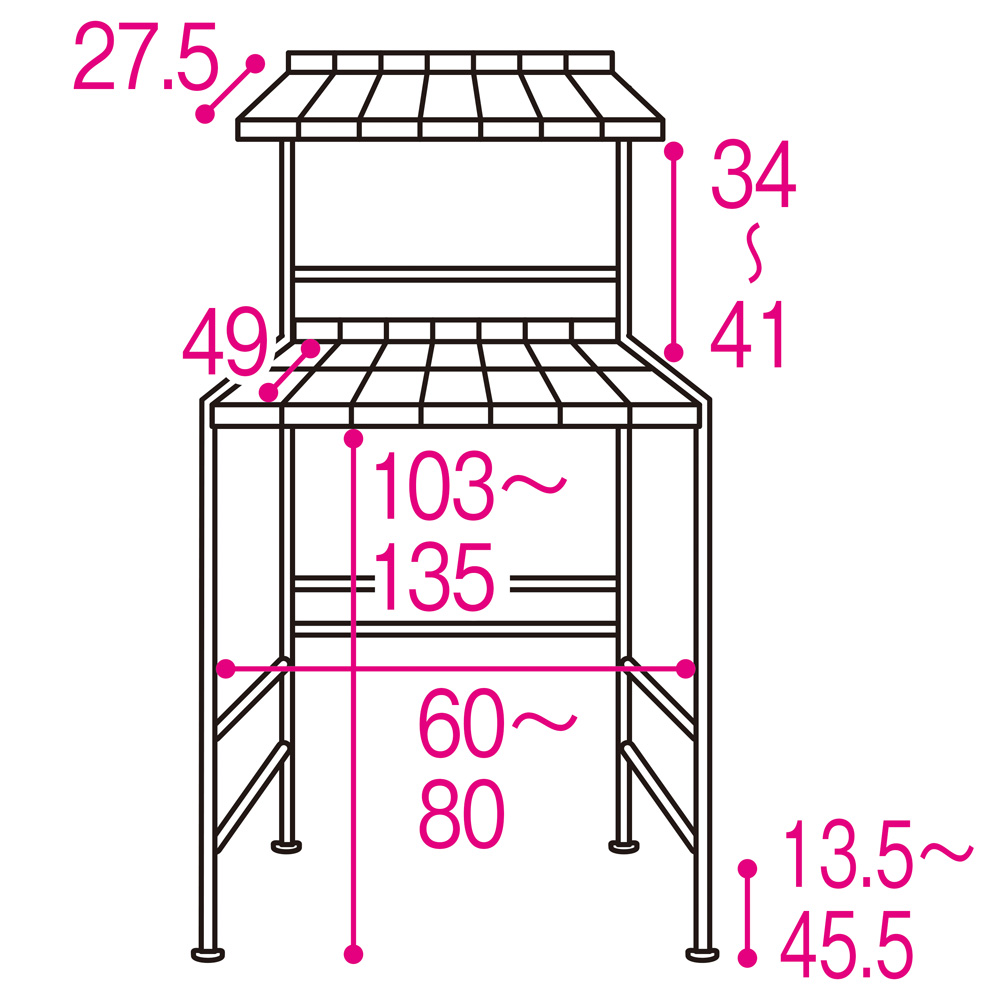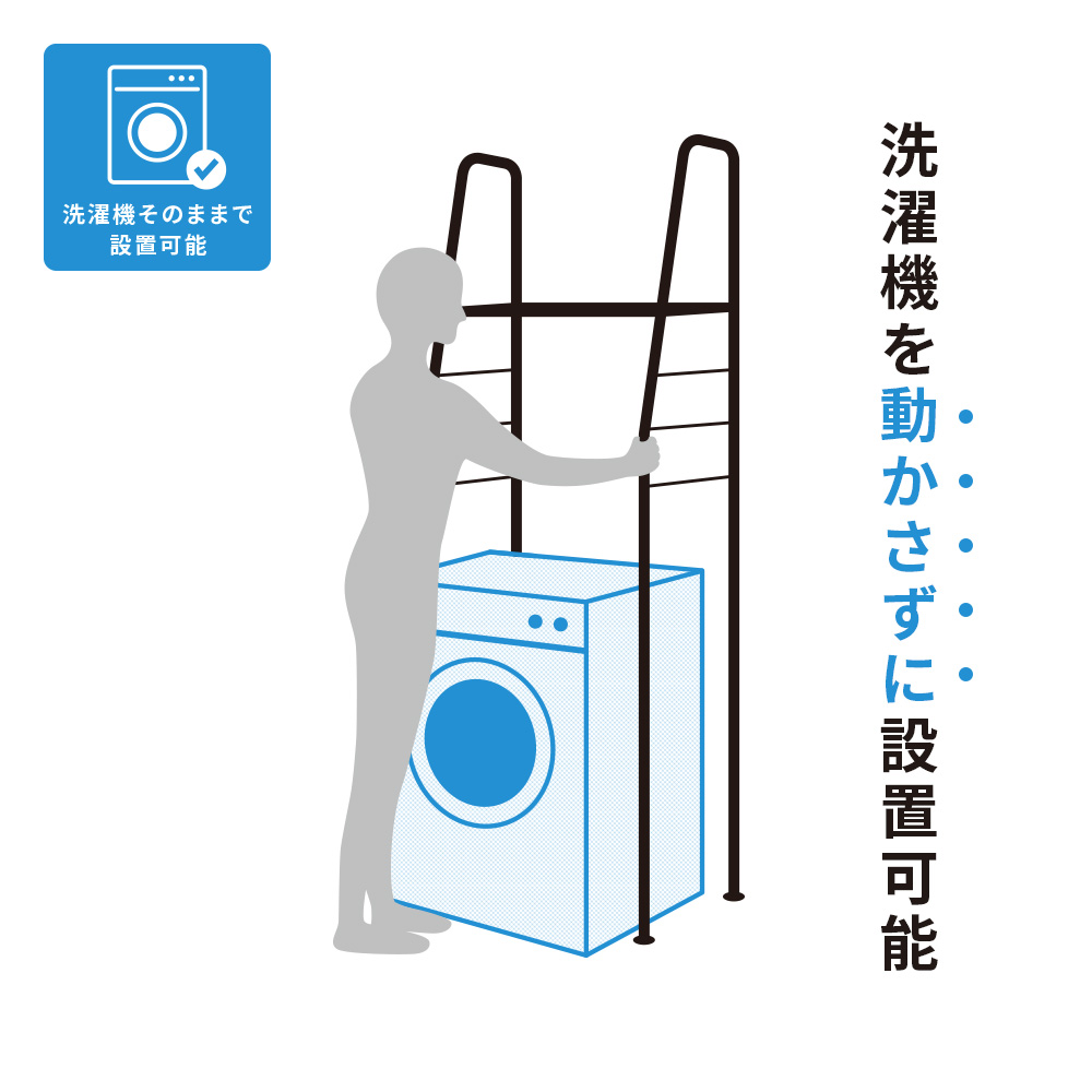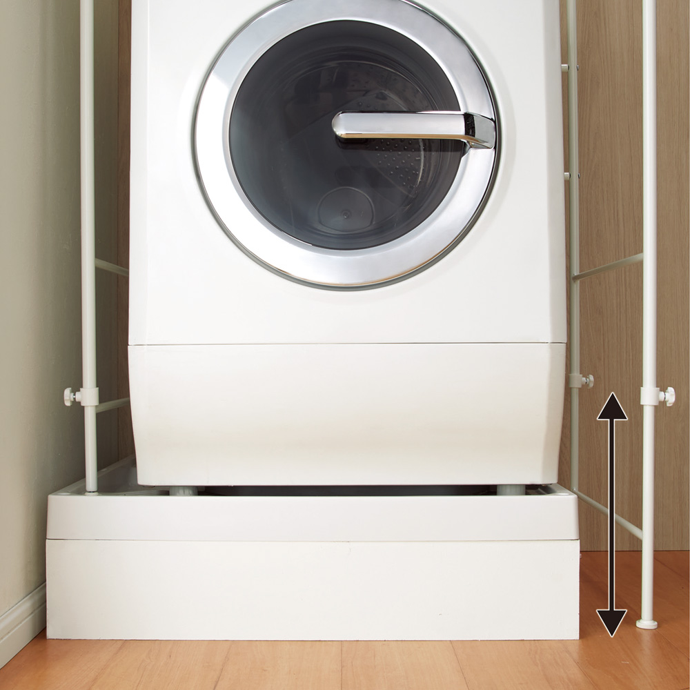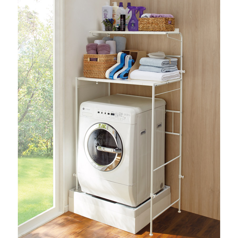 防水パンや洗濯機周りの段差を32cmまでまたげるランドリーラック。幅のサイズと棚板の高さも自由に調整できるので、蛇口を避けながら洗濯機の大きさに合わせてぴったり設置ができます。※当商品は、洗濯機を動かさずにラックを設置可能です。どんな場所でも柔軟に対応できるアイデア満載のランドリーラックです!●「脚の高さ調節」「幅の伸縮」「棚の高さ調整」の3つの大きな特徴をもったランドリー・サニタリーラックです。●収納がたっぷりできる棚3段タイプ、窓下にぴったり収まる棚2段タイプ、洗濯カゴが上にのせられる棚1段・バスケット2個付きタイプの計3つをご用意しております。●本体の全体高さは約149〜187cmに調整可能です。狭い場所や高窓を避けて低めの設置もできます。●洗濯機対応内寸は幅80cm、高さ135cmまでになります。 ・防水パンが壁際にあるのでラックが設置できない... ・洗面所に段差があって収納場所がつくれない... ・蛇口が洗濯機のすぐ後ろにあるのでランドリーシェルフが置けない... そんなお悩みをお持ちの方へぜひともオススメの商品です。脚の伸縮は32cmまで!高い段差や防水パンもラクラクまたぐ優れものです!●脚部が伸縮するので床に段差がある脱衣所や洗面所でも気にせず使用することができます。●マンションや集合住宅に見られる壁付の防水パンでも、脚の高さを左右で変えてしっかり設置することができます。●脚には微調整できるアジャスターが付いているので、柔らかい床でも安心して使うことができます。●調整方法はツマミをまわして固定するだけの簡単構造です。幅は69cm〜89cmまで自在にサイズが変えられる伸縮式です●幅は小型〜大型洗濯機まで対応できる幅伸縮式です。●ドラム式・蓋付き問わずお好みの洗濯機やスペースに合わせてぴったり設置ができます。●調整方法は棚の下にあるツマミをゆるめて固定するだけの簡単構造です。棚はたっぷり収納ができる奥行49cm!高さを変えれば後ろの蛇口も避けられます!●下段の棚板はボトル洗剤やバスタオルがしまえる深型の奥行49cmです。●ハンガーが縦に置けるサイズなので、かごやバスケット・衣類の収納としても便利です。●棚板は置きたい幅に合わせて枚数を調整できる分割式です。●棚板の素材は水や汚れに強い樹脂製。作業台としても便利です。●上下の収納棚の間隔は約32〜41cmに調整可能なので高めのコンセントや蛇口を避けて使うことができます。