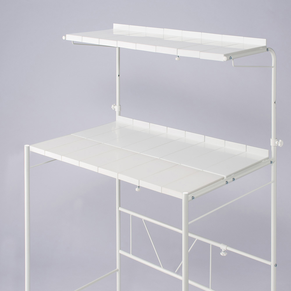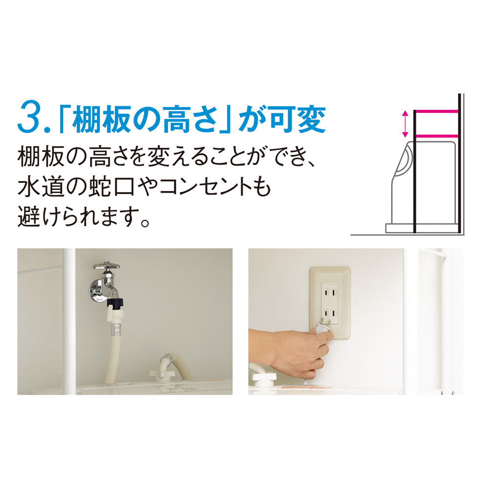 段差をまたいでも無段階で高さ調整ができるので女性でも手が届きやすい洗濯機上ラックが実現します。※写真は棚3段タイプです。