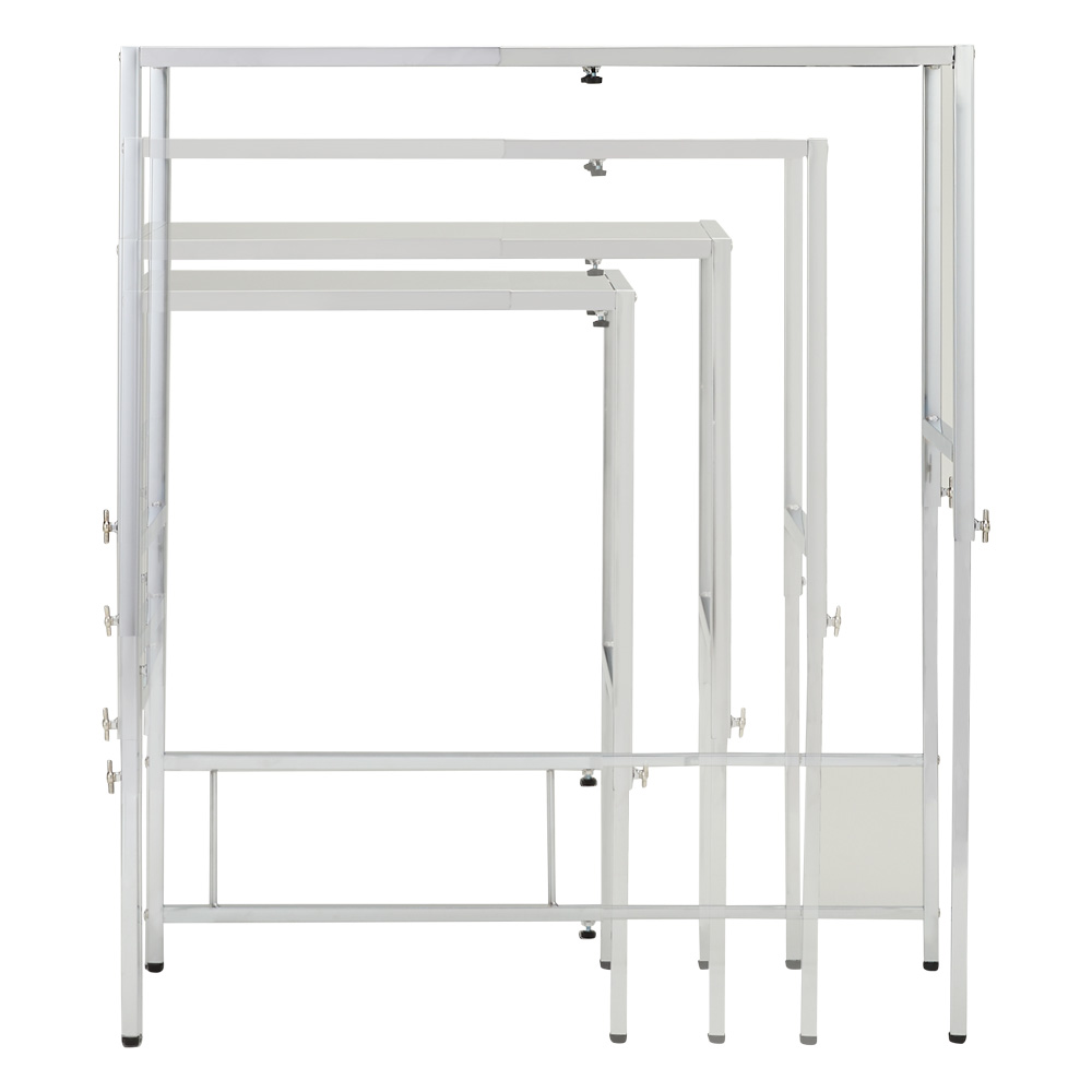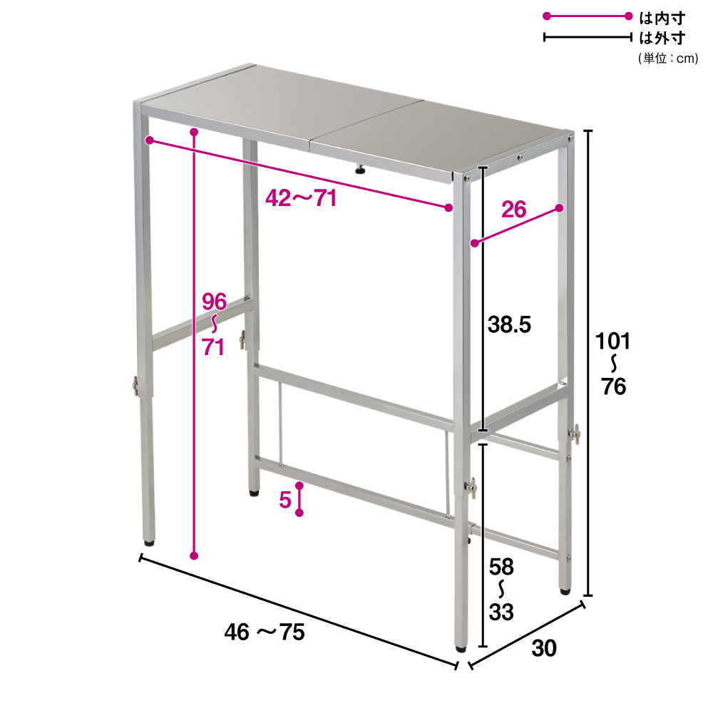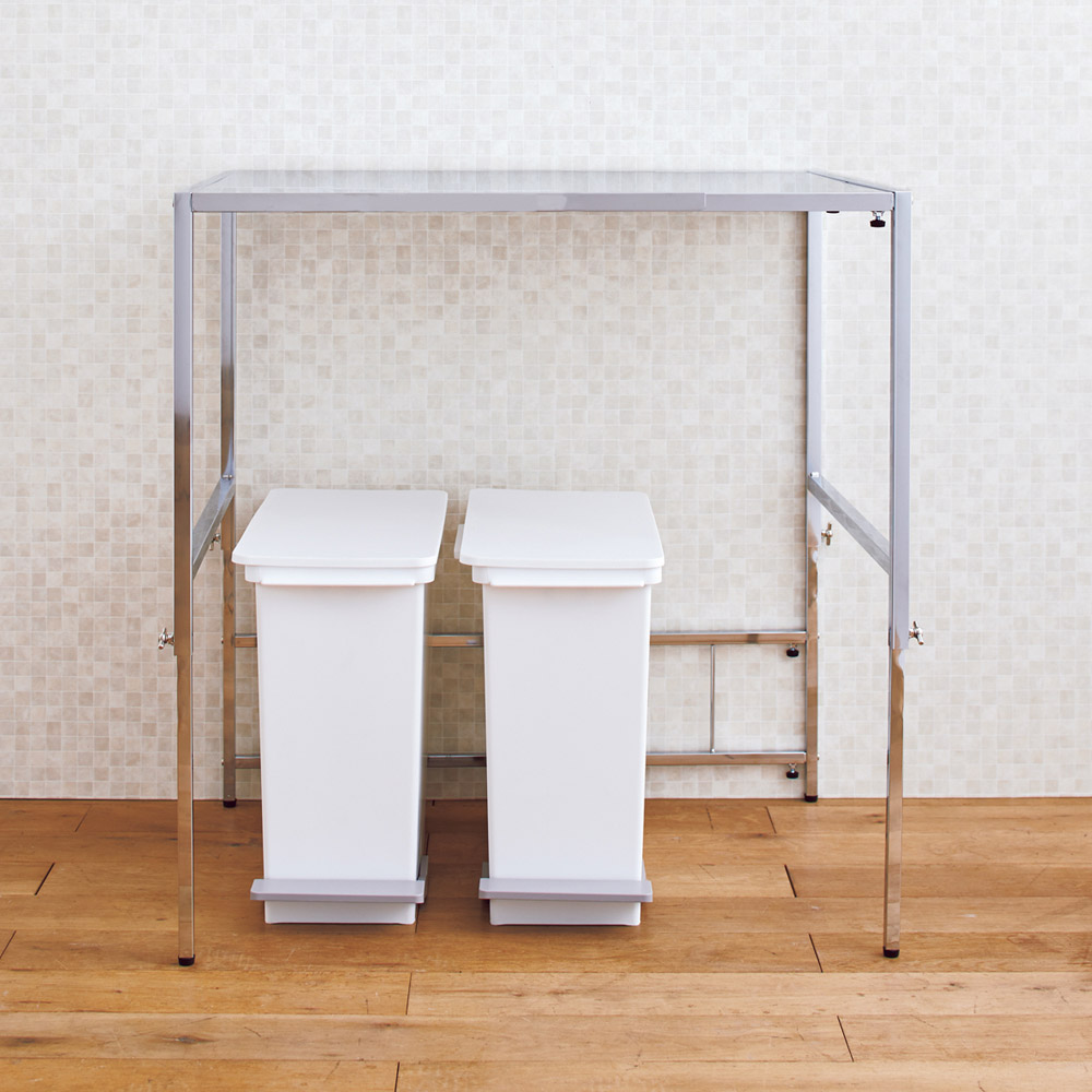 シンク脇や台所のすき間に便利な作業台をプラス。幅&高さが伸縮可能でスペースにぴったり。清潔さが続くステンレス製で、調理のしやすさが格段にアップ!幅46〜75cm 奥行45cmタイプ幅と高さが調節可能!キッチンのすき間に便利な作業台シンク脇などキッチンの空きスペースが便利な作業台に。高さと幅が伸縮するので、ご自宅のキッチンのサイズにぴったり合わせて調整できます。清潔さが続くステンレス製だから、調理後の片付けもラク。幅46〜75cmタイプキッチンのスペースに合わせ、幅は46〜75cmの間で自由に調節可能です。奥行は30cm・45cm・60cmからお選びください。幅30〜45cmタイプ、幅76〜120cmタイプもございます。左:幅調節部、右:高さ調節部幅・高さを調節してピッタリ設置幅は対応範囲内で無段階に調節できます。天板の高さは5cm間隔で6段階(高さ76〜101cm)に調節できます。ゴミ箱上のスペースを活用作業台下のスペースは、ダストボックスの指定席に。飲料・食品ストックの上に場所をとりがちな飲料のストックもすっぽり。お米などのストック場所としても有効活用できます。キッチンのサブテーブルに作業台の前に椅子を設置すれば、レシピの確認や下ごしらえも座りながら楽にできます。清潔さが続くステンレス天板天板は汚れに強く、サビにくく臭いもつきにくいステンレス製。調理後の片付けも汚れをサッと拭くだけと楽ちんです。幅46〜75cm 奥行30cmタイプ薄型なので通路やドア横に設置しても邪魔になりません。幅70cm高さ86cmに設定幅46〜75cm 奥行45cmタイプキッチンカウンターやシンク横に並べて使用するのにちょうどよいサイズ。幅45cm高さ91cmに設定幅30〜45cm 奥行60cmタイプシンクや冷蔵庫の横に。たっぷりの奥行で毎日の調理もはかどります。お子様がお手伝いしたり、パートナーと一緒に料理する際にも便利なアイテムです。