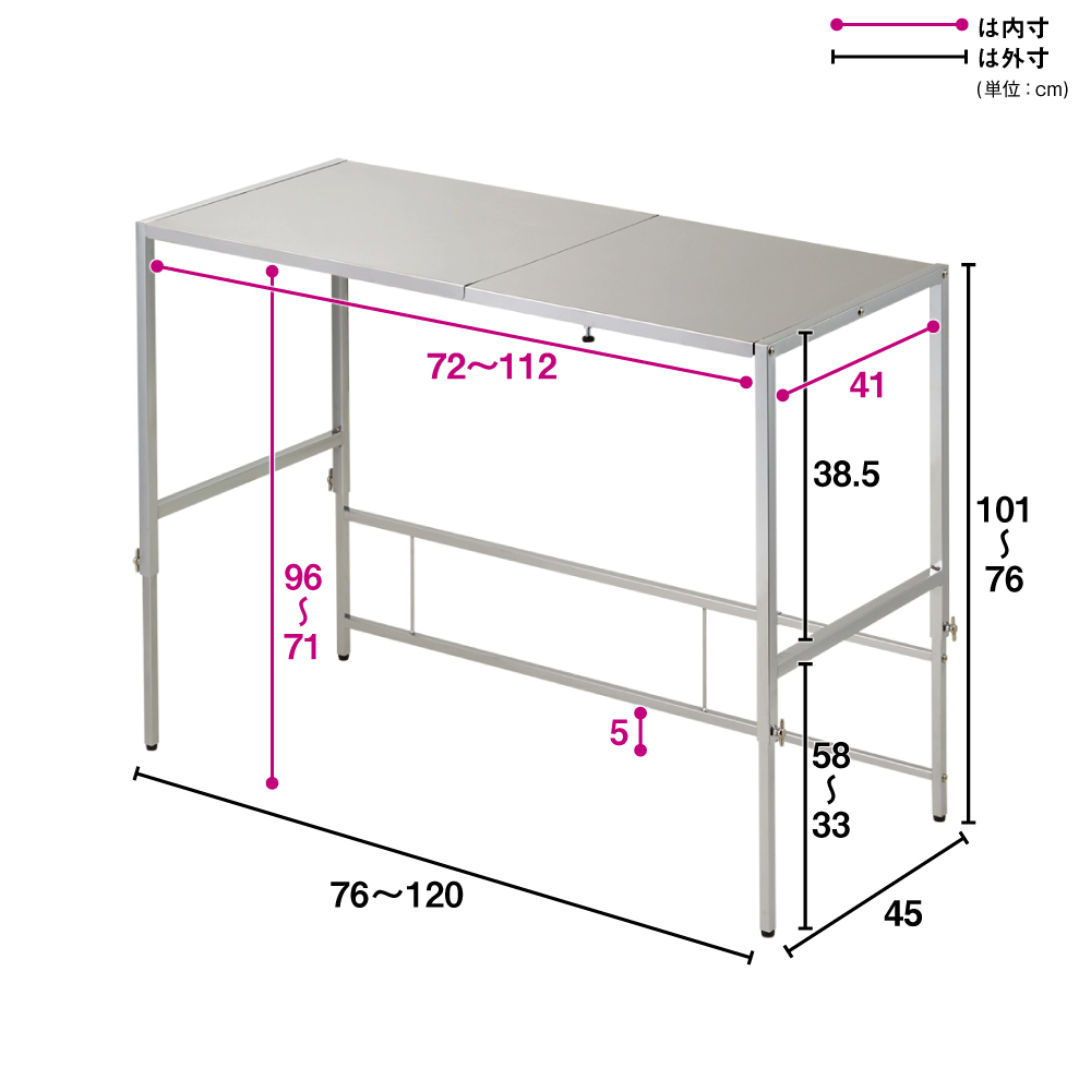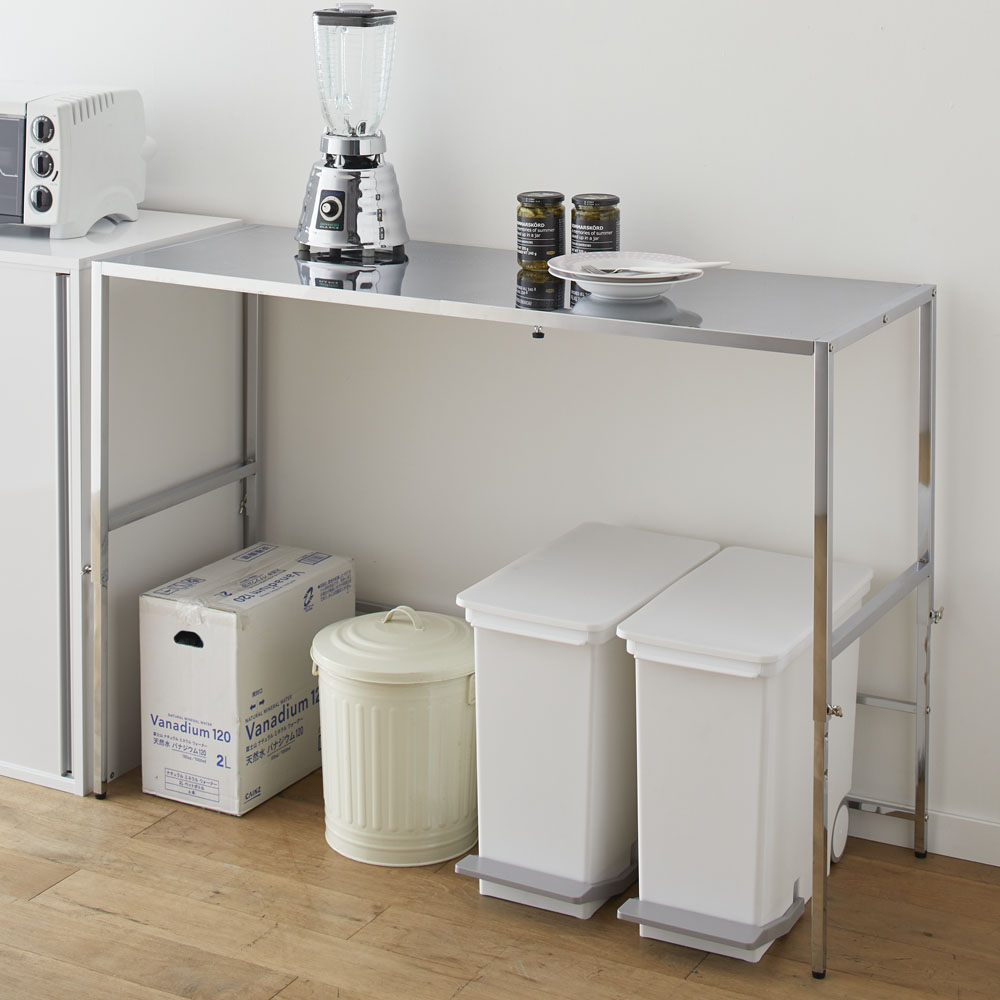シンク脇や台所のすき間に便利な作業台をプラス。幅&高さが伸縮可能でスペースにぴったり。清潔さが続くステンレス製で、調理のしやすさが格段にアップ!幅76〜120cm 奥行60cmタイプ幅と高さが調節可能!キッチンのすき間に便利な作業台シンク脇などキッチンの空きスペースが便利な作業台に。高さと幅が伸縮するので、ご自宅のキッチンのサイズにぴったり合わせて調整できます。清潔さが続くステンレス製だから、調理後の片付けもラク。幅76〜120cmタイプキッチンのスペースに合わせ、幅は76〜120cmの間で自由に調節可能です。奥行は30cm・45cm・60cmからお選びください。幅30〜45cmタイプ、幅46〜75cmタイプもございます。左:幅調節部、右:高さ調節部幅・高さを調節してピッタリ設置幅は対応範囲内で無段階に調節できます。天板の高さは5cm間隔で6段階(高さ76〜101cm)に調節できます。ゴミ箱上のスペースを活用作業台下のスペースは、ダストボックスの指定席に。飲料・食品ストックの上に場所をとりがちな飲料のストックもすっぽり。お米などのストック場所としても有効活用できます。キッチンのサブテーブルに作業台の前に椅子を設置すれば、レシピの確認や下ごしらえも座りながら楽にできます。清潔さが続くステンレス天板天板は汚れに強く、サビにくく臭いもつきにくいステンレス製。調理後の片付けも汚れをサッと拭くだけと楽ちんです。幅76〜120cm 奥行30cmタイプ薄型なので通路やドア横に設置しても邪魔になりません。幅76〜120cm 奥行45cmタイプキッチンカウンターやシンク横に並べて使用するのにちょうどよいサイズ。幅100cm高さ86cmに設定幅76〜120cm 奥行60cmタイプシンクや冷蔵庫の横に。たっぷりの奥行で毎日の調理もはかどります。お子様がお手伝いしたり、パートナーと一緒に料理する際にも便利なアイテムです。