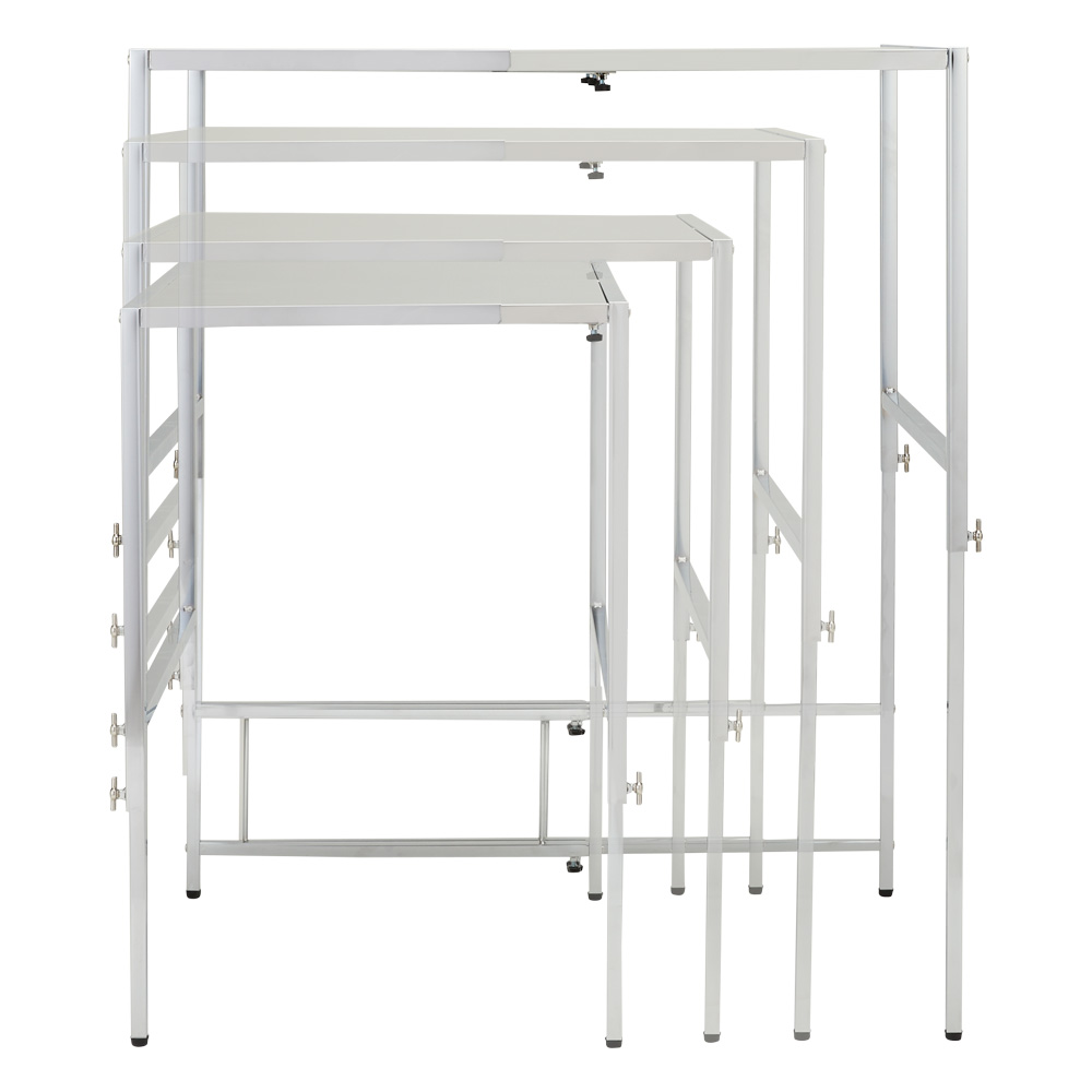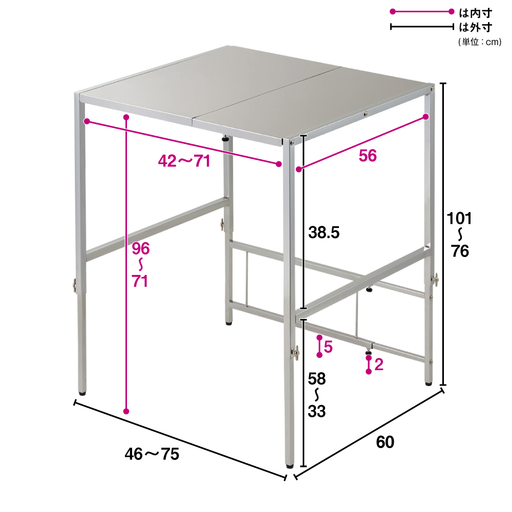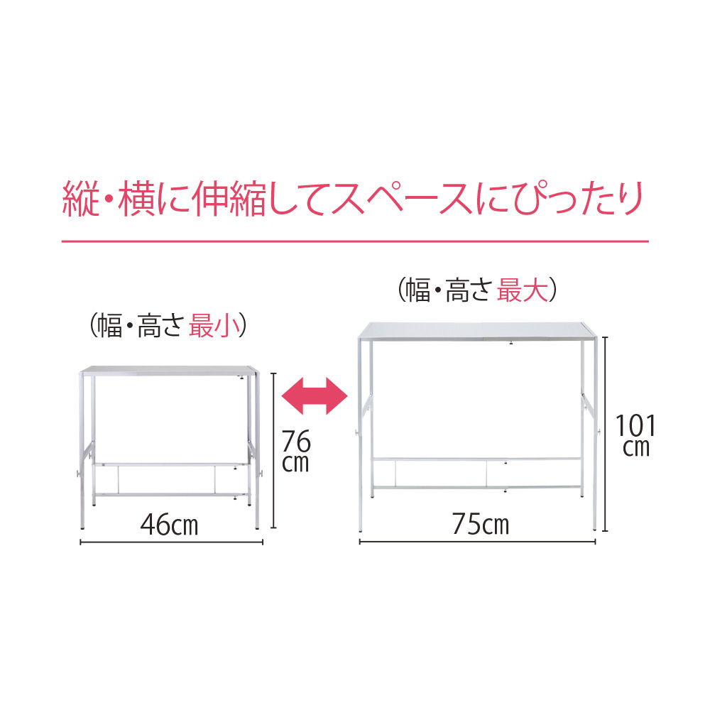 シンク脇や台所のすき間に便利な作業台をプラス。幅&高さが伸縮可能でスペースにぴったり。清潔さが続くステンレス製で、調理のしやすさが格段にアップ!幅46〜75cm 奥行45cmタイプ幅と高さが調節可能!キッチンのすき間に便利な作業台シンク脇などキッチンの空きスペースが便利な作業台に。高さと幅が伸縮するので、ご自宅のキッチンのサイズにぴったり合わせて調整できます。清潔さが続くステンレス製だから、調理後の片付けもラク。幅46〜75cmタイプキッチンのスペースに合わせ、幅は46〜75cmの間で自由に調節可能です。奥行は30cm・45cm・60cmからお選びください。幅30〜45cmタイプ、幅76〜120cmタイプもございます。左:幅調節部、右:高さ調節部幅・高さを調節してピッタリ設置幅は対応範囲内で無段階に調節できます。天板の高さは5cm間隔で6段階(高さ76〜101cm)に調節できます。ゴミ箱上のスペースを活用作業台下のスペースは、ダストボックスの指定席に。飲料・食品ストックの上に場所をとりがちな飲料のストックもすっぽり。お米などのストック場所としても有効活用できます。キッチンのサブテーブルに作業台の前に椅子を設置すれば、レシピの確認や下ごしらえも座りながら楽にできます。清潔さが続くステンレス天板天板は汚れに強く、サビにくく臭いもつきにくいステンレス製。調理後の片付けも汚れをサッと拭くだけと楽ちんです。幅46〜75cm 奥行30cmタイプ薄型なので通路やドア横に設置しても邪魔になりません。幅70cm高さ86cmに設定幅46〜75cm 奥行45cmタイプキッチンカウンターやシンク横に並べて使用するのにちょうどよいサイズ。幅45cm高さ91cmに設定幅30〜45cm 奥行60cmタイプシンクや冷蔵庫の横に。たっぷりの奥行で毎日の調理もはかどります。お子様がお手伝いしたり、パートナーと一緒に料理する際にも便利なアイテムです。
